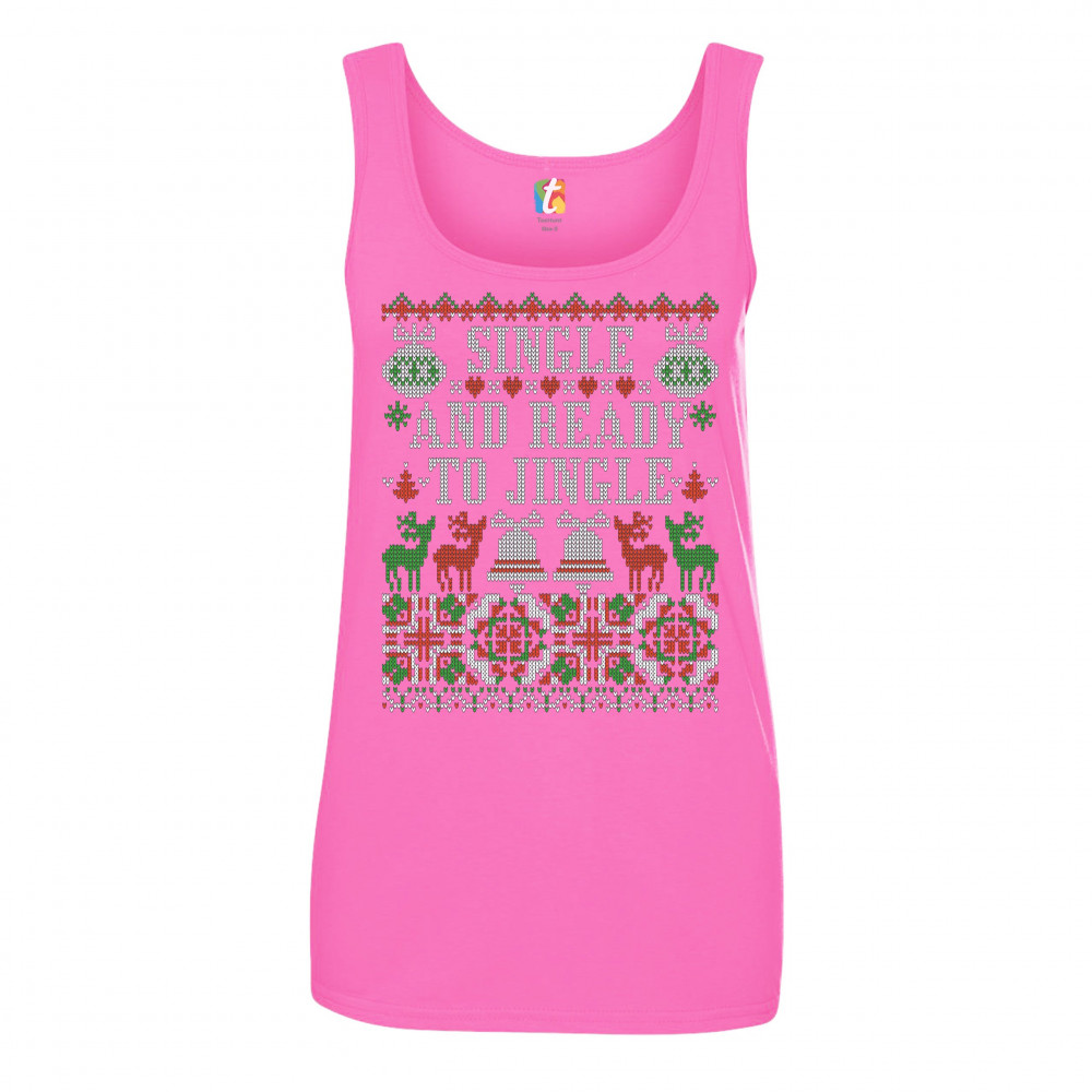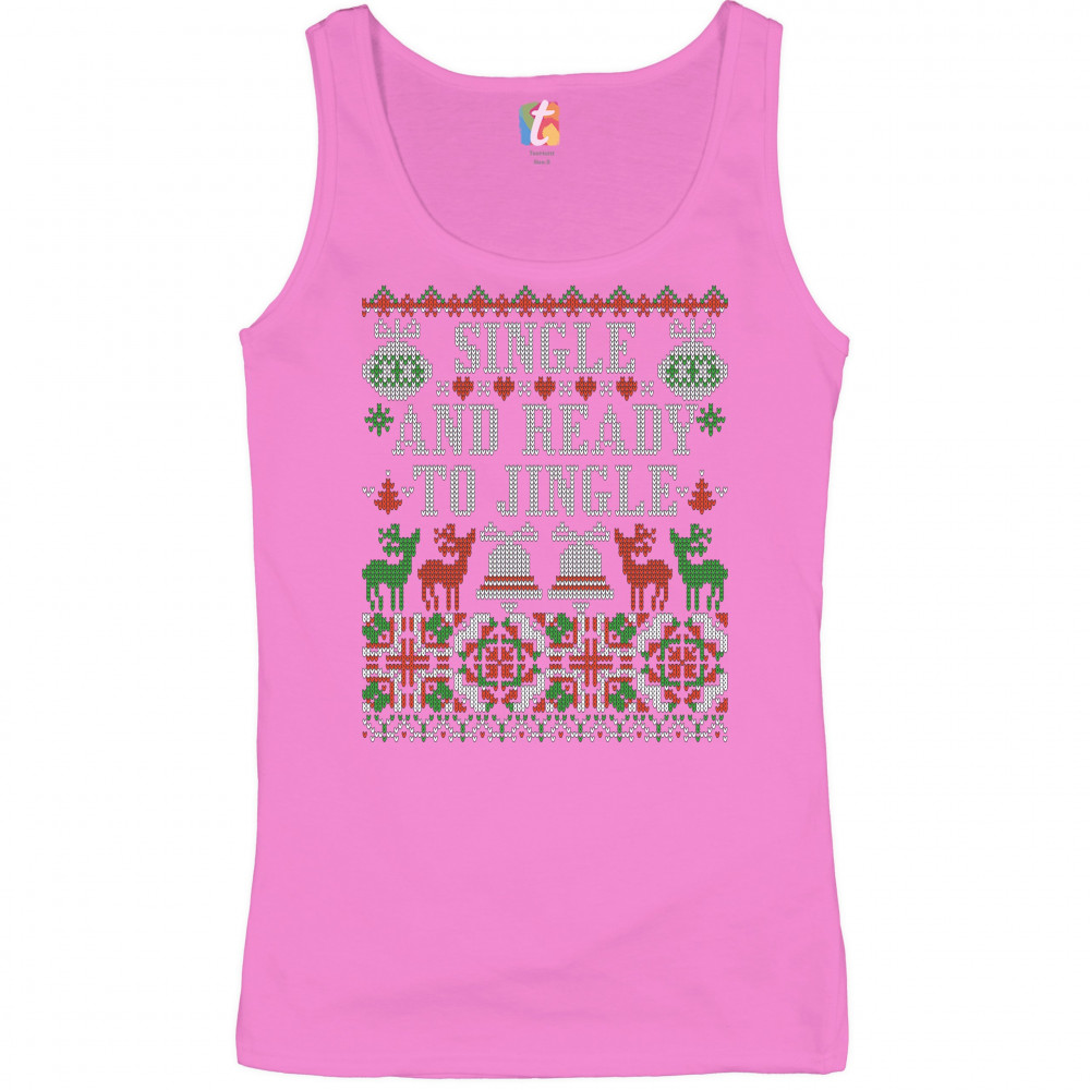 A print saying: "Single and Ready to Jingle" and featuring four reindeers and two Christmas bells. The print is designed as an ugly sweater. Amazing choice for a single person who wants to make people smile and spread positive vibes on Christmas Eve.