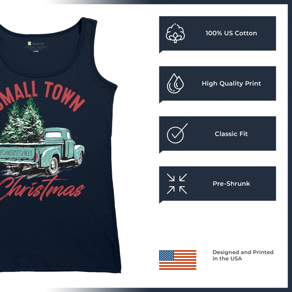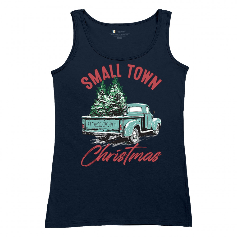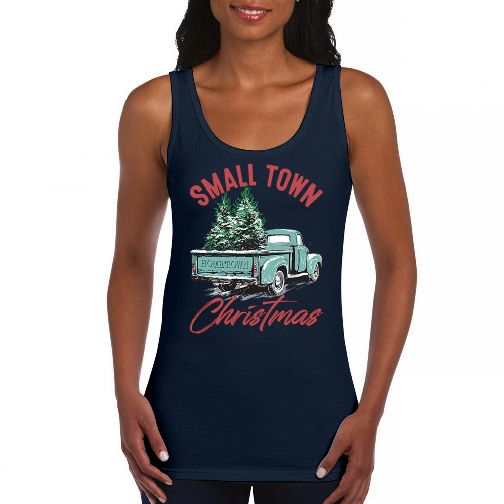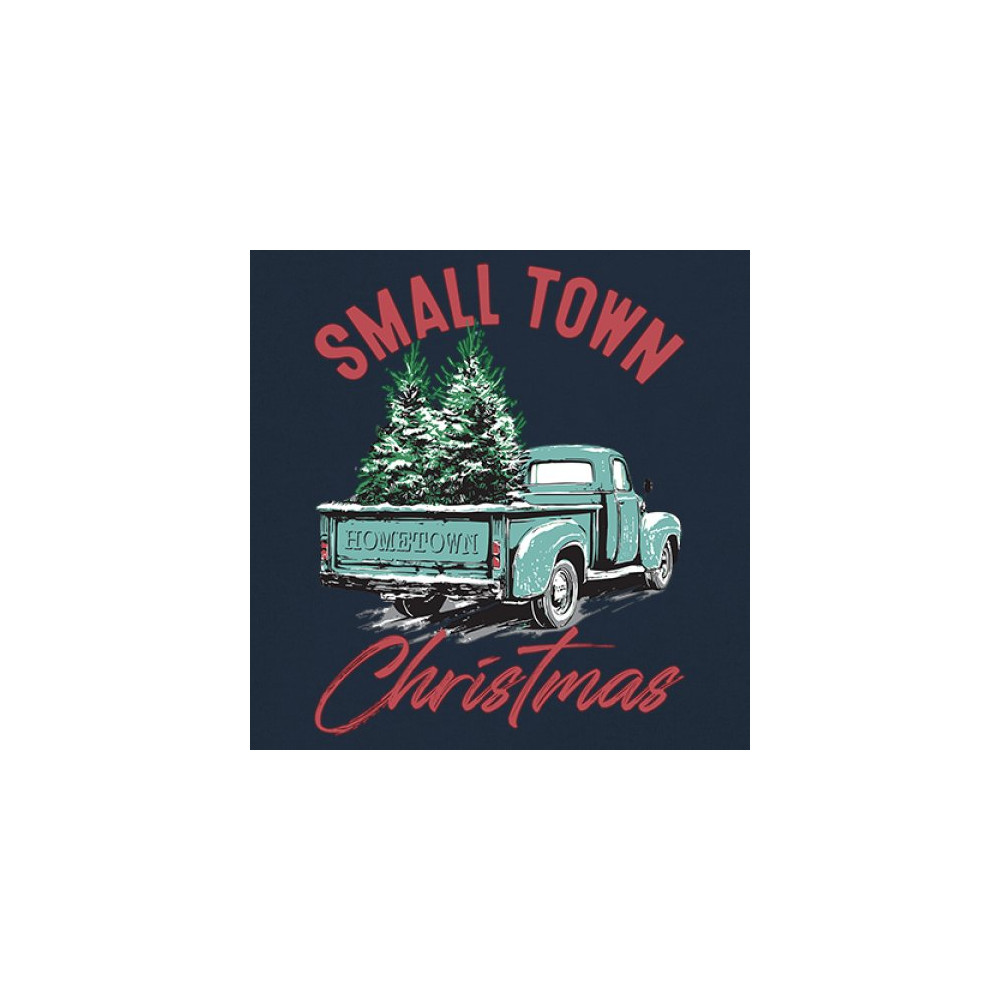 Embrace holiday nostalgia with this "Small Town Christmas" design featuring a vintage truck and Christmas trees. Perfect for rustic decor lovers.