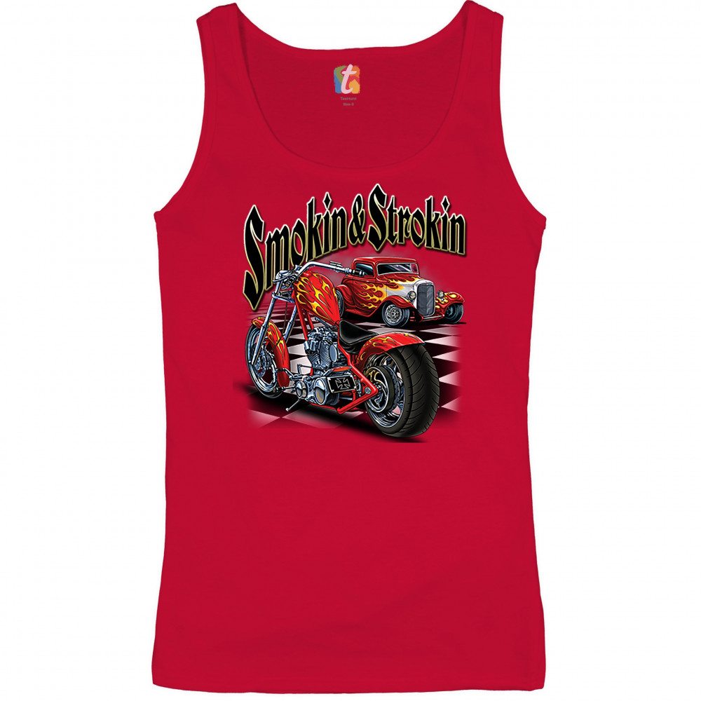 A print featuring a hot rod and a chopper motorcycle standing on a chess board, both covered with flame paint jobs. The print says: "Smoking & Strokin". A great choice for a fan of customized American classic cars, hot rods and motorcycles.