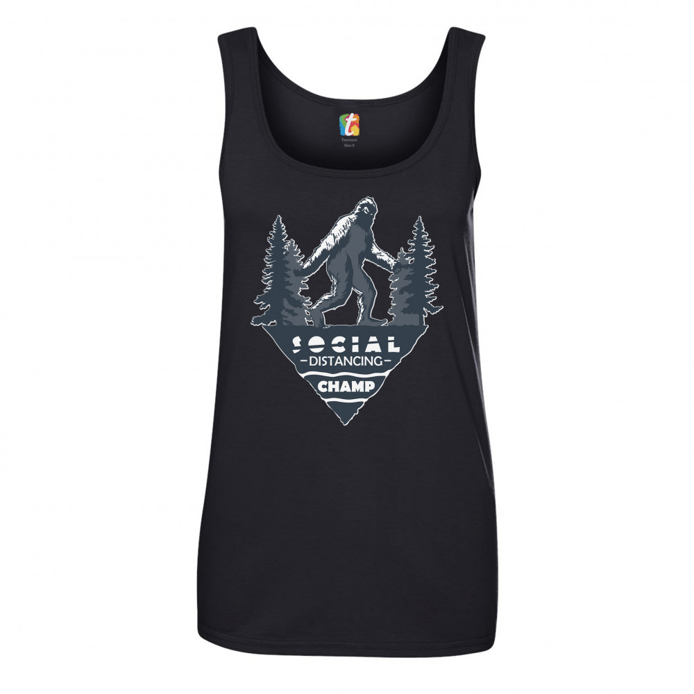 SOCIAL DISTANCING CHAMP women's tank top funny bigfoot yeti virus quarantine black