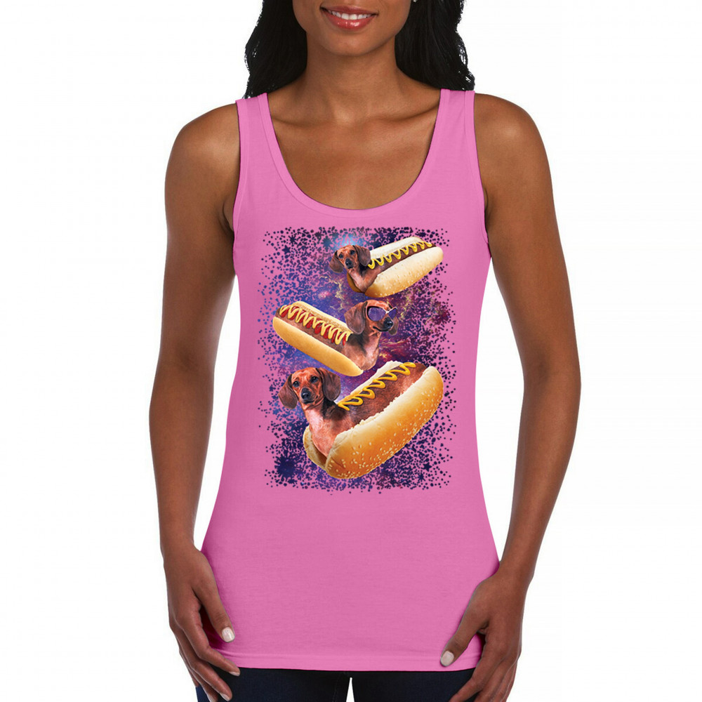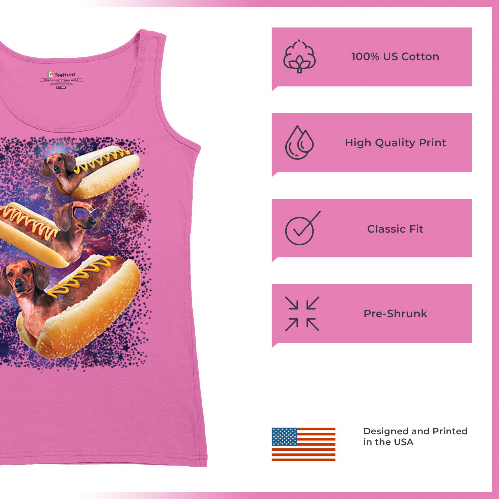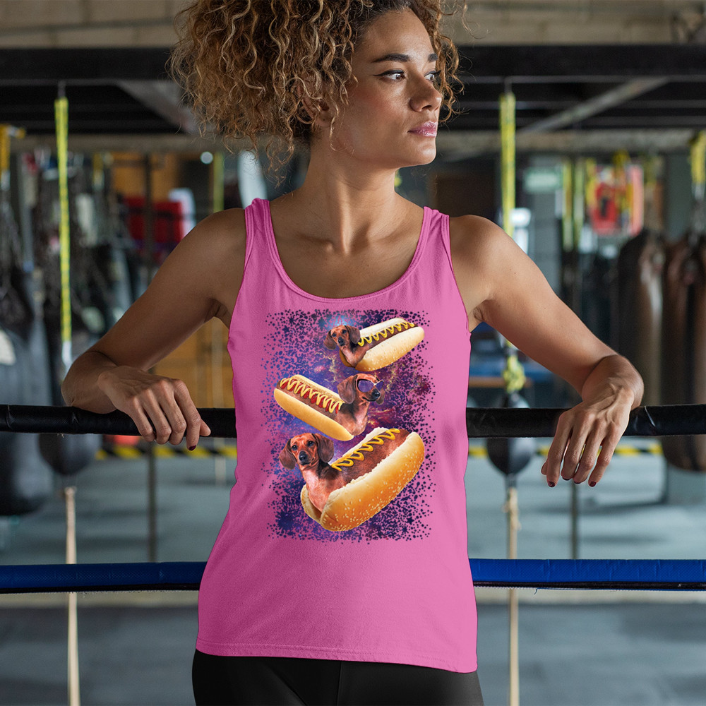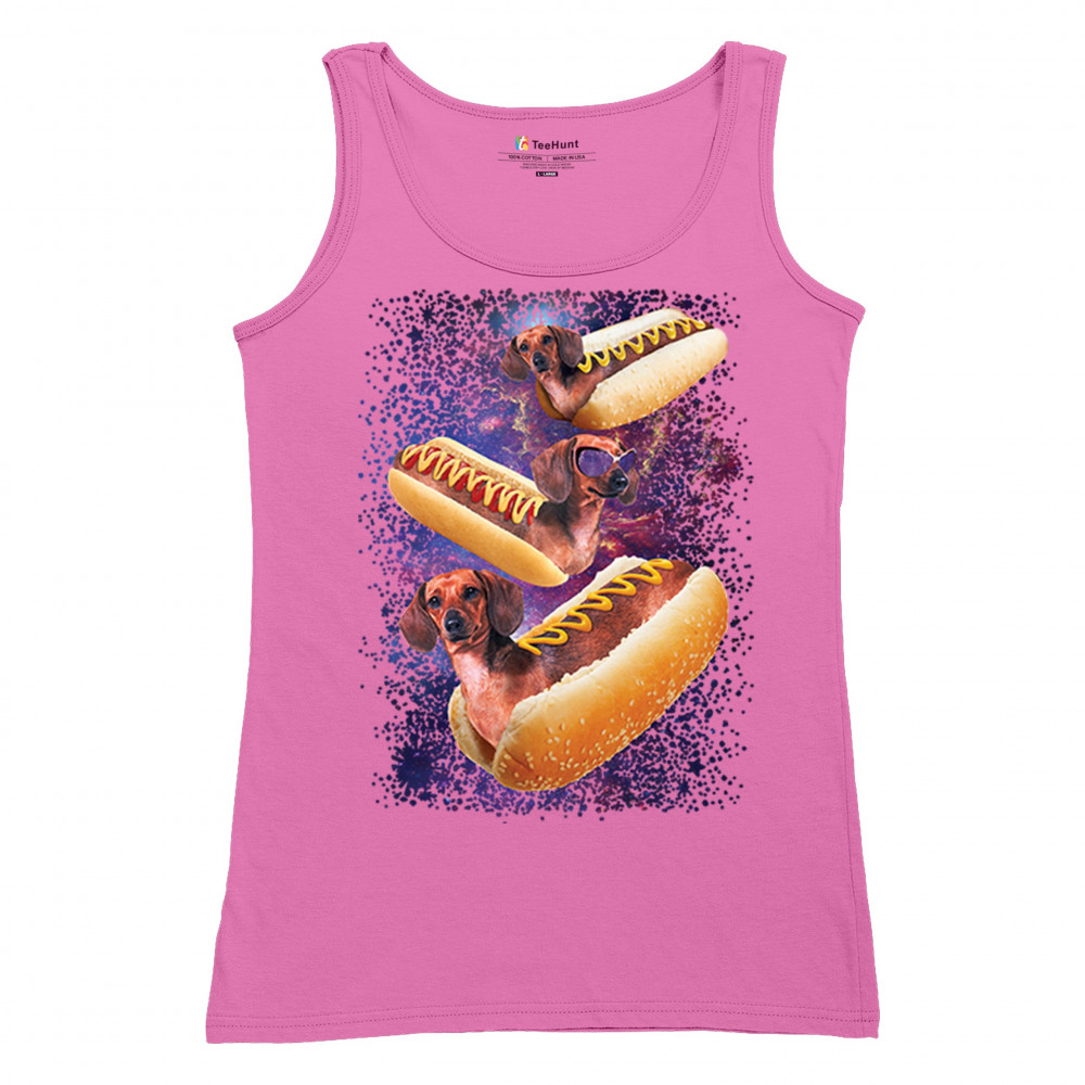 Quirky and fun tee featuring dachshunds as hotdogs in a cosmic setting. Perfect for dog and space lovers. Comfortable and durable.