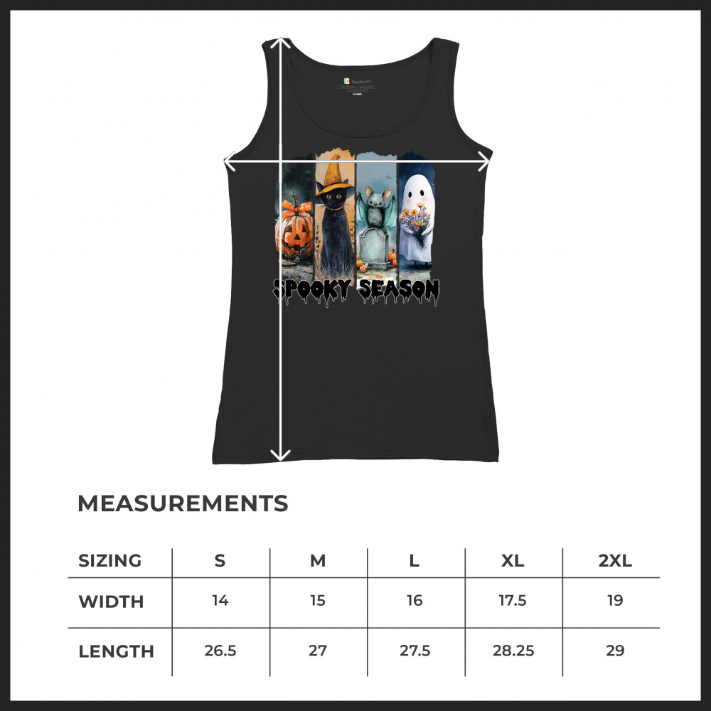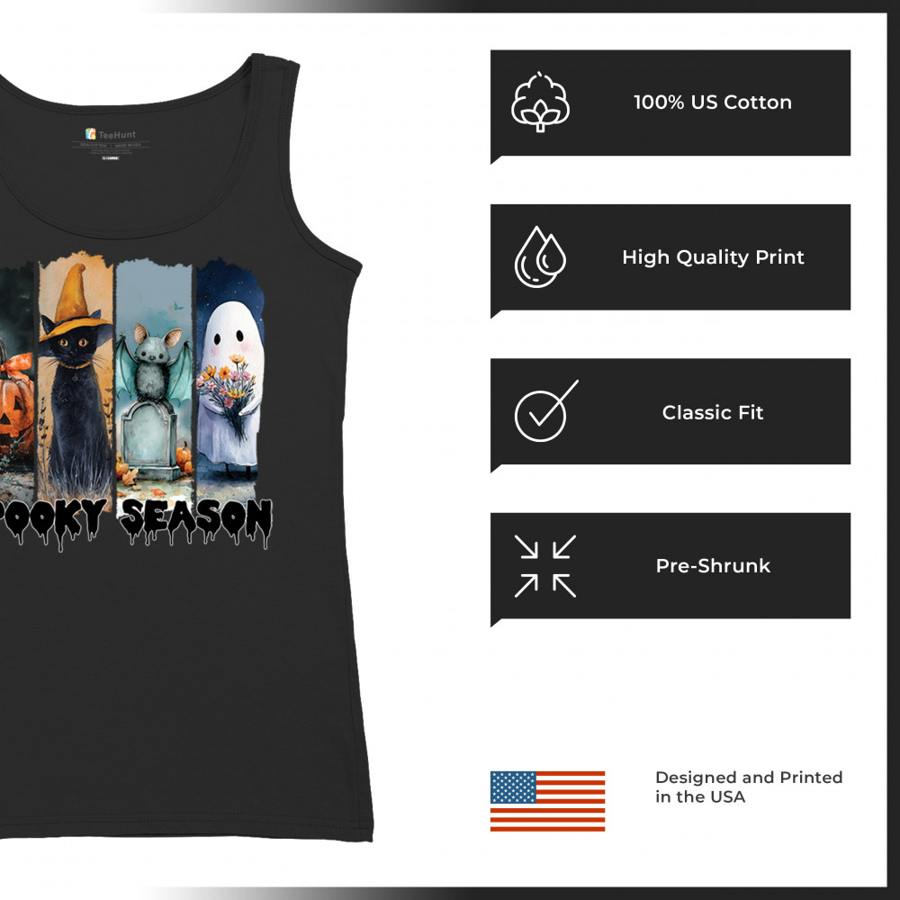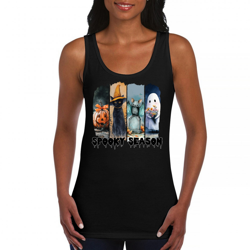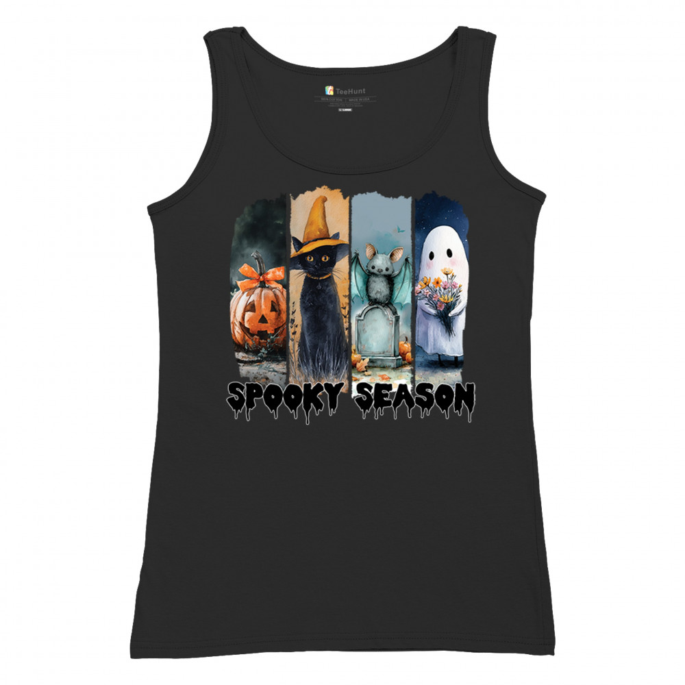 Spooky Season design with scary black cat, jack o lantern, haunted ghost house, and cute ghost. Perfect for October 31, trick or treat, and fall fun.