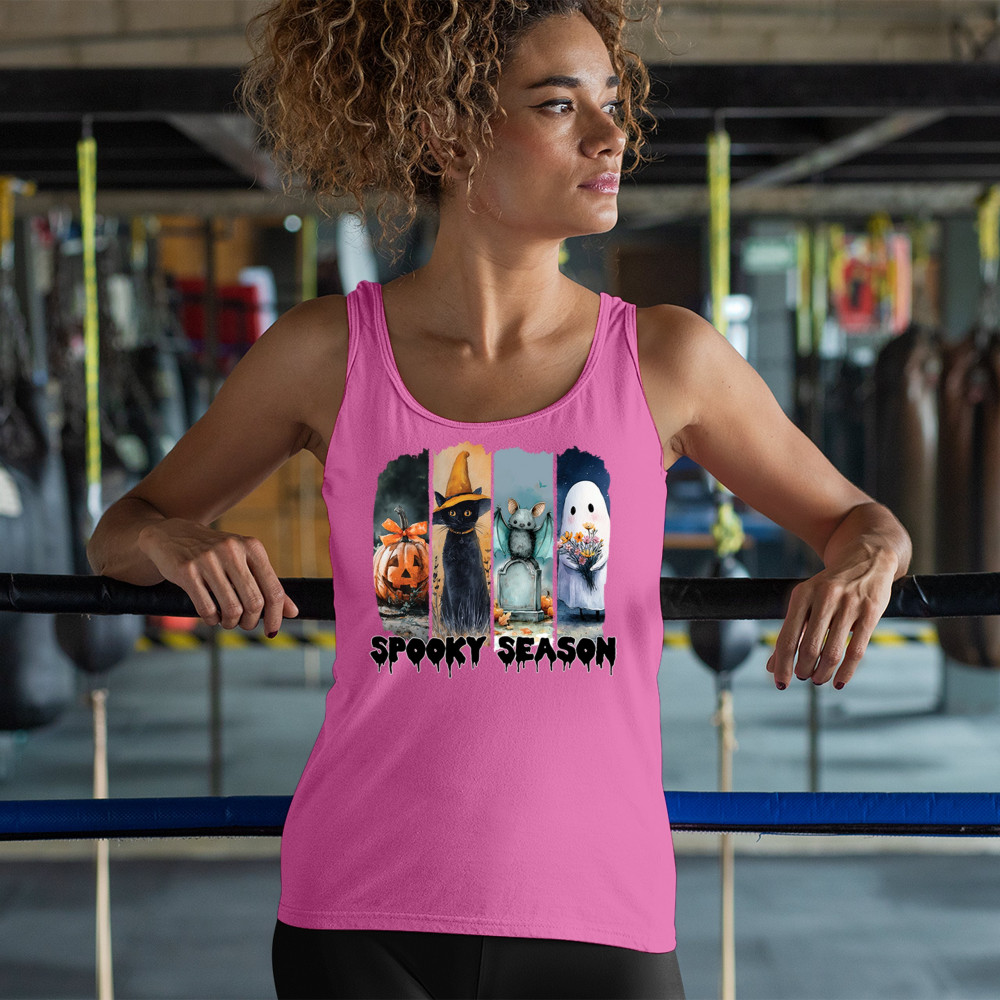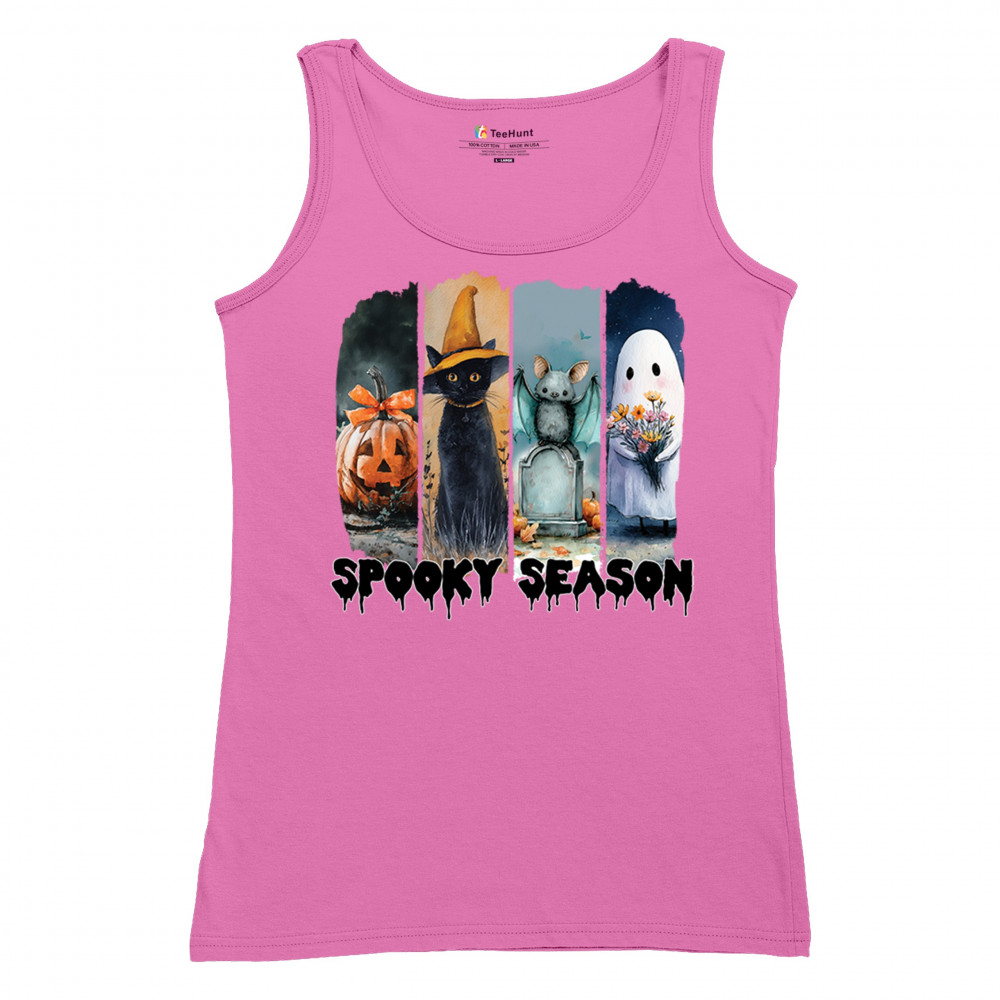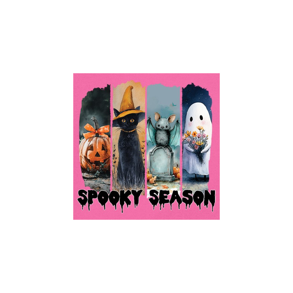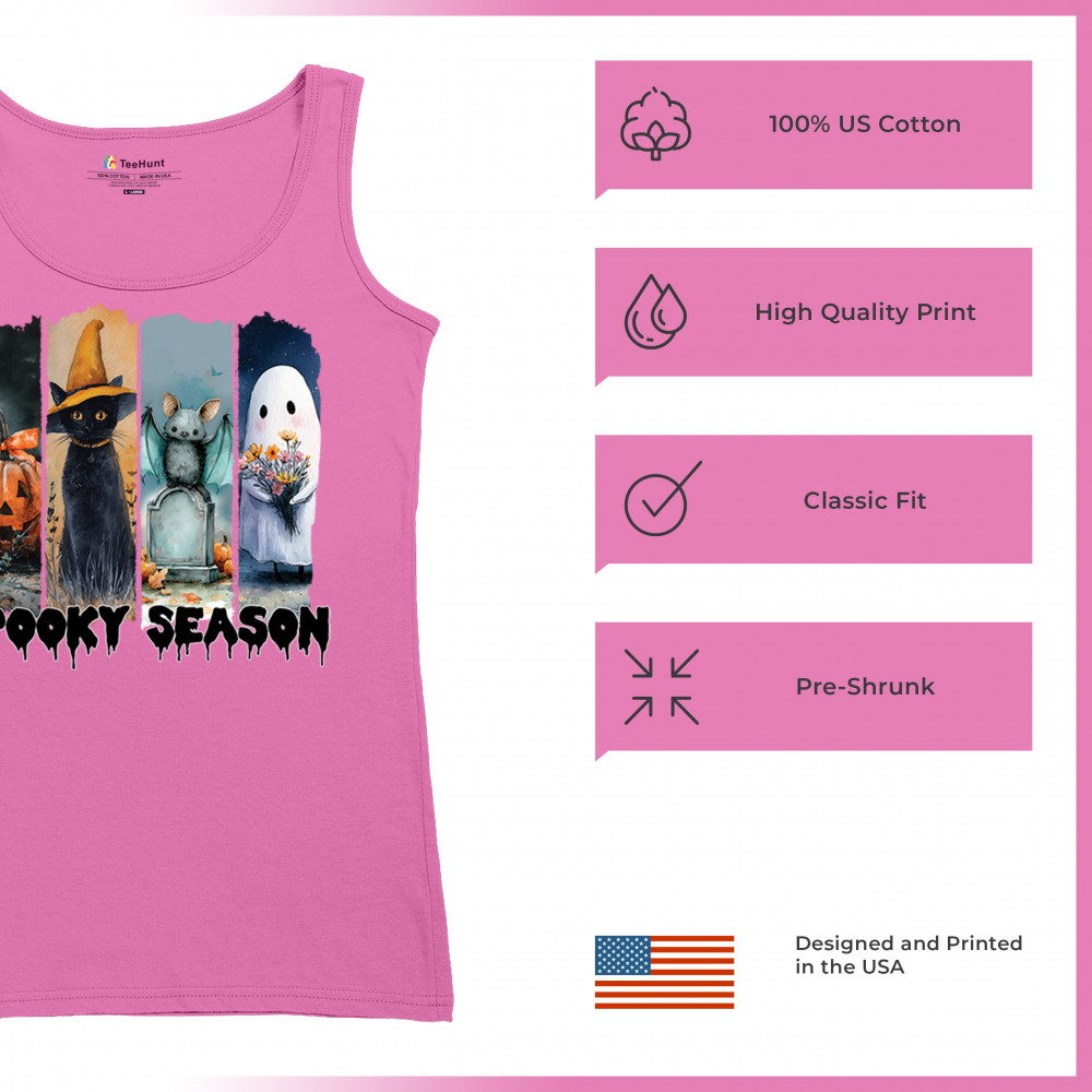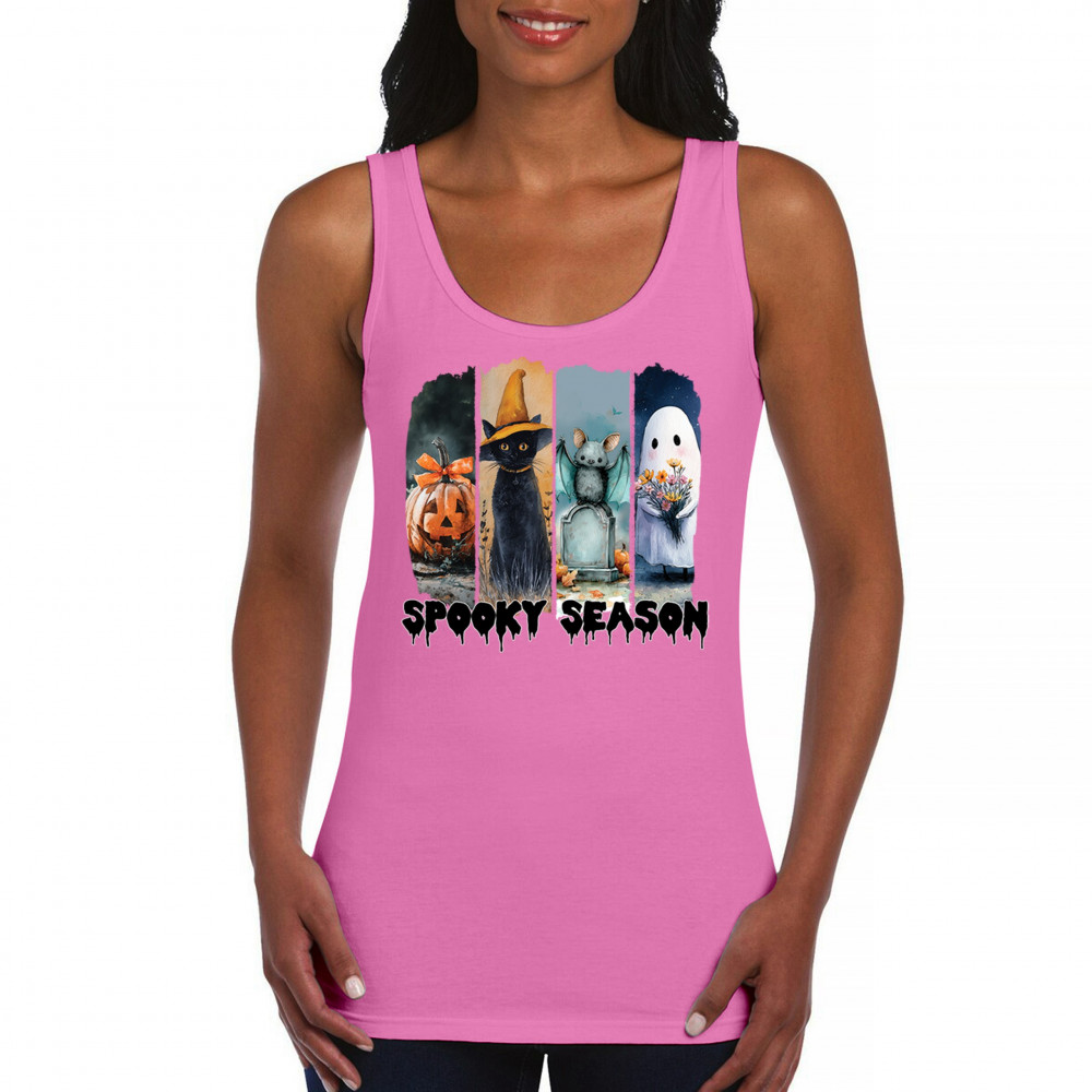 Spooky Season design with scary black cat, jack o lantern, haunted ghost house, and cute ghost. Perfect for October 31, trick or treat, and fall fun.