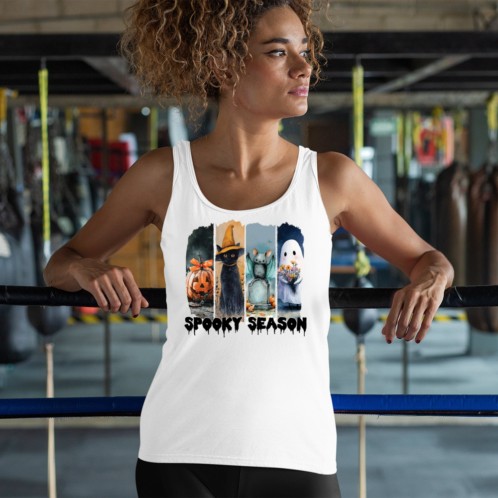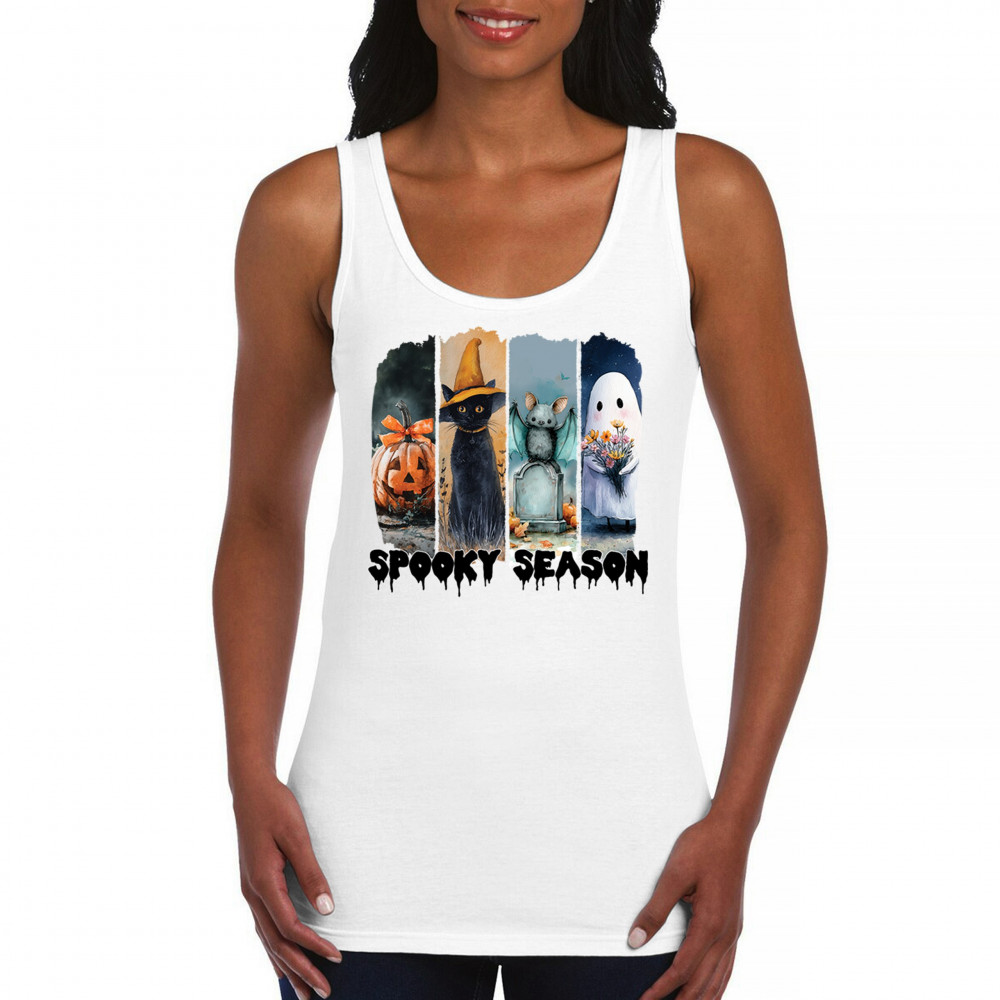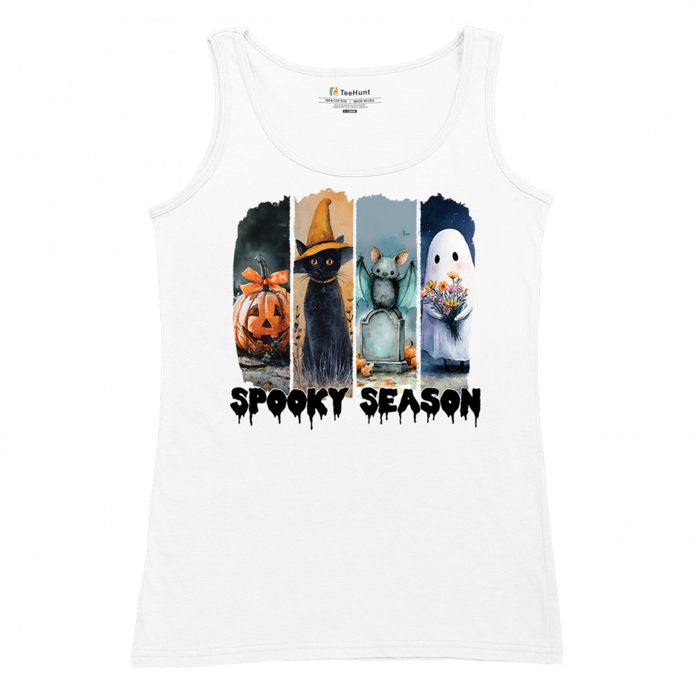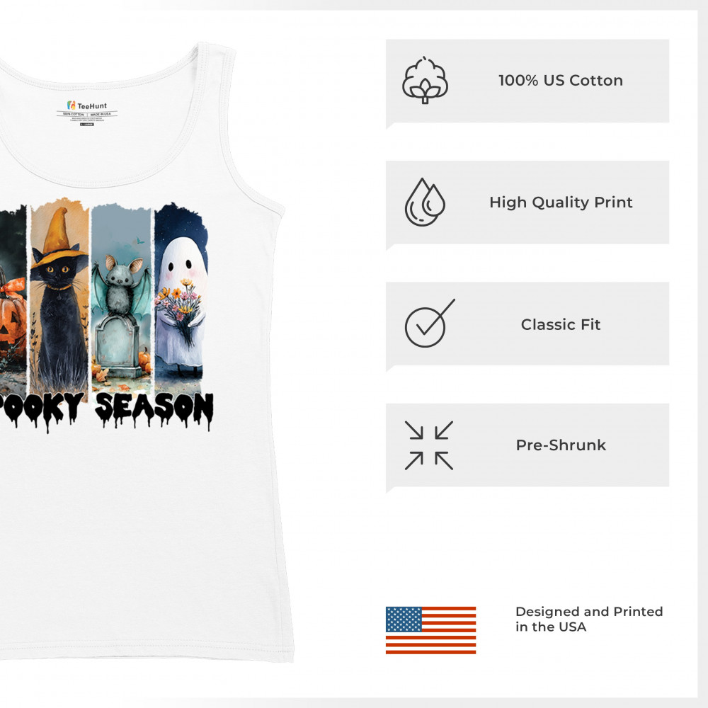 Spooky Season design with scary black cat, jack o lantern, haunted ghost house, and cute ghost. Perfect for October 31, trick or treat, and fall fun.