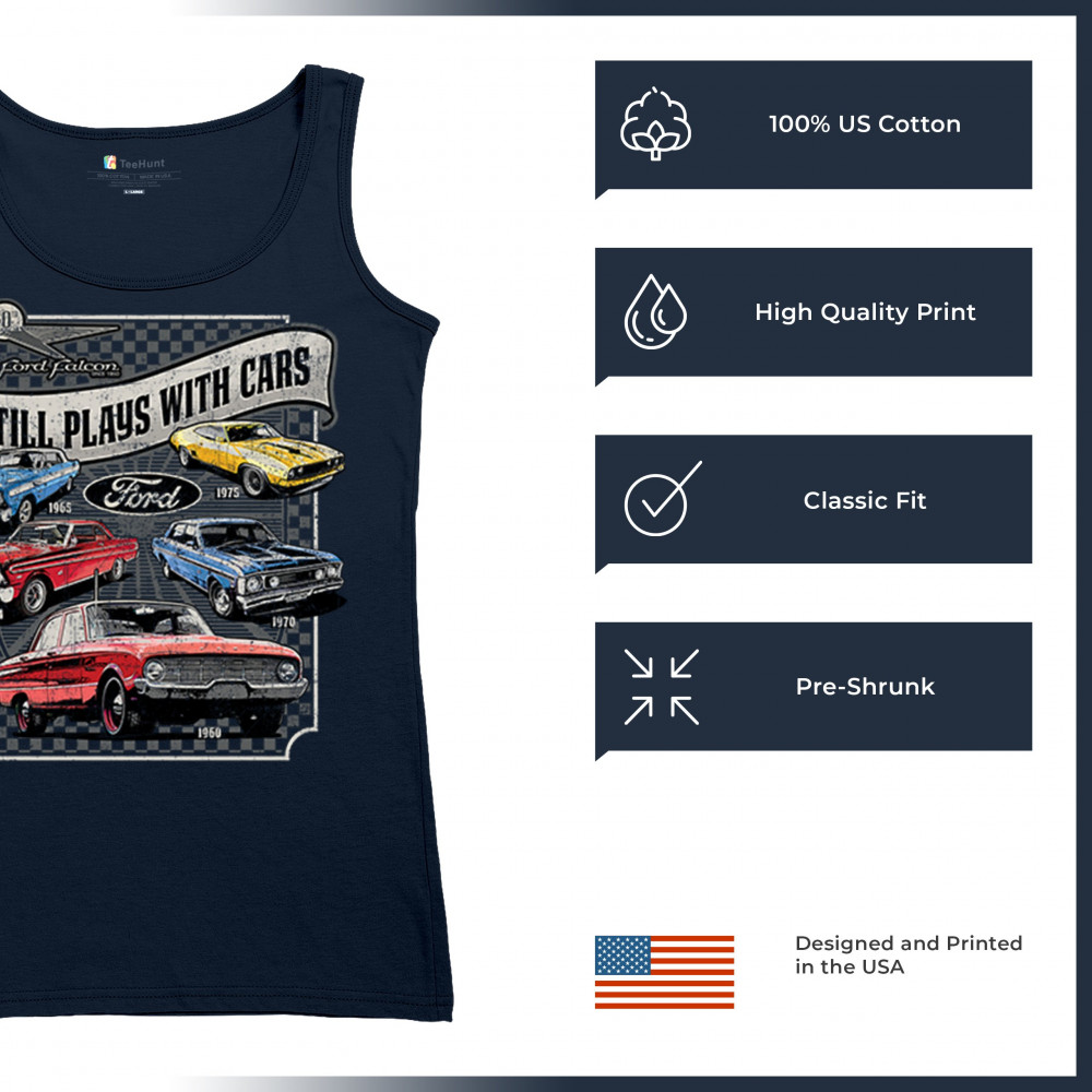 Still Plays With Cars pays tribute to the Ford Falcon, showcasing legendary models from the 60s and 70s for true vintage car lovers. Perfect for gearheads, hot rod fans, and classic car collectors, this design celebrates retro automobile culture, vintage horsepower, and old school rides. A great value piece for anyone devoted to the classic car scene.