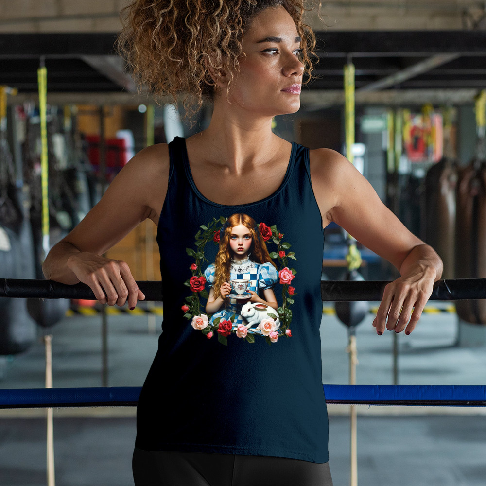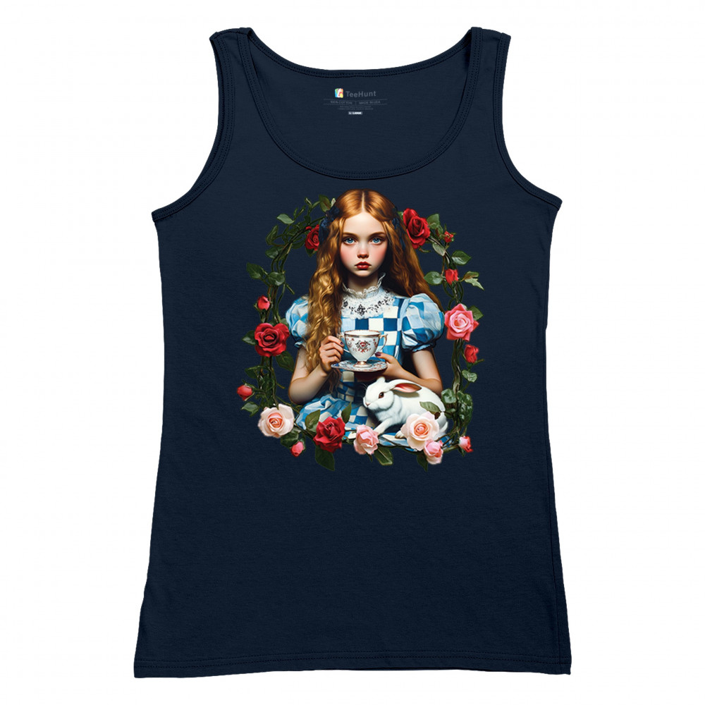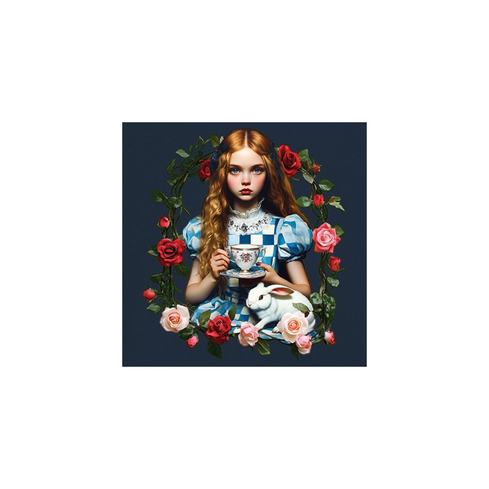 Step into a storybook dream with this Wonderland-inspired design featuring a young girl at a tea party with her white rabbit companion. Framed by roses, it evokes vintage charm, fantasy, and magical nostalgia. Ideal for bookworms, collectors, and lovers of fairytales, it blends whimsical elegance with timeless childhood wonder.