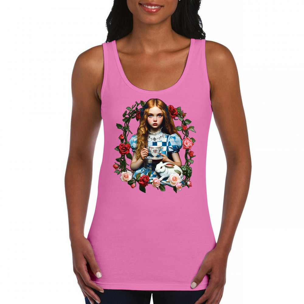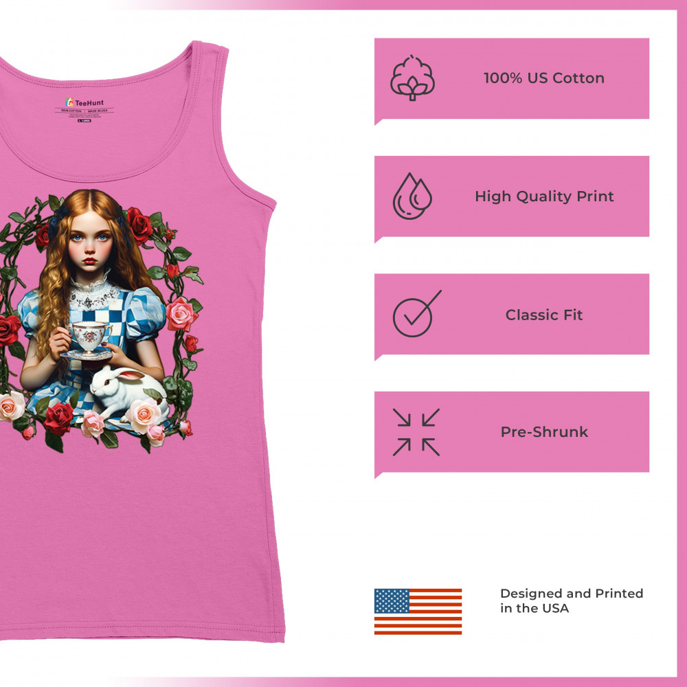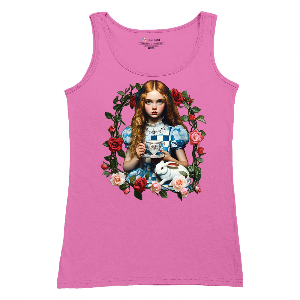 Step into a storybook dream with this Wonderland-inspired design featuring a young girl at a tea party with her white rabbit companion. Framed by roses, it evokes vintage charm, fantasy, and magical nostalgia. Ideal for bookworms, collectors, and lovers of fairytales, it blends whimsical elegance with timeless childhood wonder.