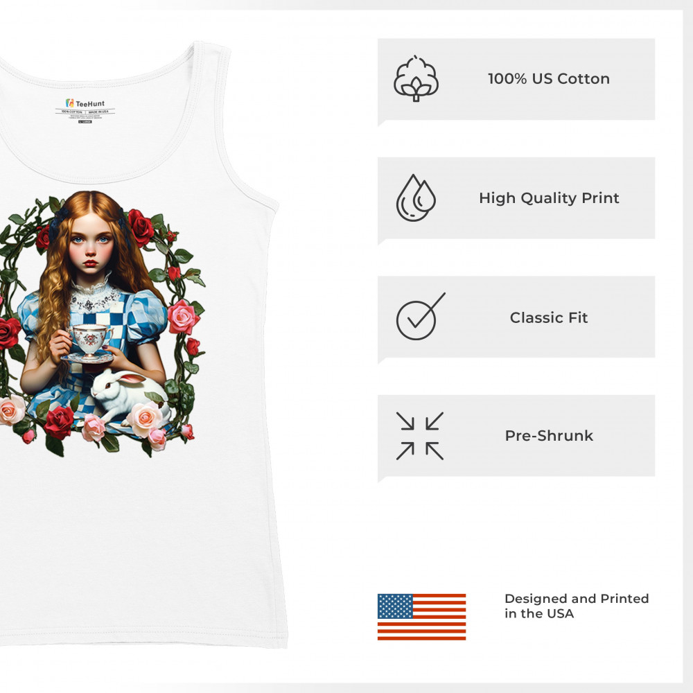 Step into a storybook dream with this Wonderland-inspired design featuring a young girl at a tea party with her white rabbit companion. Framed by roses, it evokes vintage charm, fantasy, and magical nostalgia. Ideal for bookworms, collectors, and lovers of fairytales, it blends whimsical elegance with timeless childhood wonder.