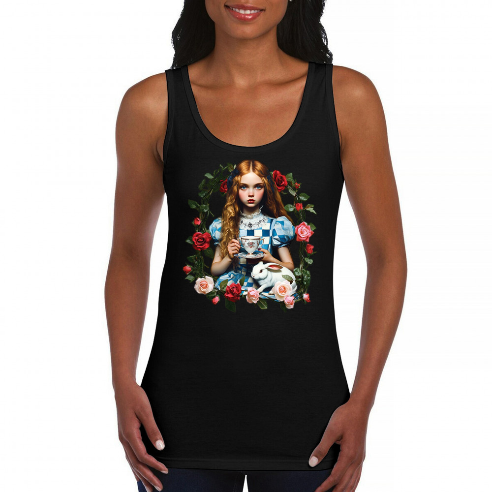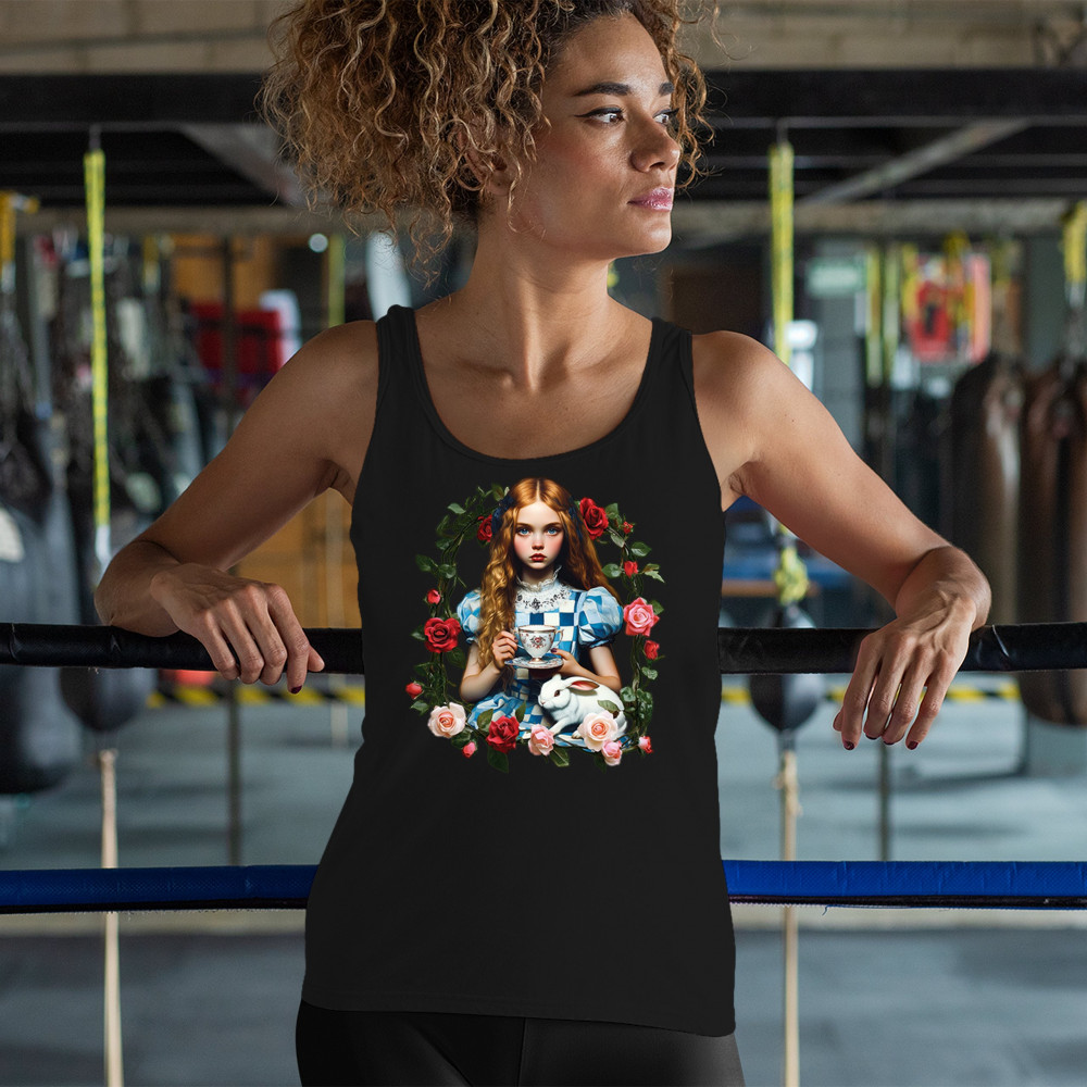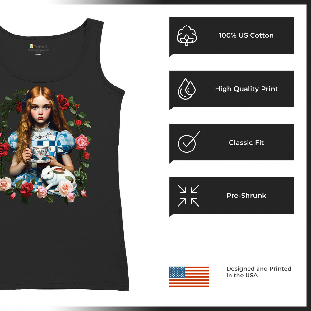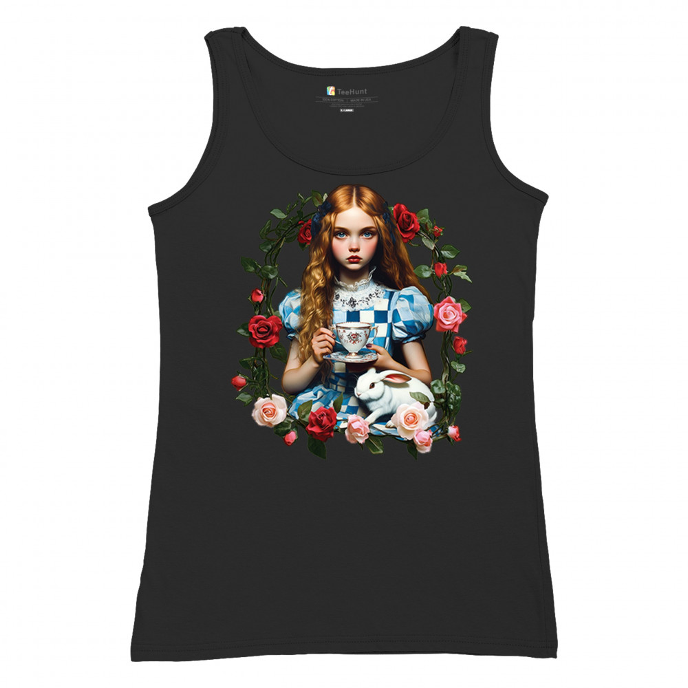 Step into a storybook dream with this Wonderland-inspired design featuring a young girl at a tea party with her white rabbit companion. Framed by roses, it evokes vintage charm, fantasy, and magical nostalgia. Ideal for bookworms, collectors, and lovers of fairytales, it blends whimsical elegance with timeless childhood wonder.