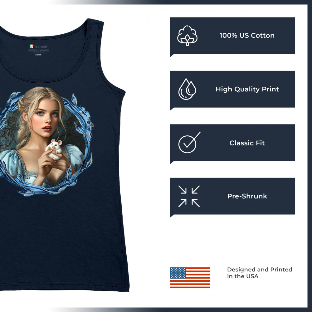 Fairytale design of blonde girl with white mouse in blue leaf frame. Inspired by Cinderella themes of kindness, fantasy, and transformation.