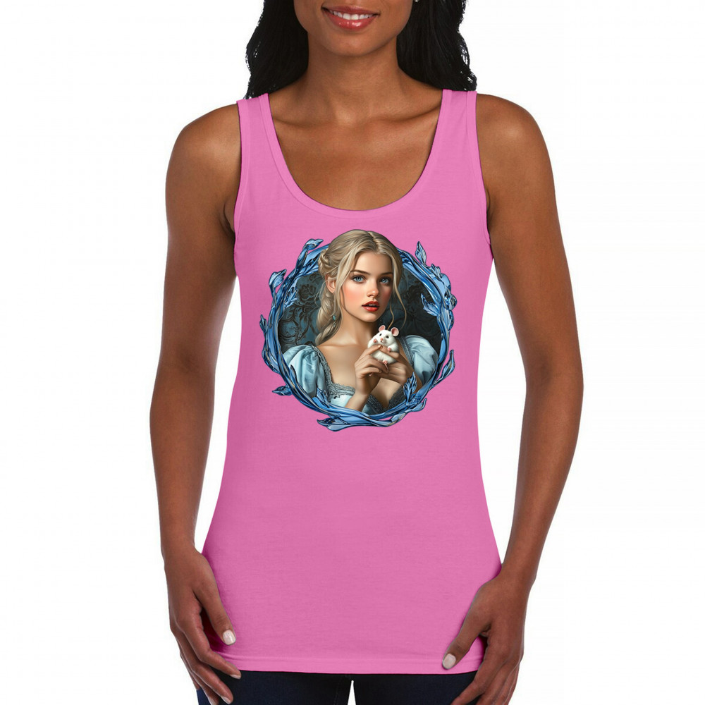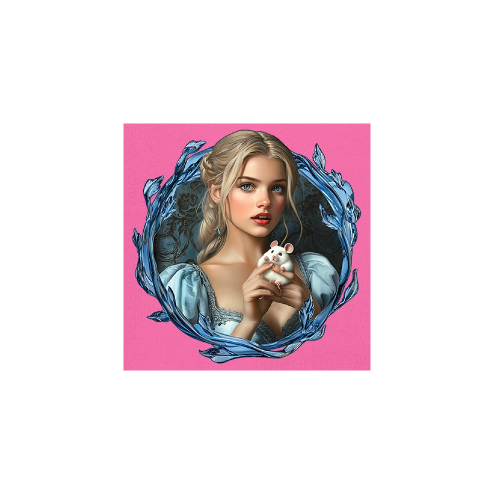 A whimsical design inspired by fairytales and Cinderella magic, featuring a blonde girl in a blue dress holding a white mouse. The icy blue leaf frame evokes enchantment and transformation. With soft, vintage tones and a dreamy feel, it’s a charming tribute to kindness, fantasy, animal companionship, and gentle storytelling magic.