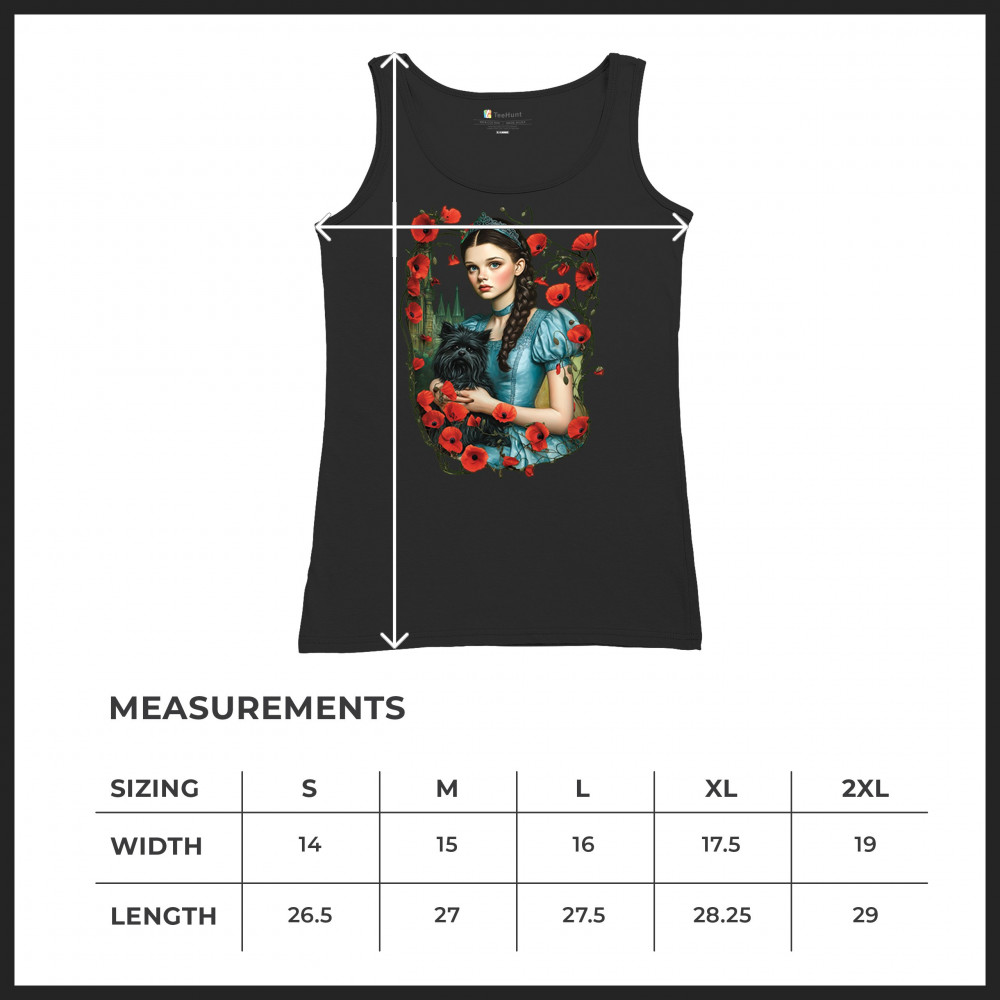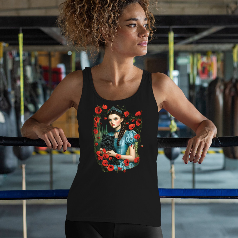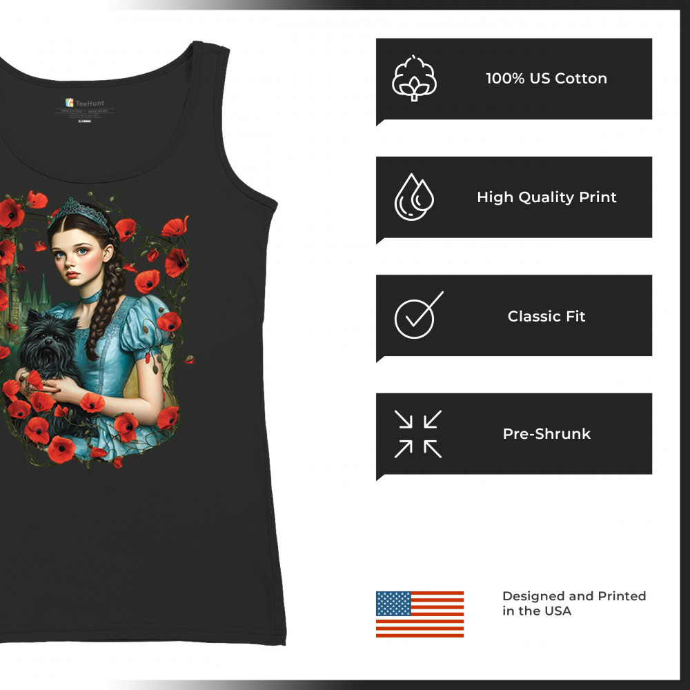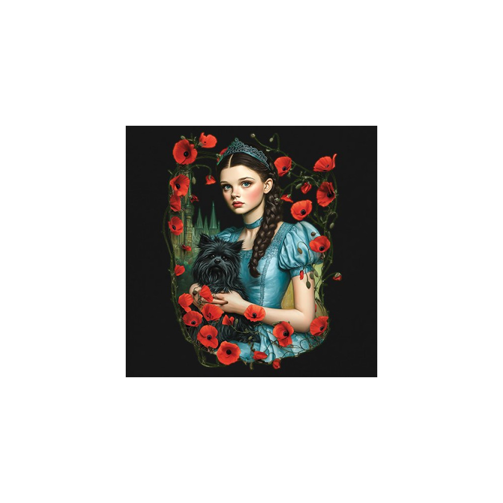 A charming design inspired by dark fairytales, featuring a girl in a blue dress holding her black dog amidst blooming red poppies. A distant castle and vintage styling channel Wizard of Oz fantasy with a gothic twist. Ideal for dreamers, nostalgic collectors, and lovers of whimsical storybook art filled with magic and memory.