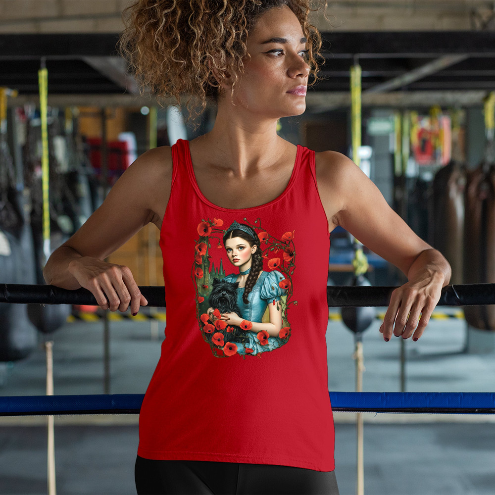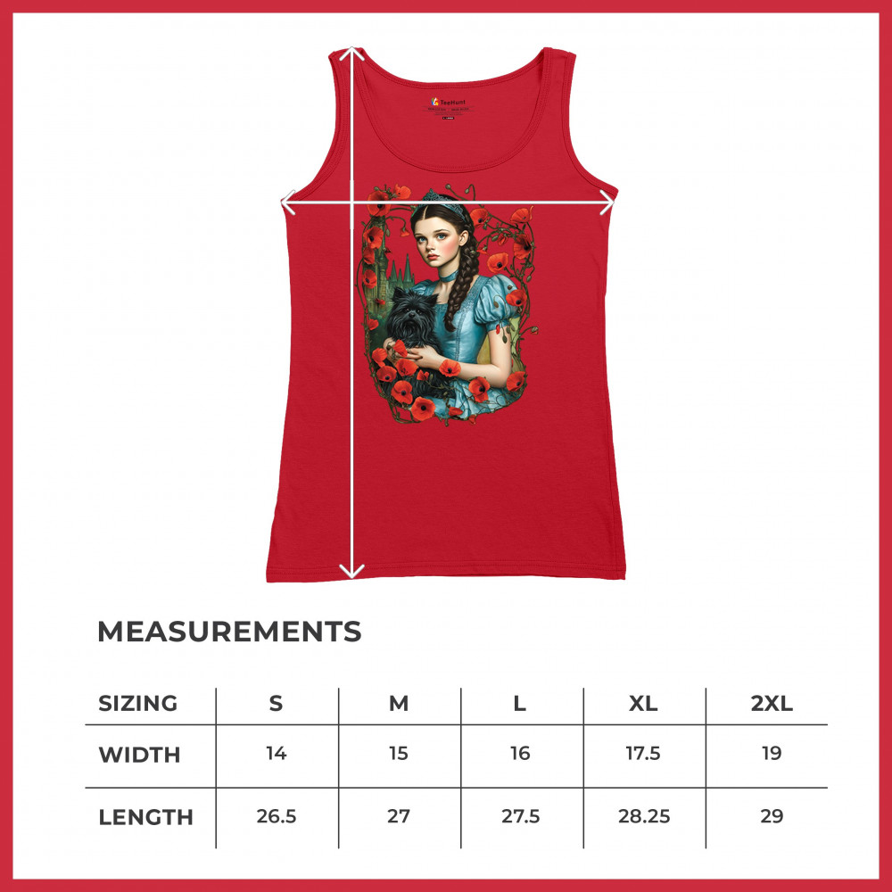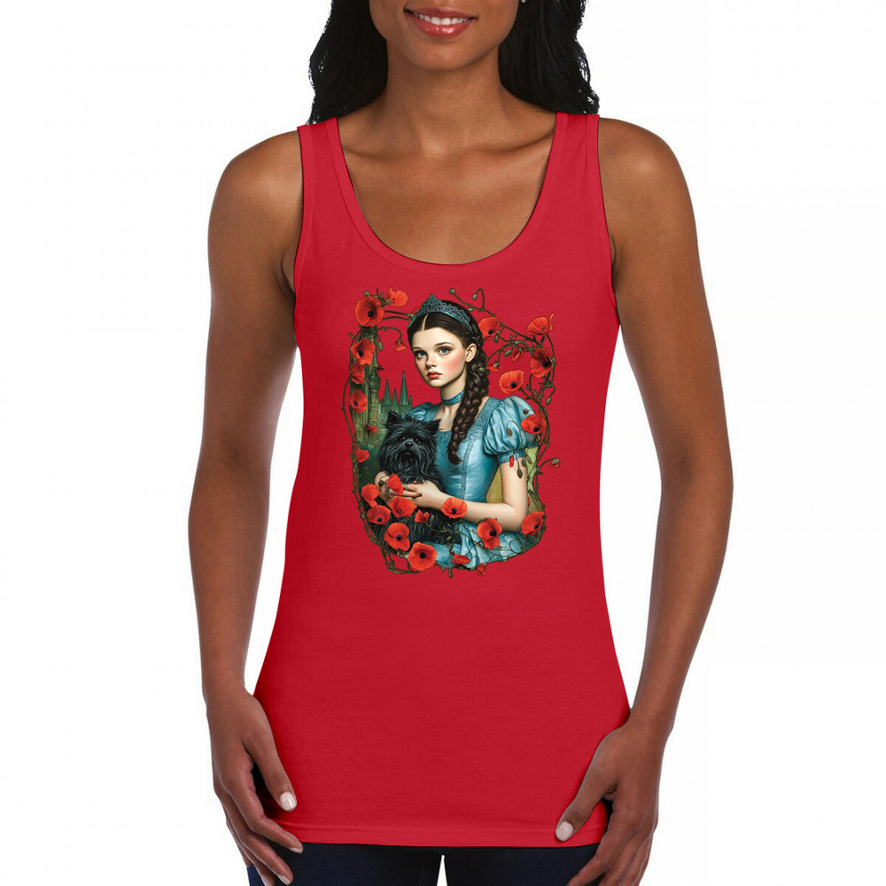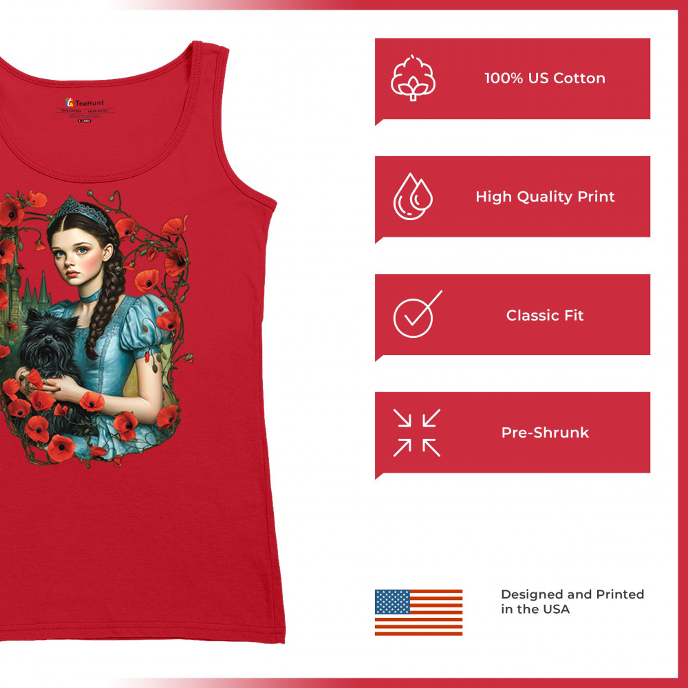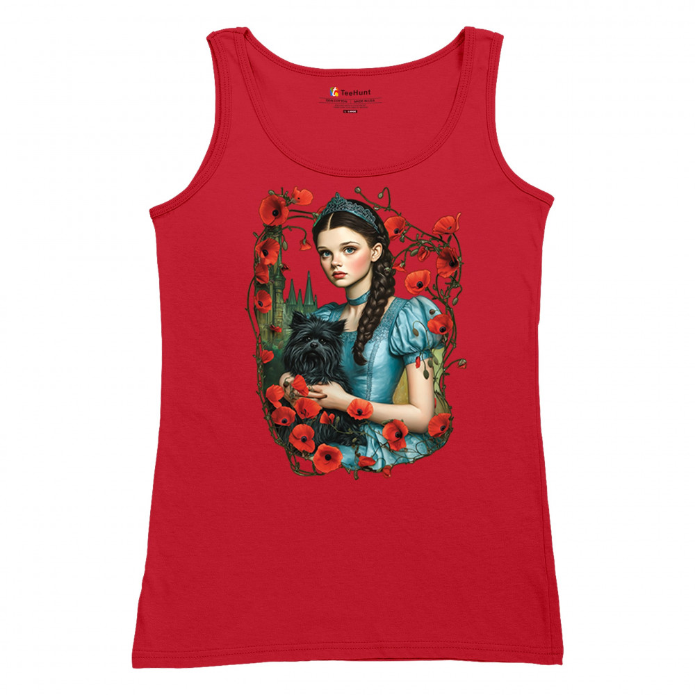 A charming design inspired by dark fairytales, featuring a girl in a blue dress holding her black dog amidst blooming red poppies. A distant castle and vintage styling channel Wizard of Oz fantasy with a gothic twist. Ideal for dreamers, nostalgic collectors, and lovers of whimsical storybook art filled with magic and memory.