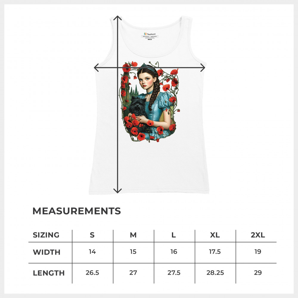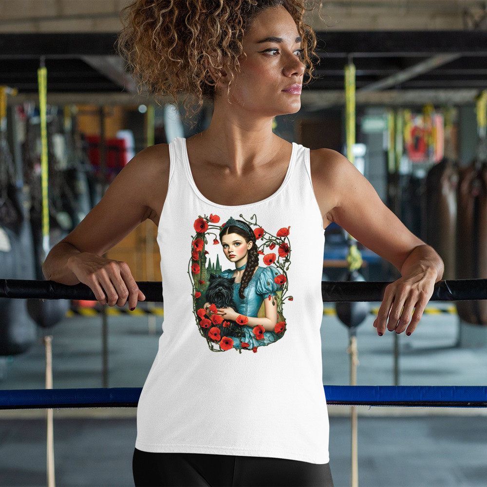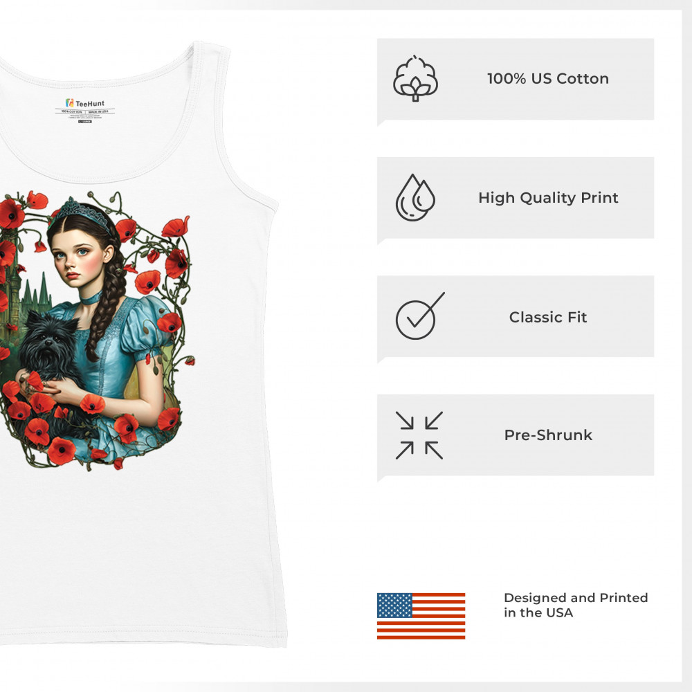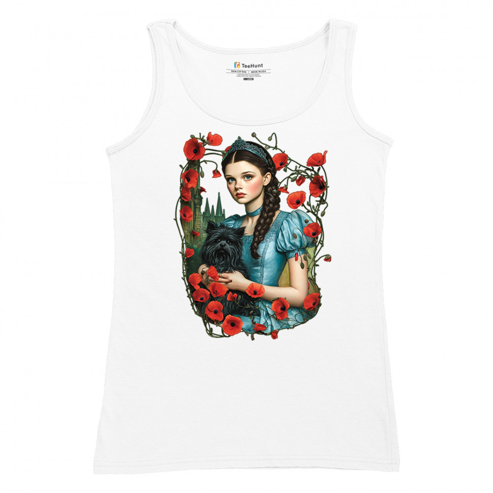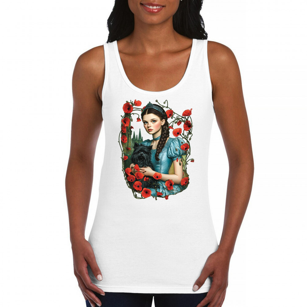 A charming design inspired by dark fairytales, featuring a girl in a blue dress holding her black dog amidst blooming red poppies. A distant castle and vintage styling channel Wizard of Oz fantasy with a gothic twist. Ideal for dreamers, nostalgic collectors, and lovers of whimsical storybook art filled with magic and memory.