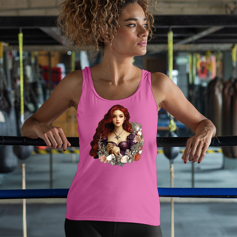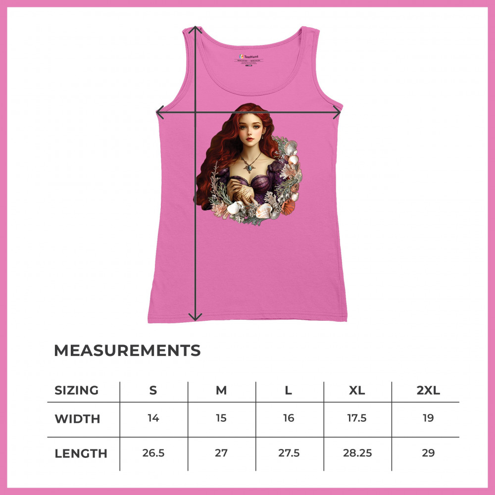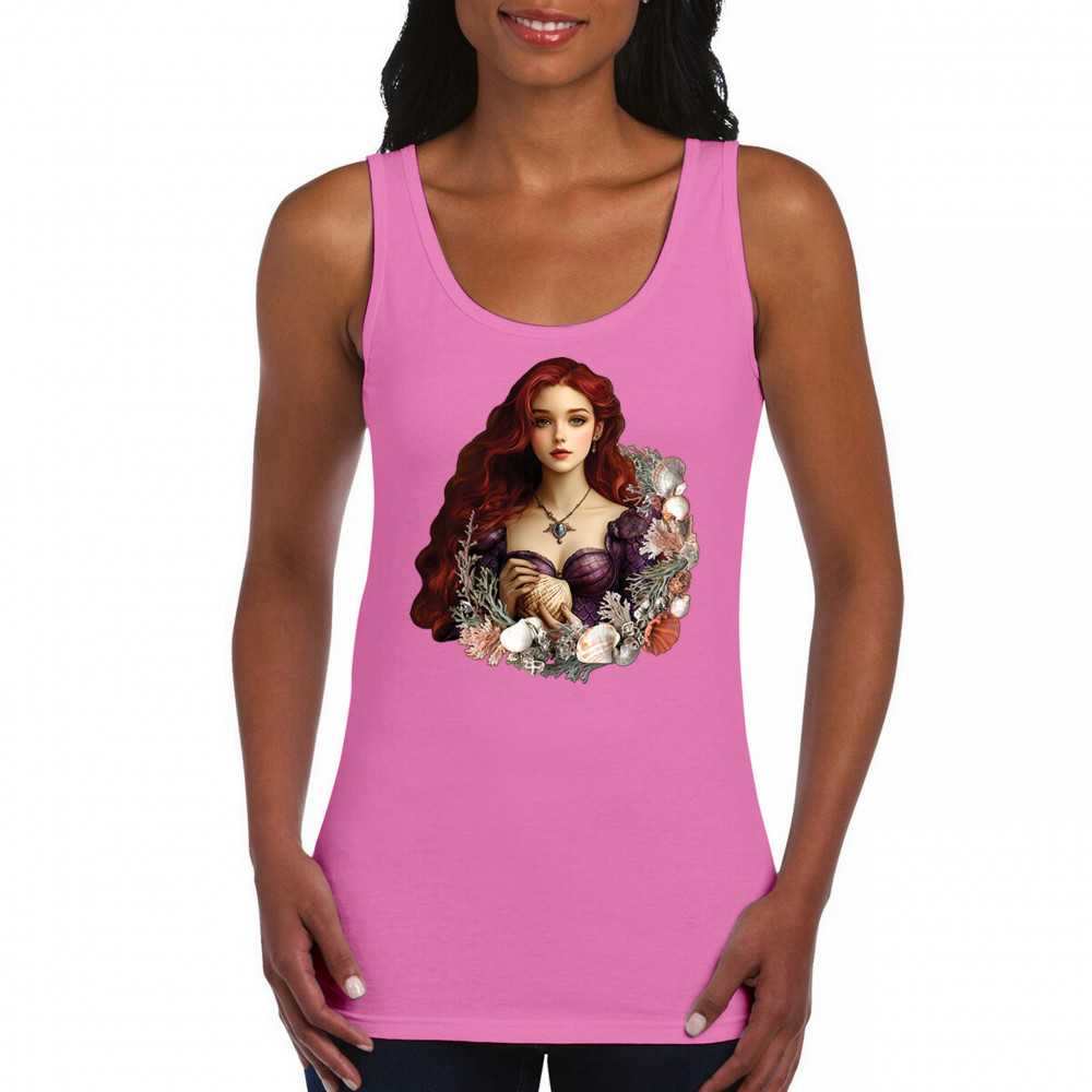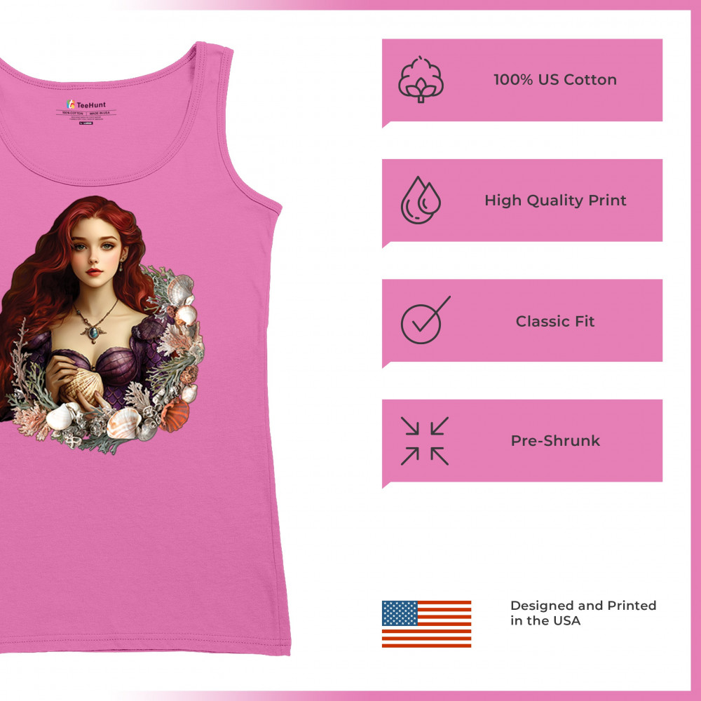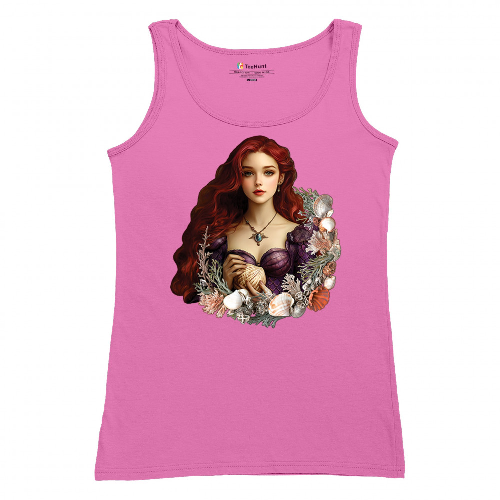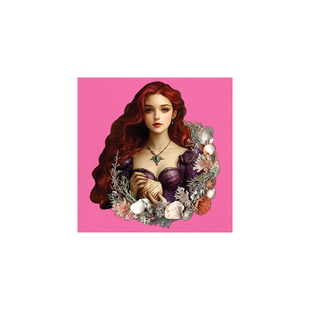 Inspired by mystical ocean themes, this design features a fantasy red-haired girl in a seashell dress, cradling a large shell. She is framed by coral, seaweed, and a shimmering array of ocean shells. With nods to classic mermaid lore and fairytale storytelling, it's perfect for fans of fantasy creatures, marine magic, and romantic ocean legends.