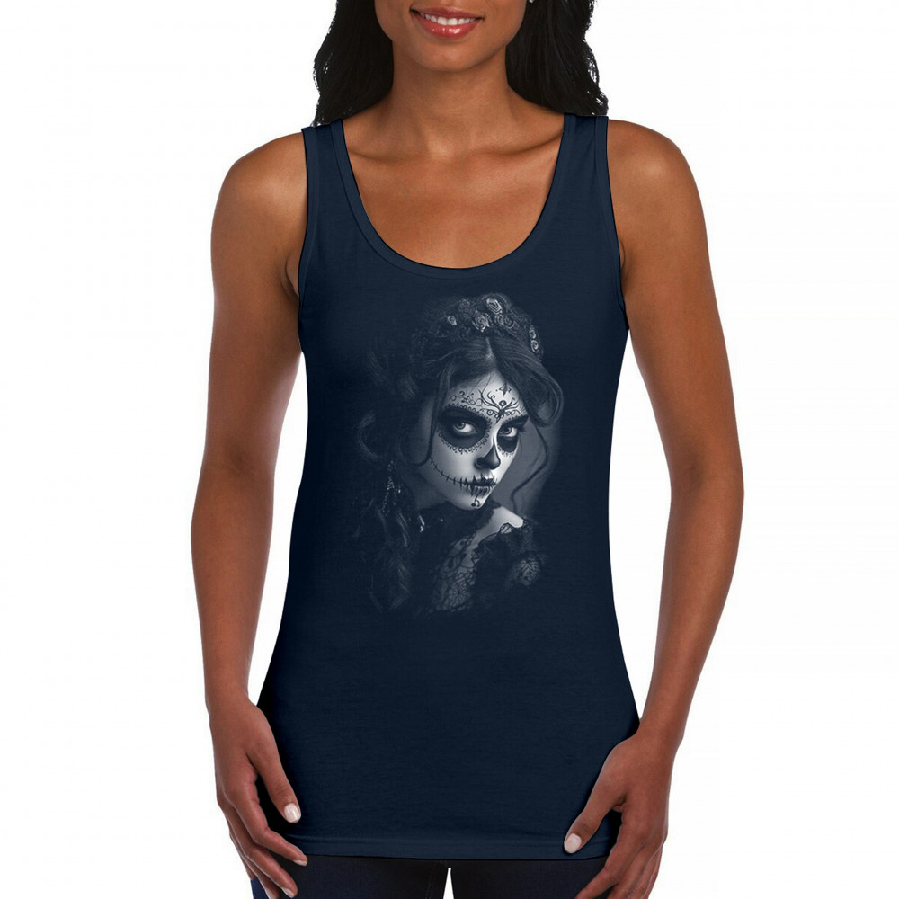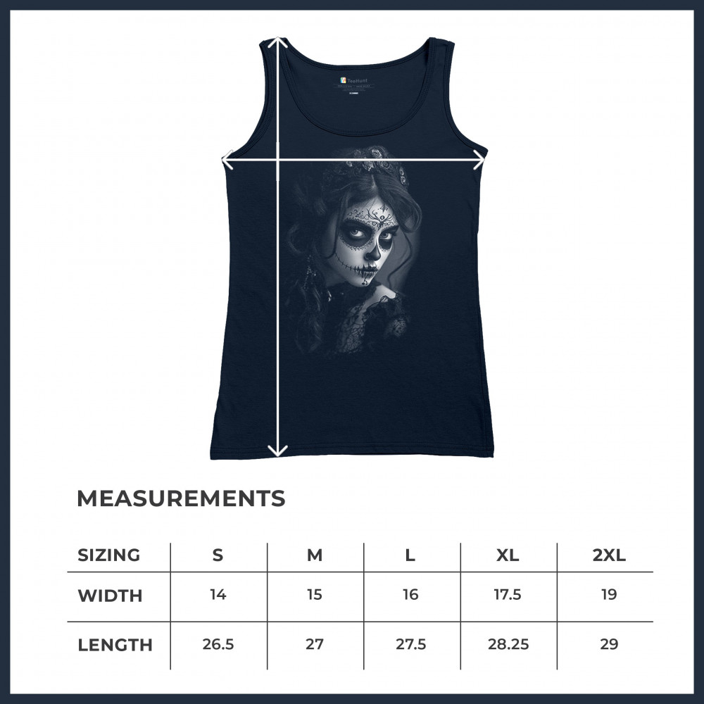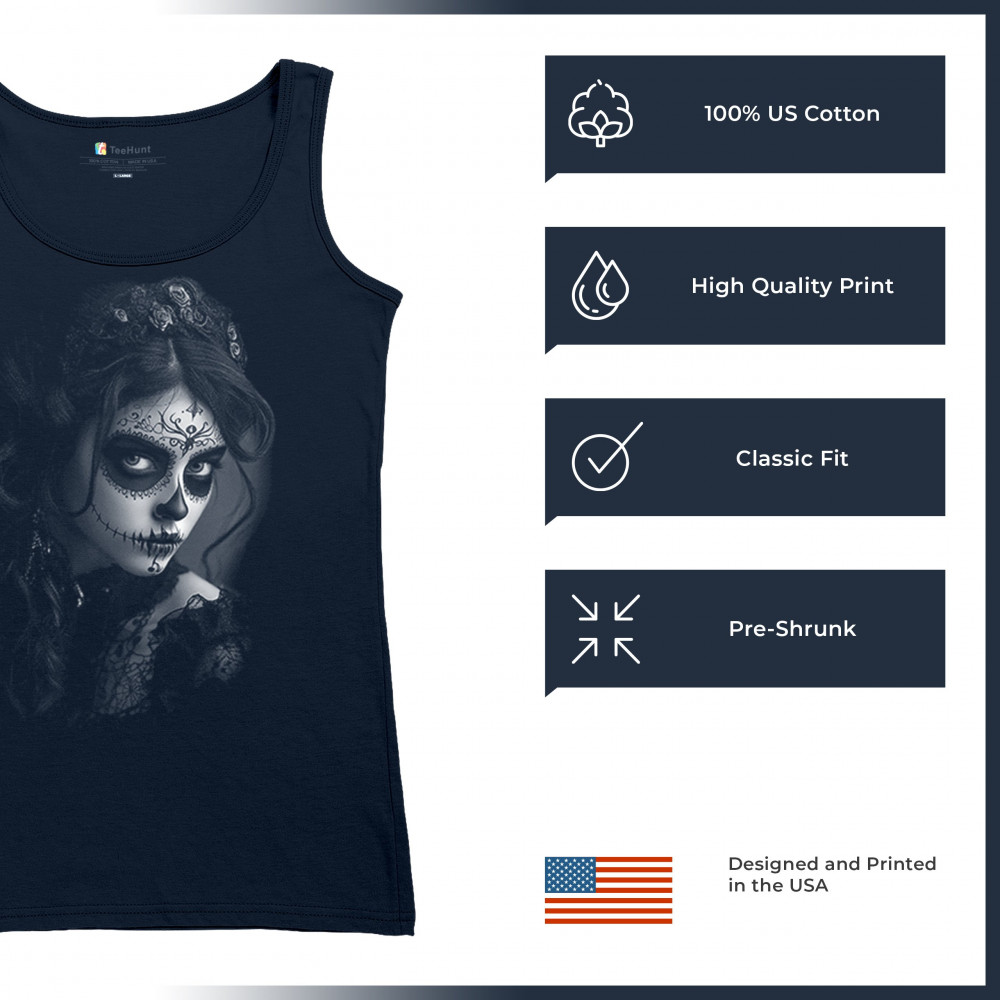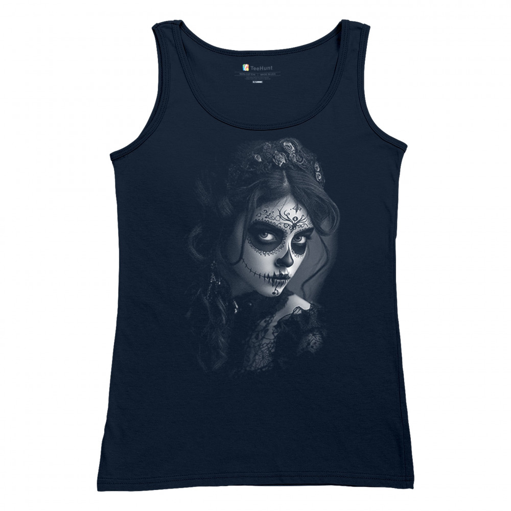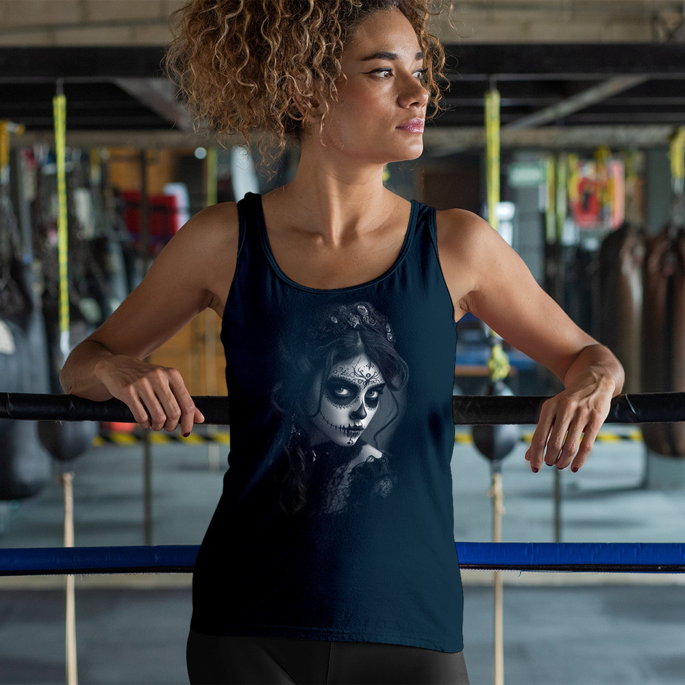 Showcasing a gothic woman with a sugar skull face, this black-and-white design blends DÃa de los Muertos tradition with dark elegance. Intricate face makeup, detailed lace, and a bold monochrome aesthetic create a dramatic visual tribute. A perfect piece for lovers of skull motifs, alt style, and haunting beauty.