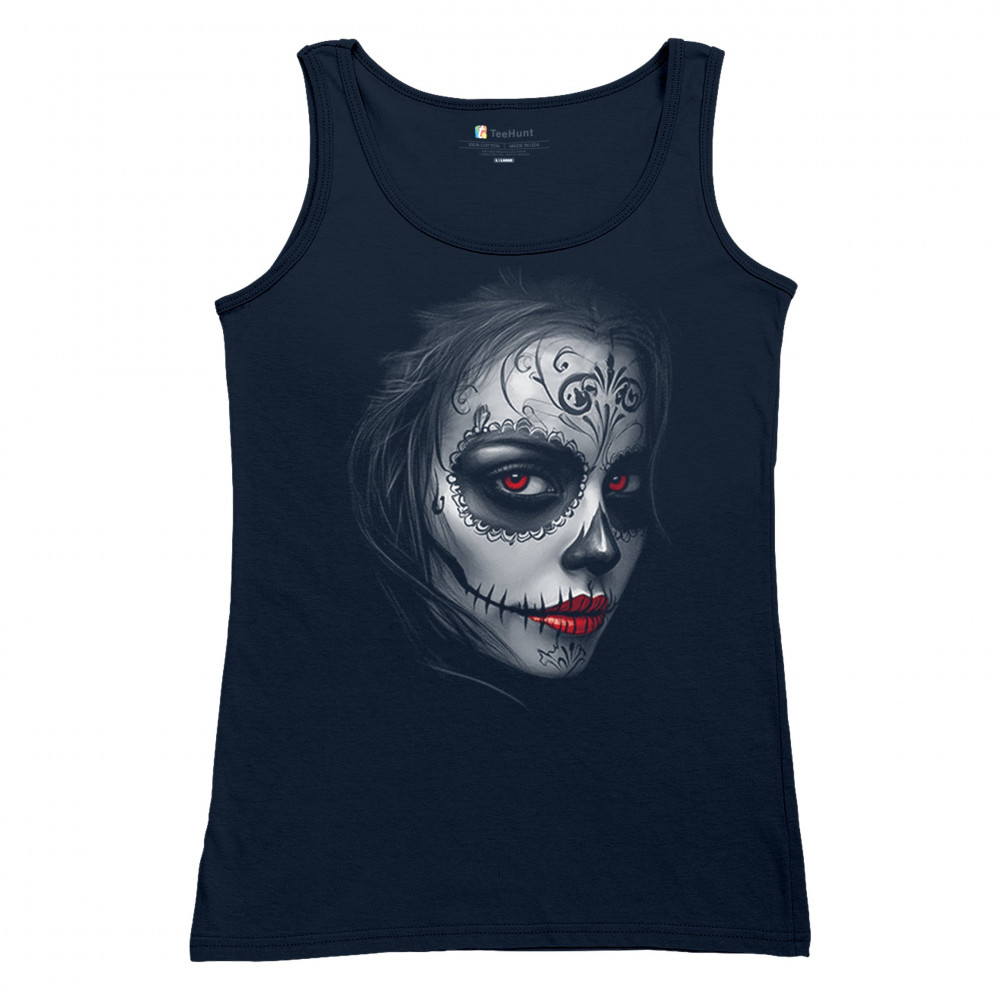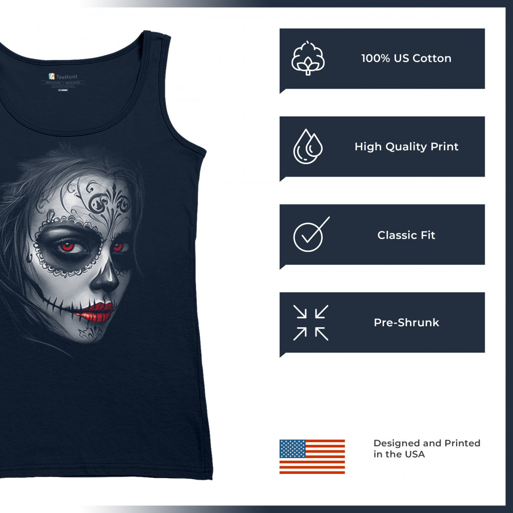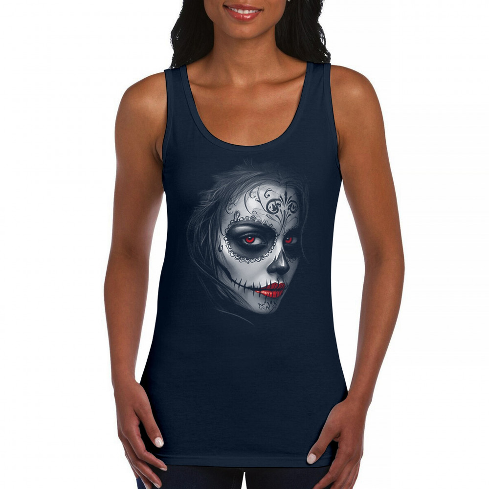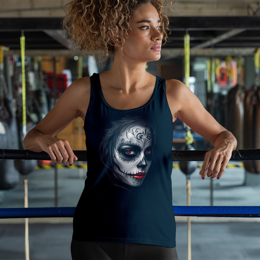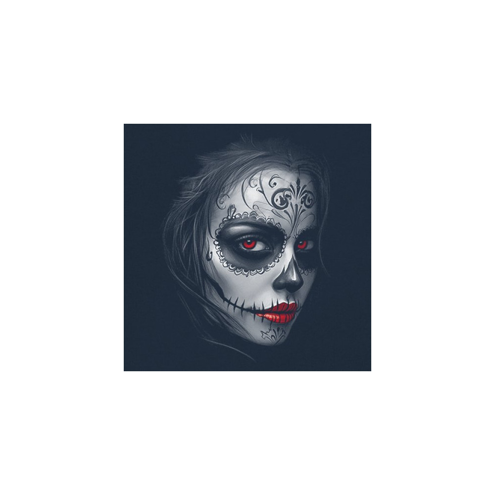 Glowing red eyes and red lips bring this sugar skull design to life. Featuring floral skull makeup, dark shadows, and gothic energy, it's a perfect pick for Halloween, DÃa de los Muertos, or alt culture fashion. Ideal for fans of bold beauty, spooky glamour, and skull art with an edge.