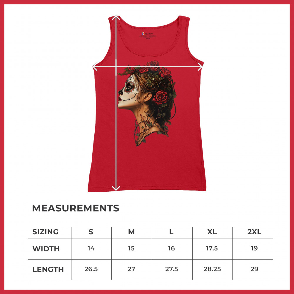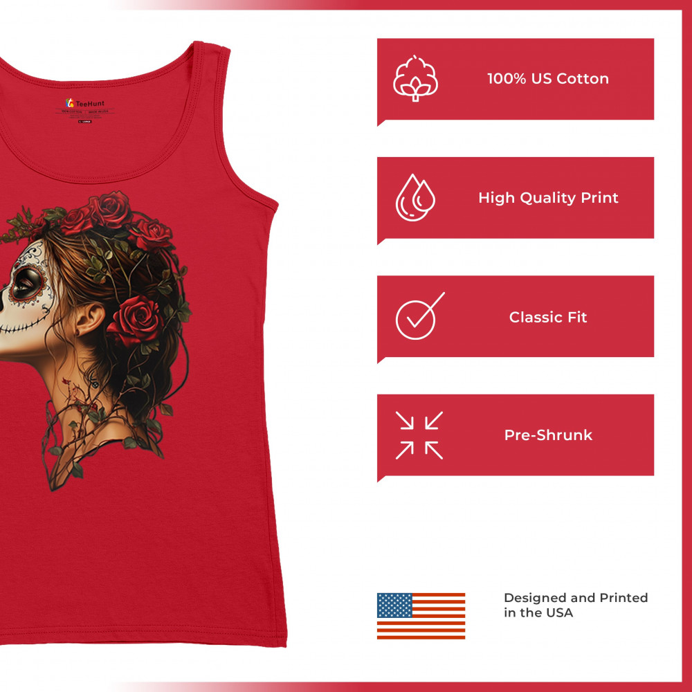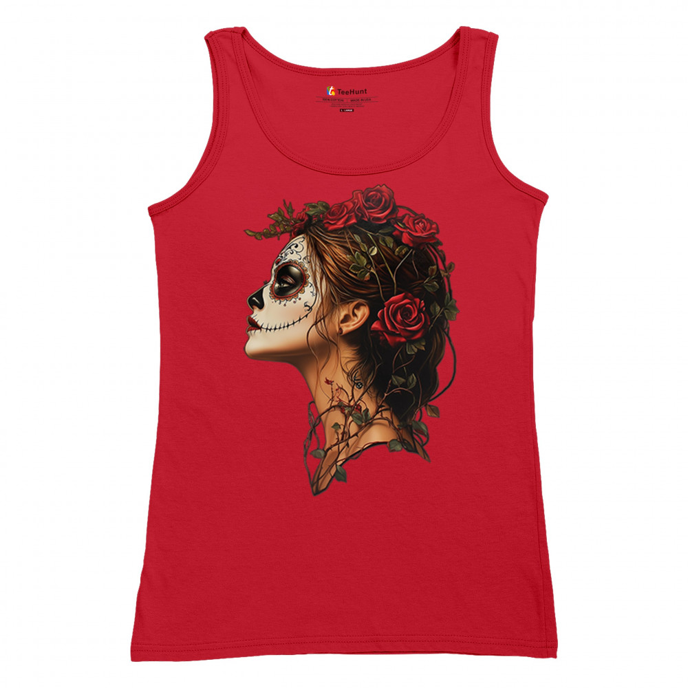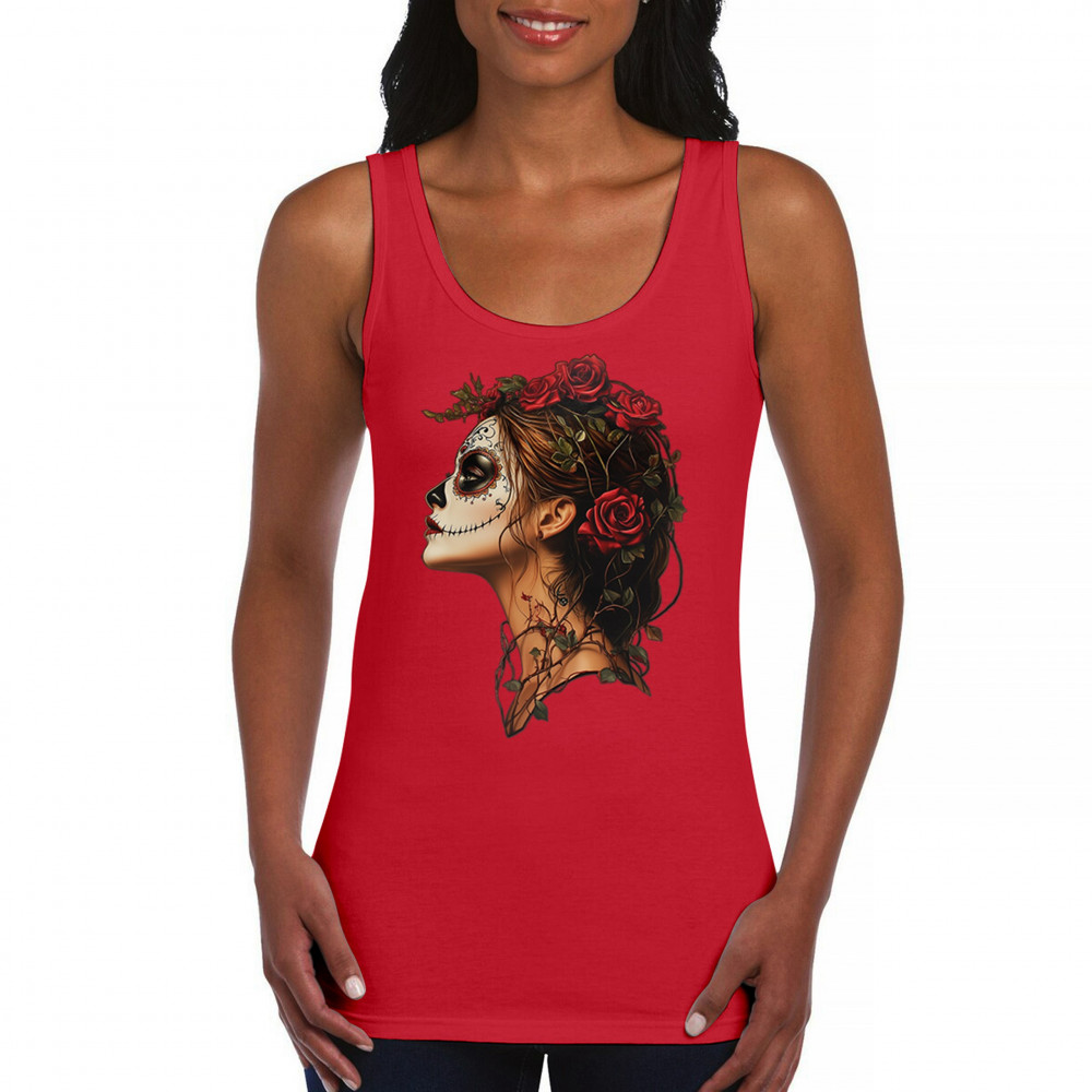 Celebrate feminine power and gothic elegance with this captivating DÃa de los Muertos design. Featuring a woman in profile with sugar skull makeup, blooming red roses, natural vines, dark hair, and symbolic floral skull art, this bold tribute captures beauty, death, and strength in one romantic, detailed visual.