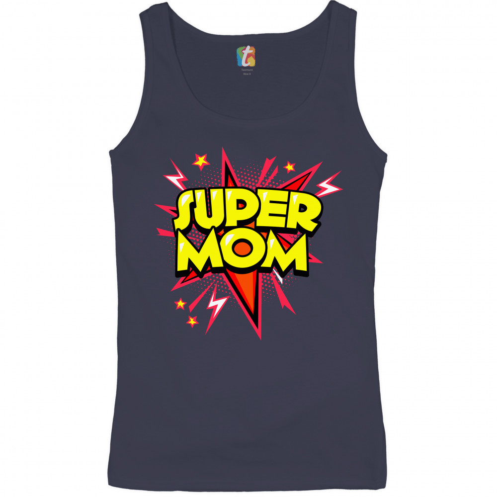 A bright print that says "super mom". Behind the words there is a cartoonish explosion with stars and lightnings flying everywhere. A great choice as a gift on Mother's Day for a loving caring mom.
