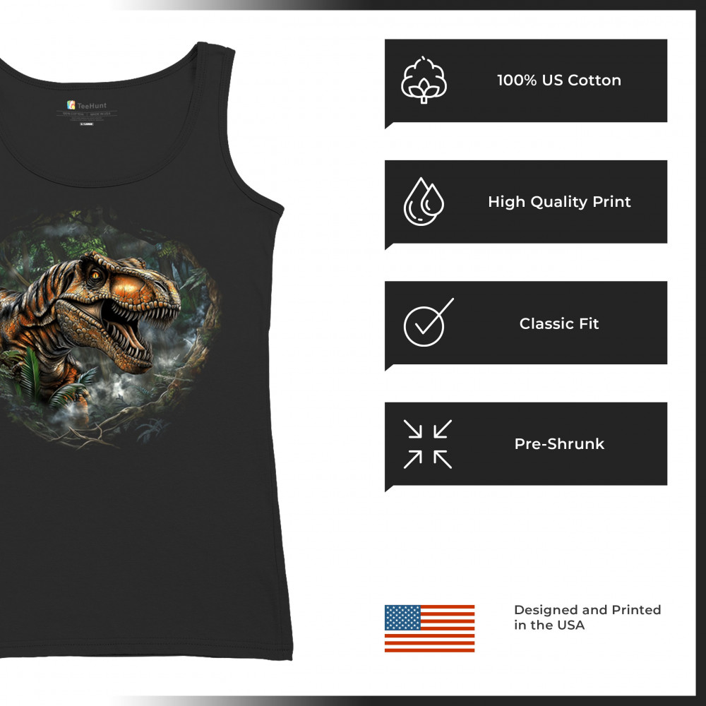 Roaring t rex in misty jungle. Great for fossil fans, dinosaur lovers, Jurassic park goers, and prehistoric adventure seekers.