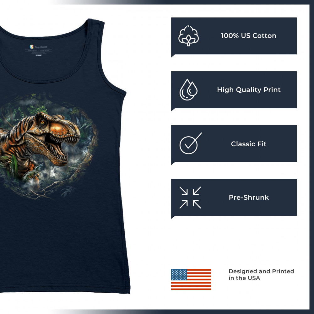 Roaring t rex in misty jungle. Great for fossil fans, dinosaur lovers, Jurassic park goers, and prehistoric adventure seekers.