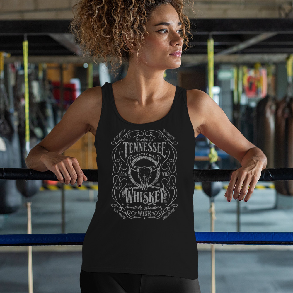 Smooth As Tennessee Whiskey, Sweet As Strawberry Wine. This country girl design delivers retro charm with bold lettering, a vintage bull skull, and classic southern pride. Perfect for cowgirls who love dirt roads, music festivals, rodeos, or a night of whiskey and wine under the stars.