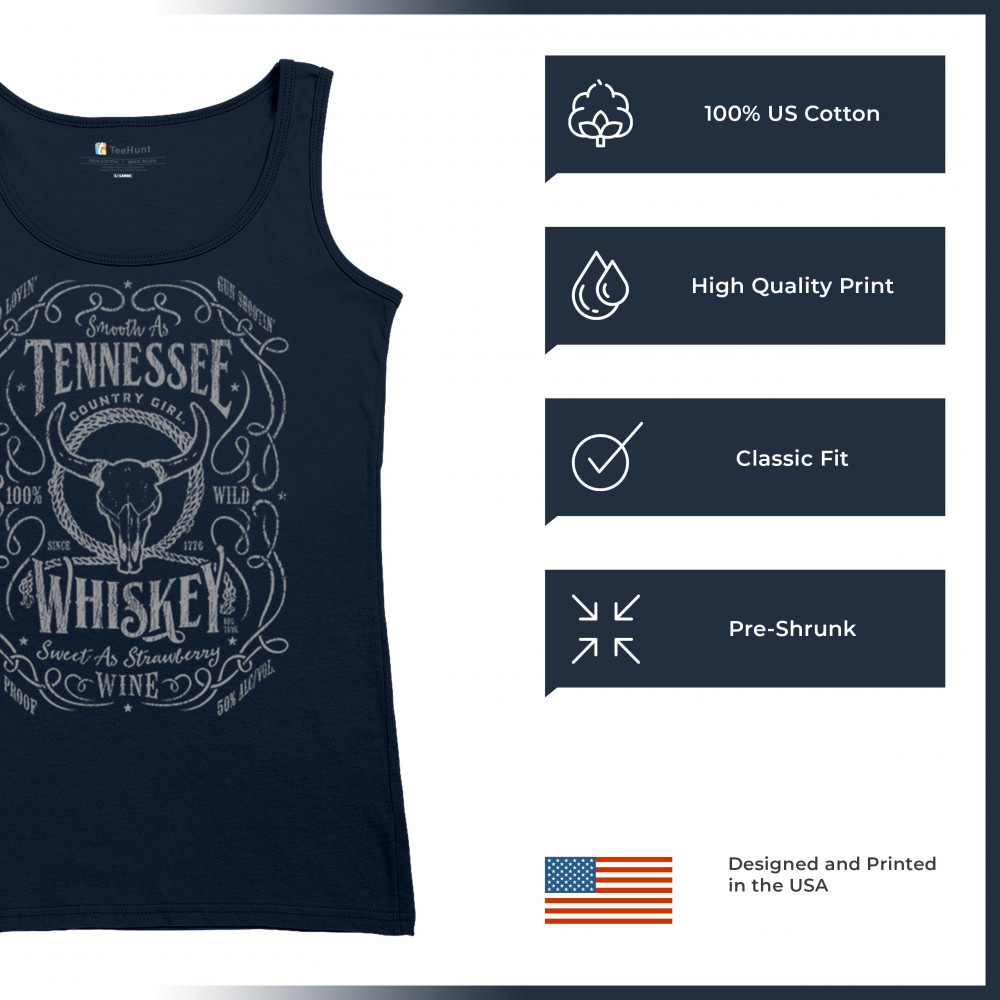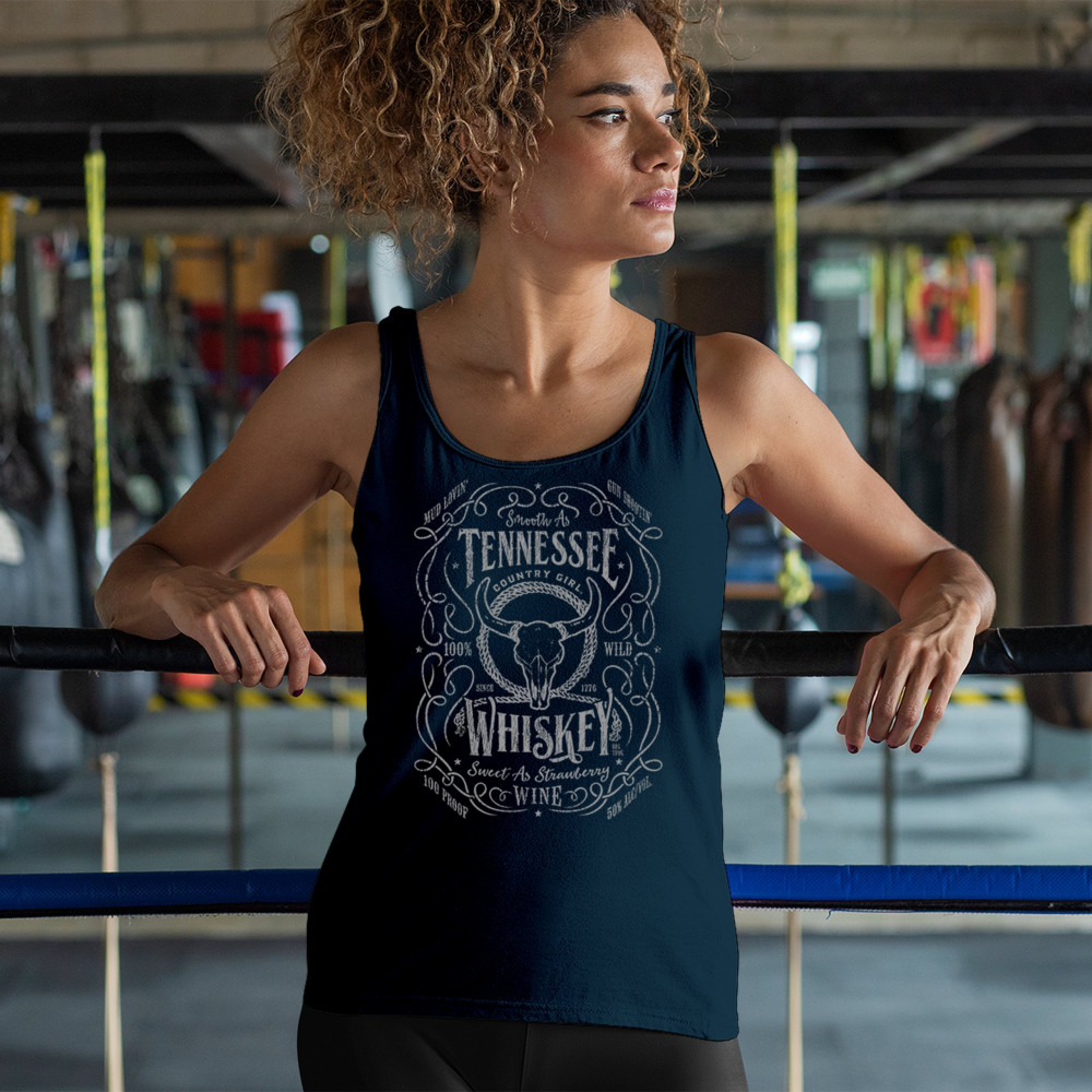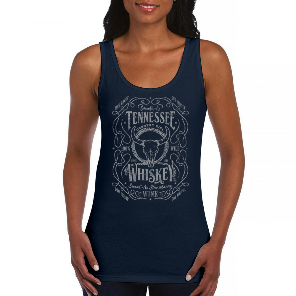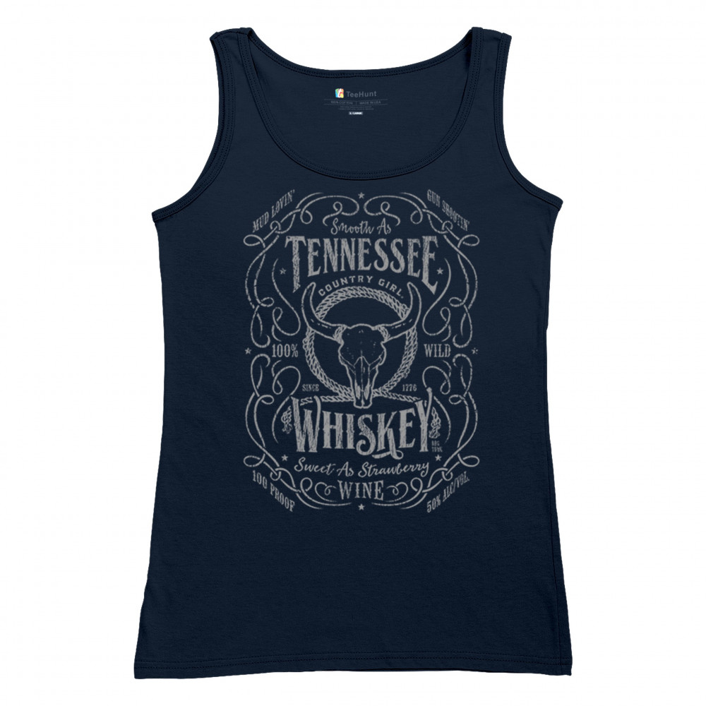 Smooth As Tennessee Whiskey, Sweet As Strawberry Wine. This country girl design delivers retro charm with bold lettering, a vintage bull skull, and classic southern pride. Perfect for cowgirls who love dirt roads, music festivals, rodeos, or a night of whiskey and wine under the stars.