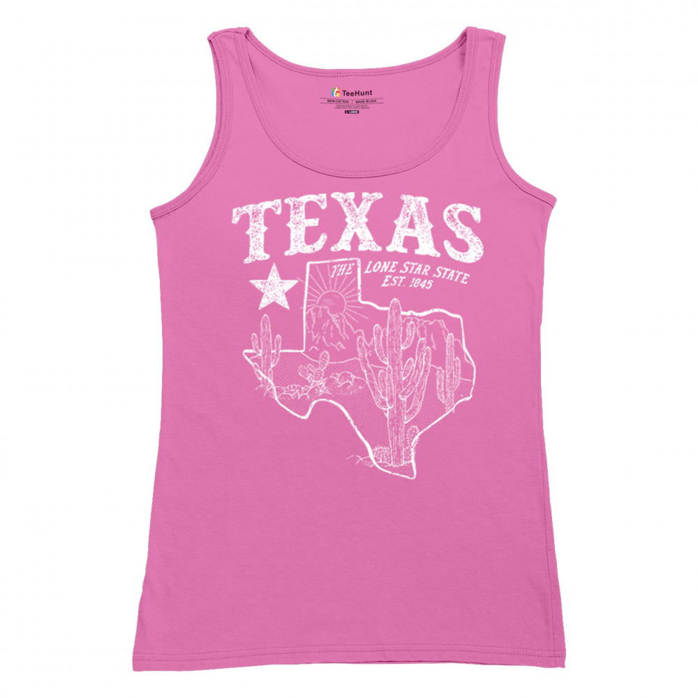 Vintage Texas pride design with cactus, mountains, Lone Star symbol, and 1845 tribute—perfect for rodeos and western events.