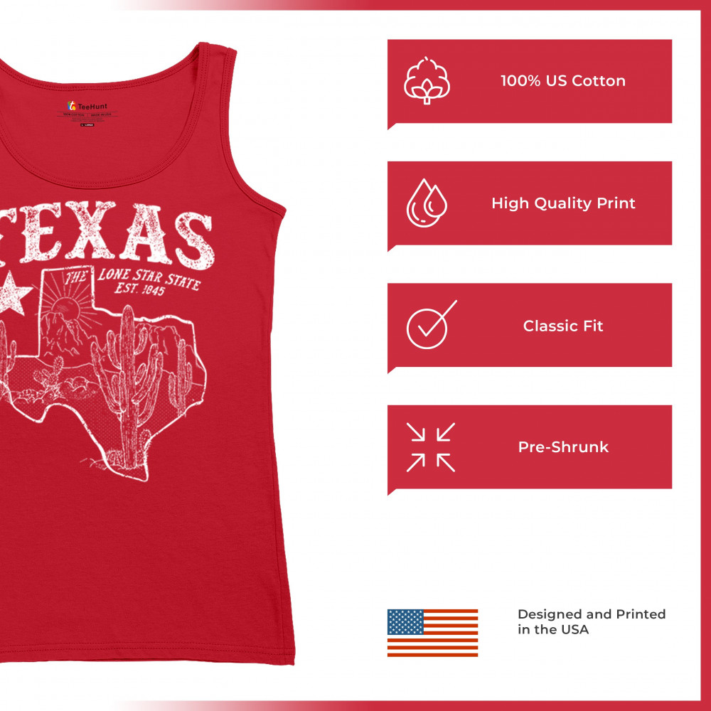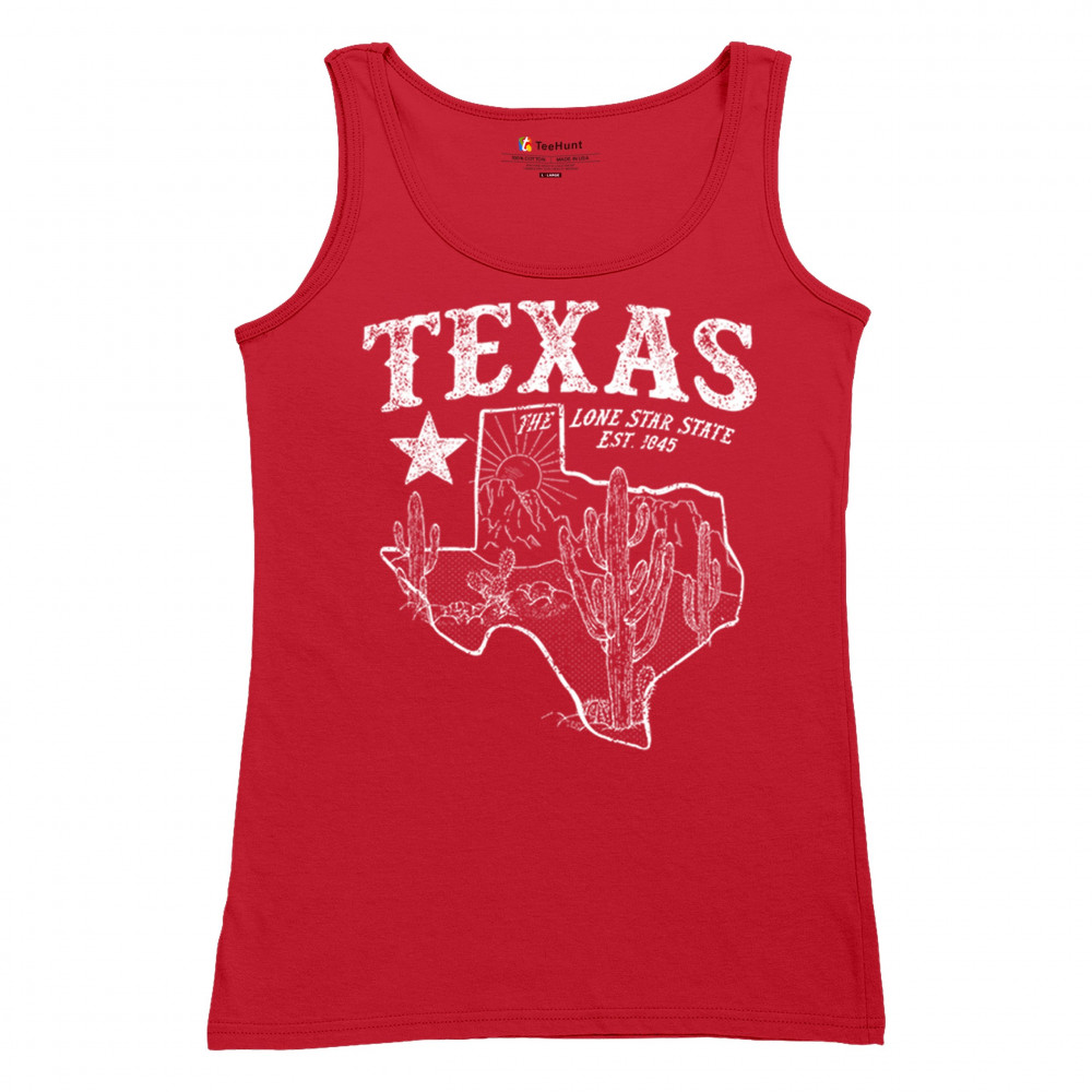 Vintage Texas pride design with cactus, mountains, Lone Star symbol, and 1845 tribute—perfect for rodeos and western events.