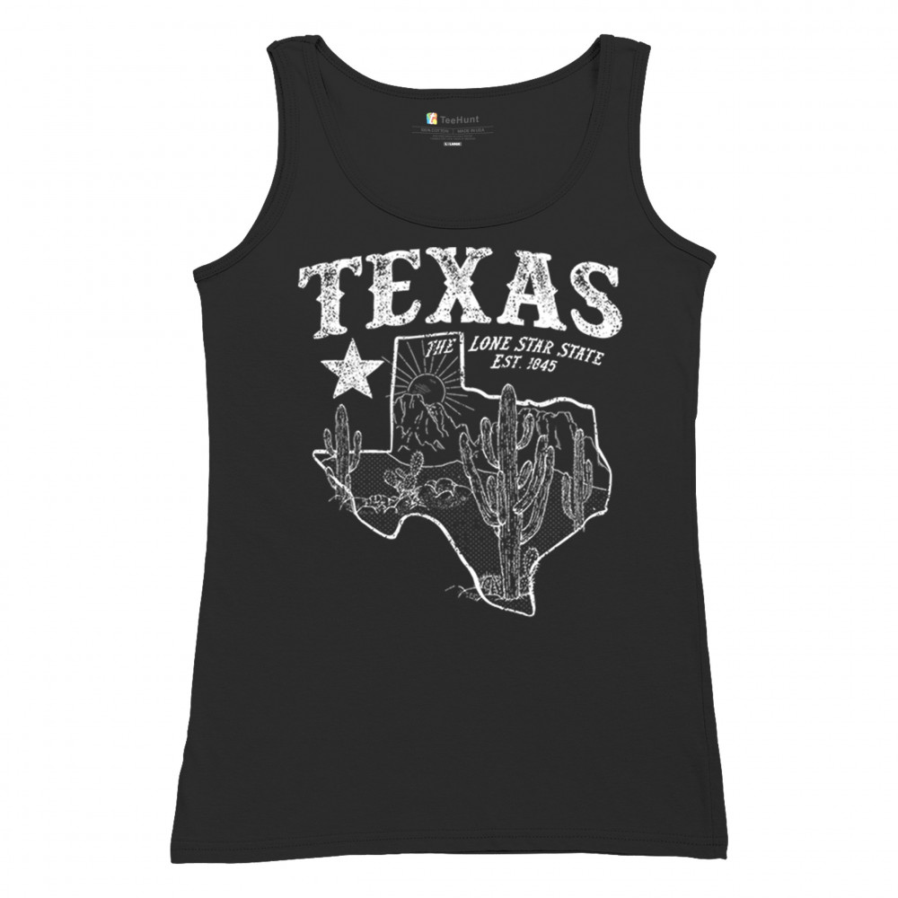 Vintage Texas pride design with cactus, mountains, Lone Star symbol, and 1845 tribute—perfect for rodeos and western events.
