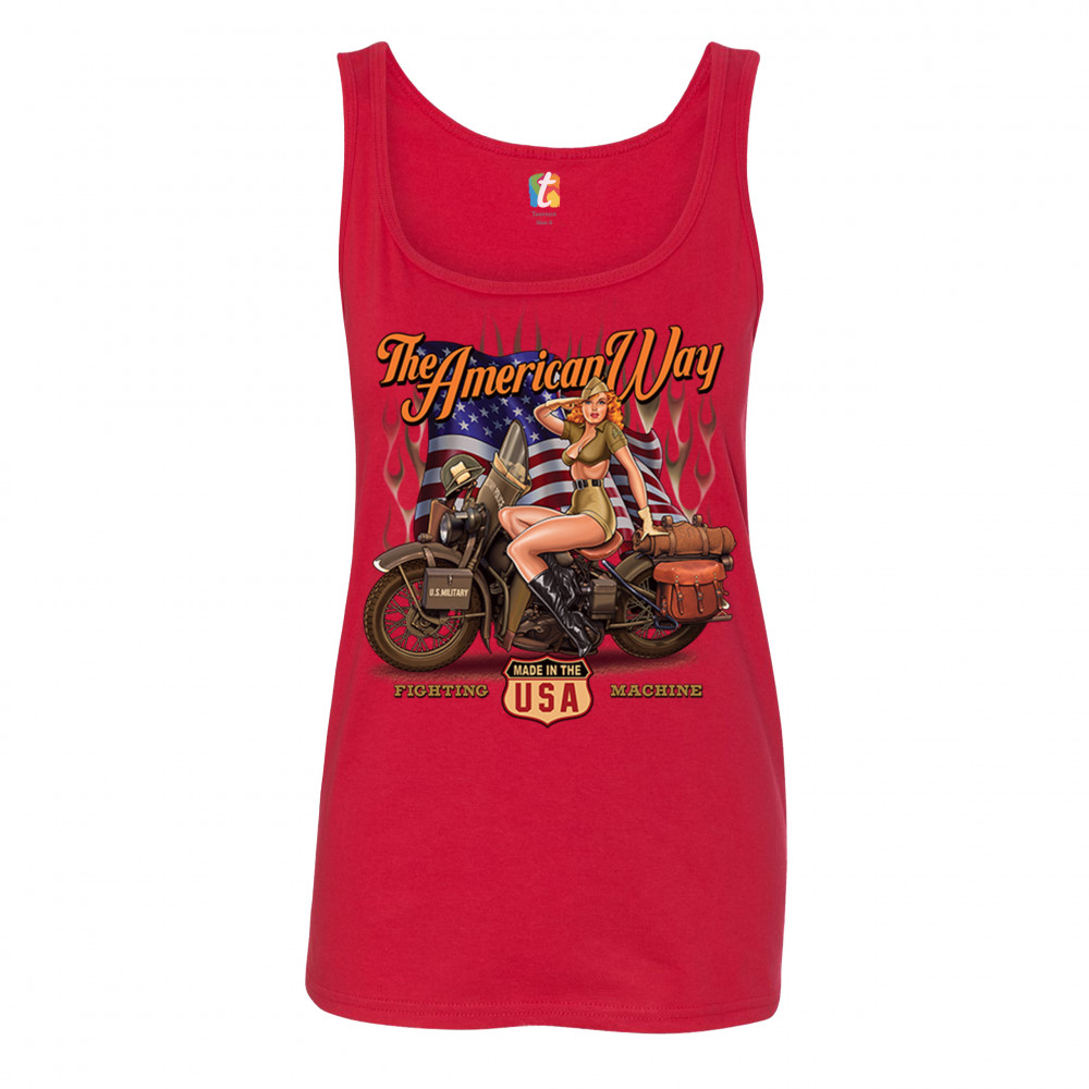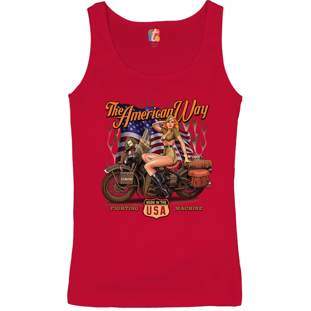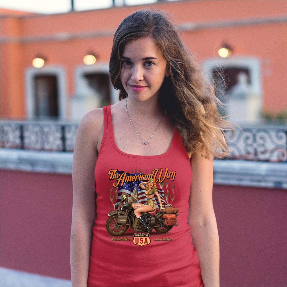 A print featuring a beautiful pin-up girl in leather boots sitting on a U.S. military motorcycle. There is the American Flag in the background and the words "The American Way" above it. At the bottom of the picture there is a shield which says: "made in the USA". "Fighting Machine" is written under the motorcycle's wheels. A great choice for a motorcycle enthusiast.