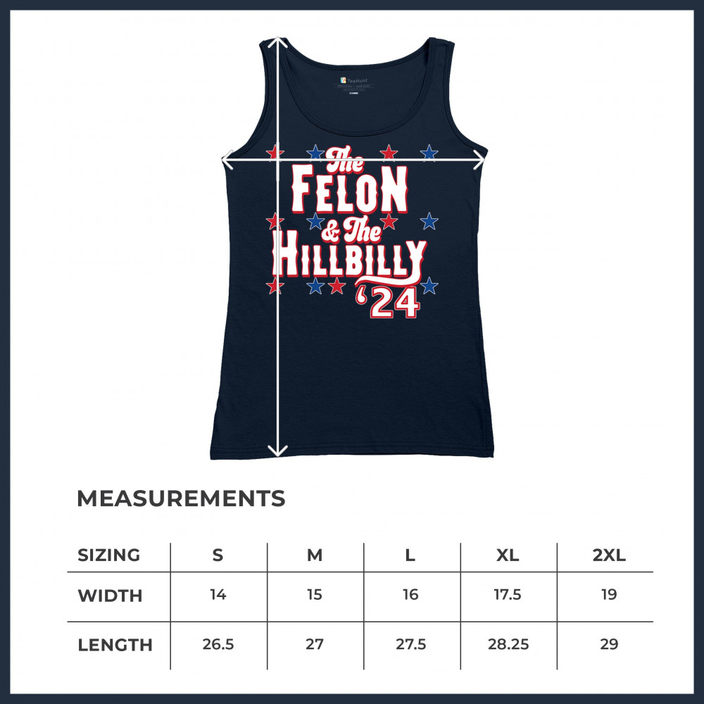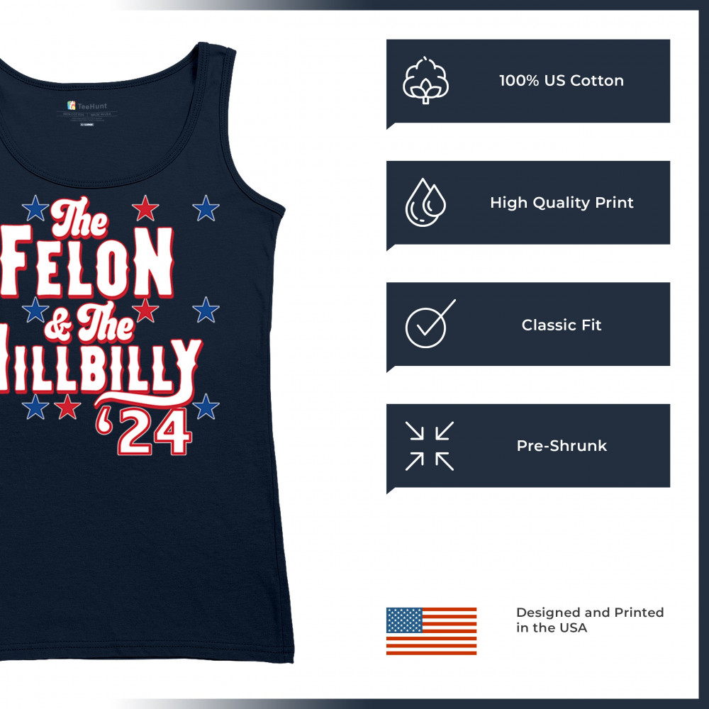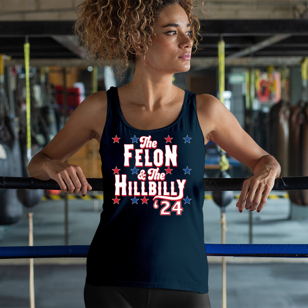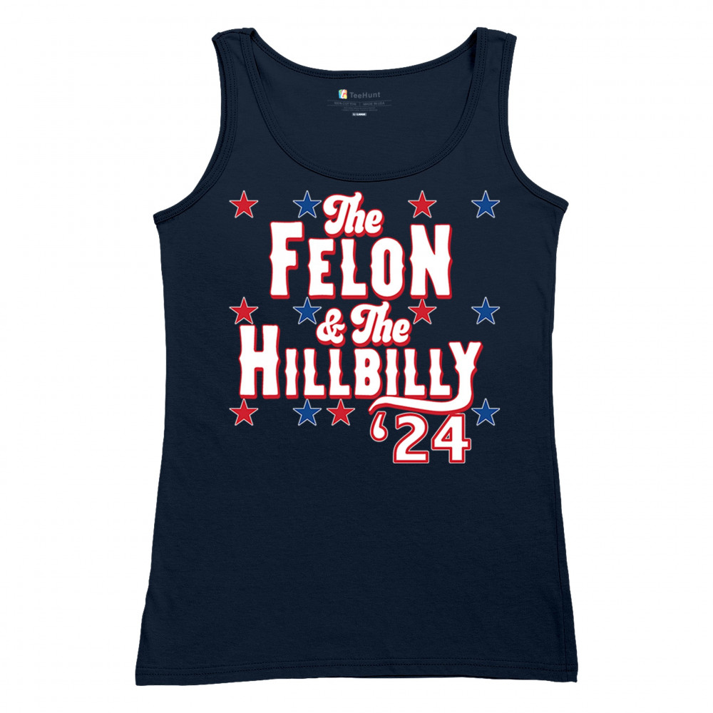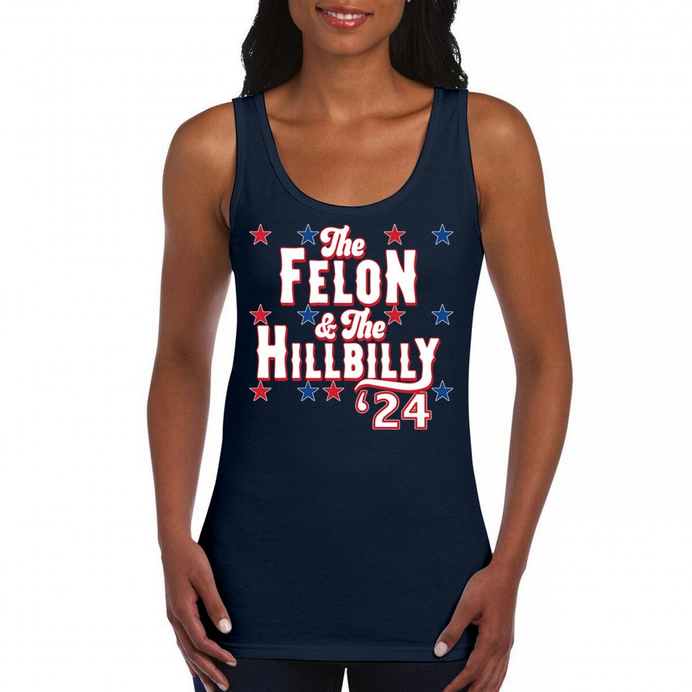 Humorous pro-Trump and Vance design for the 2024 election. "The Felon & The Hillbilly '24" captures conservative pride and humor in one bold statement.