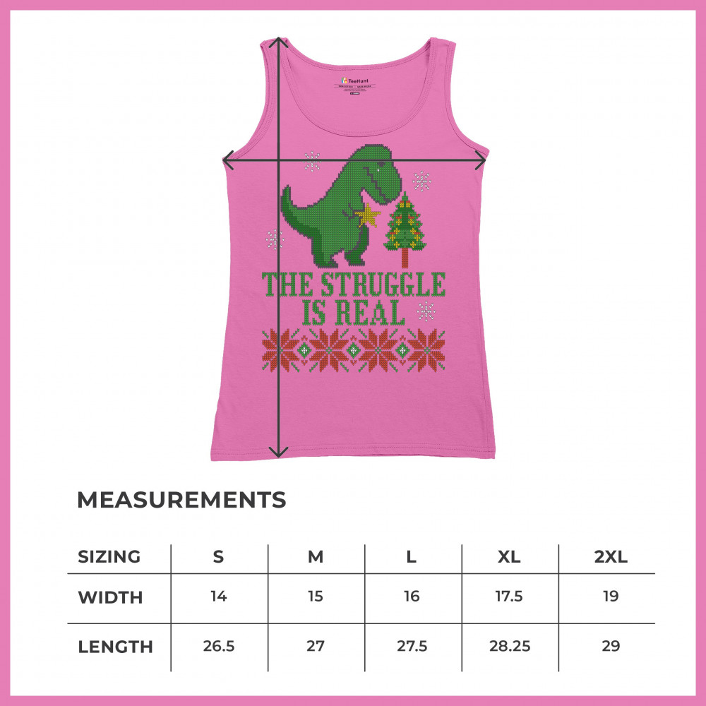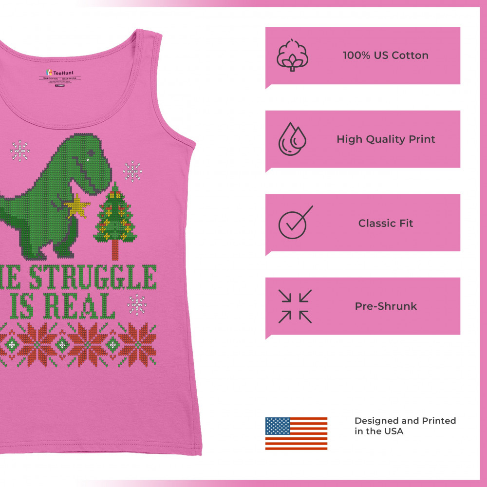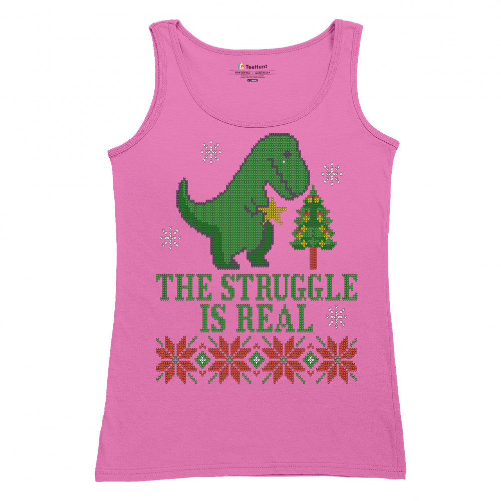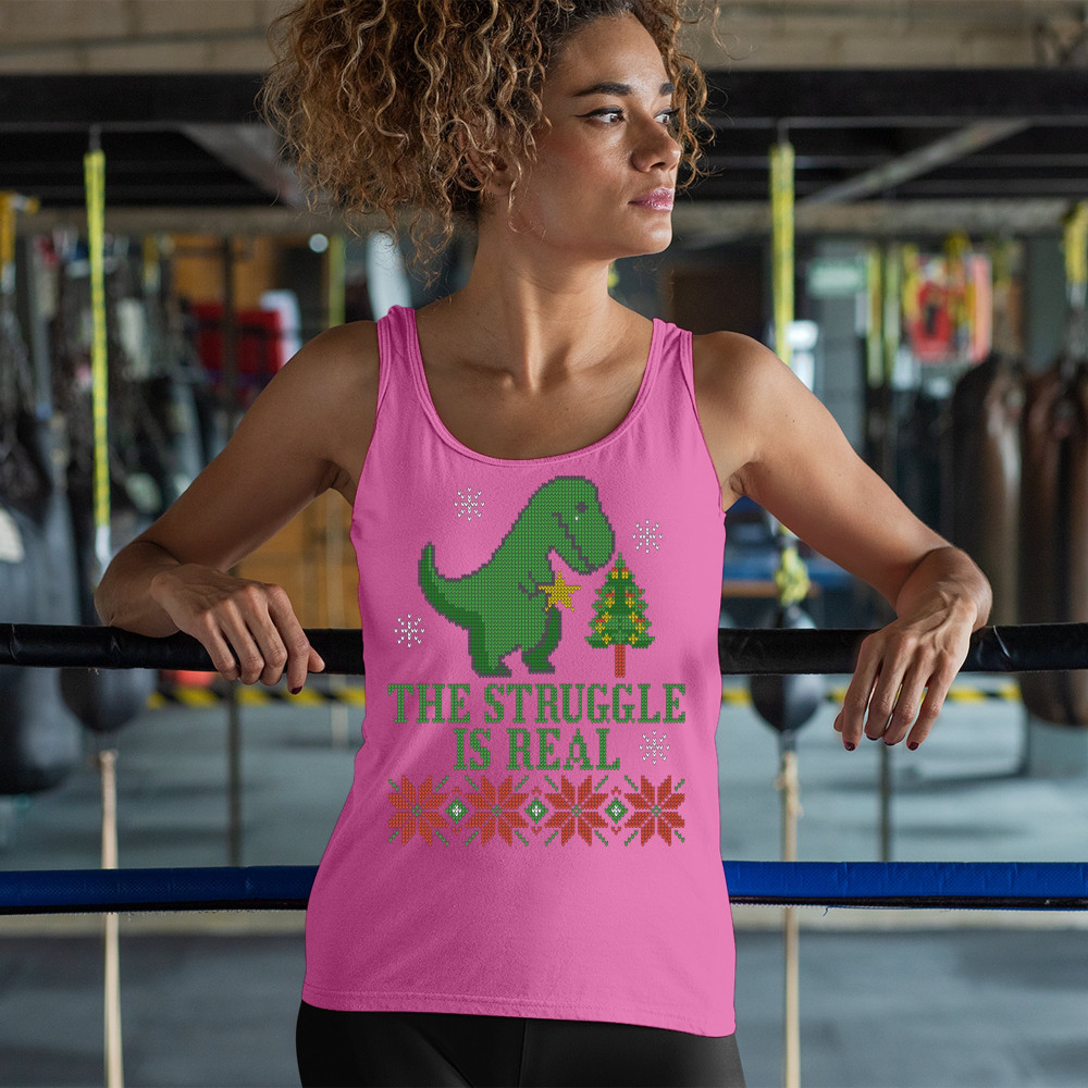 A funny print saying: "The Struggle Is Real" and featuring a sad tyrannosaurus rex holding a toy star in it's short hands standing by a Christmas tree. The print is decorated as an ugly sweater. Amazing choice to make people smile and spread positive vibe