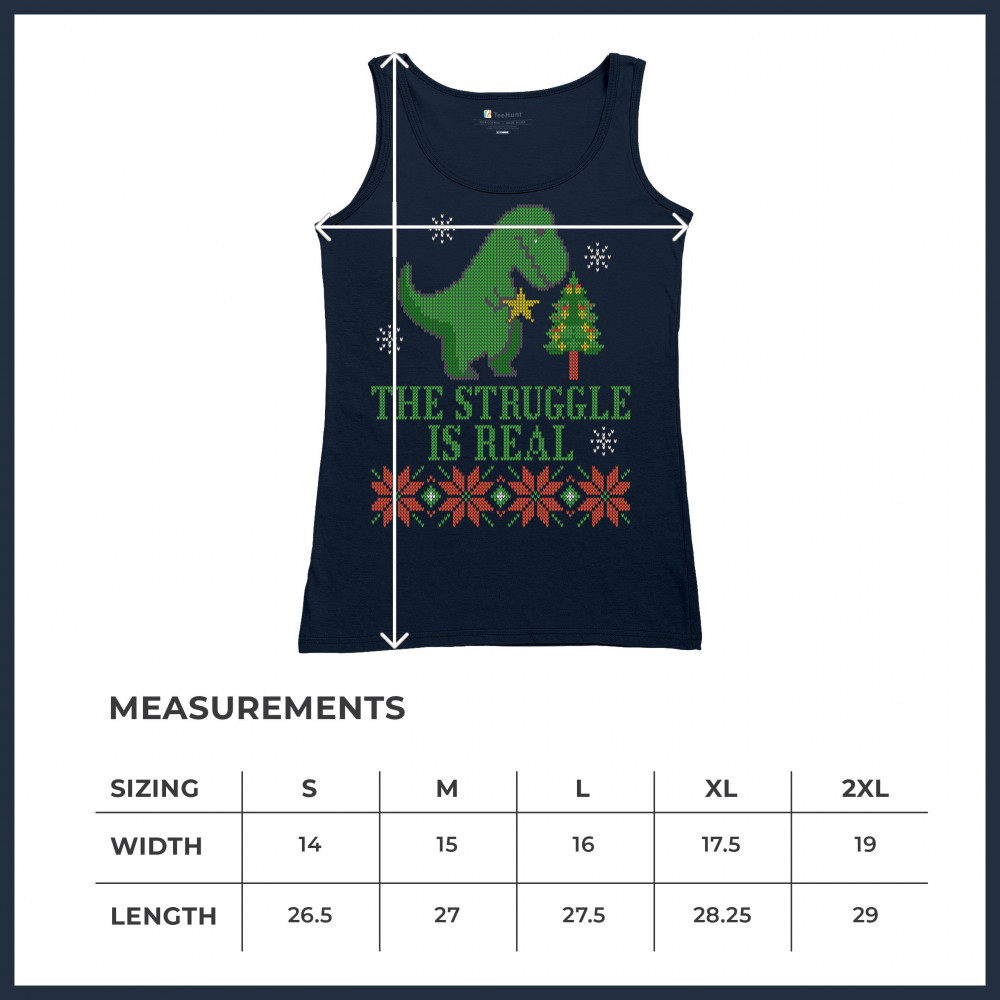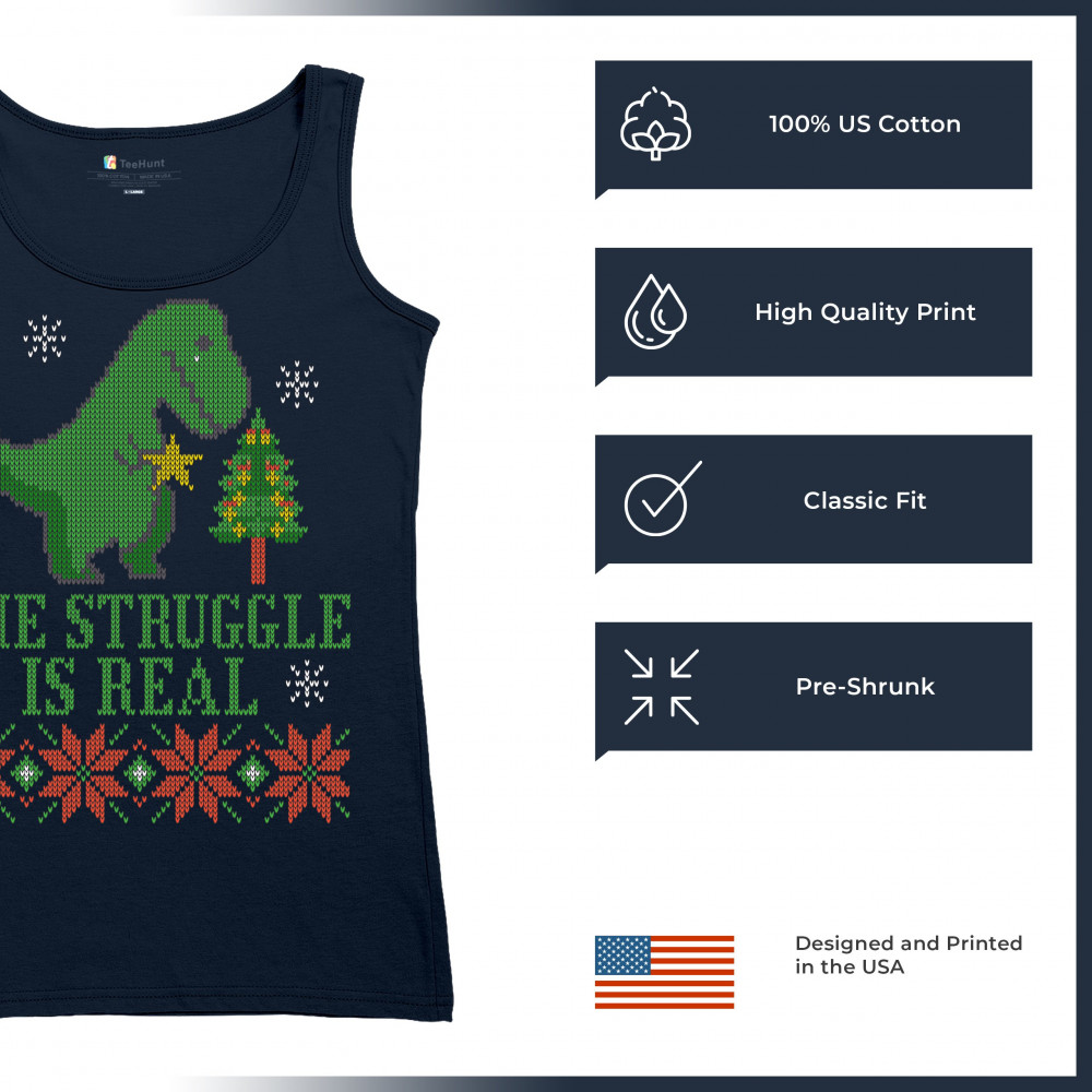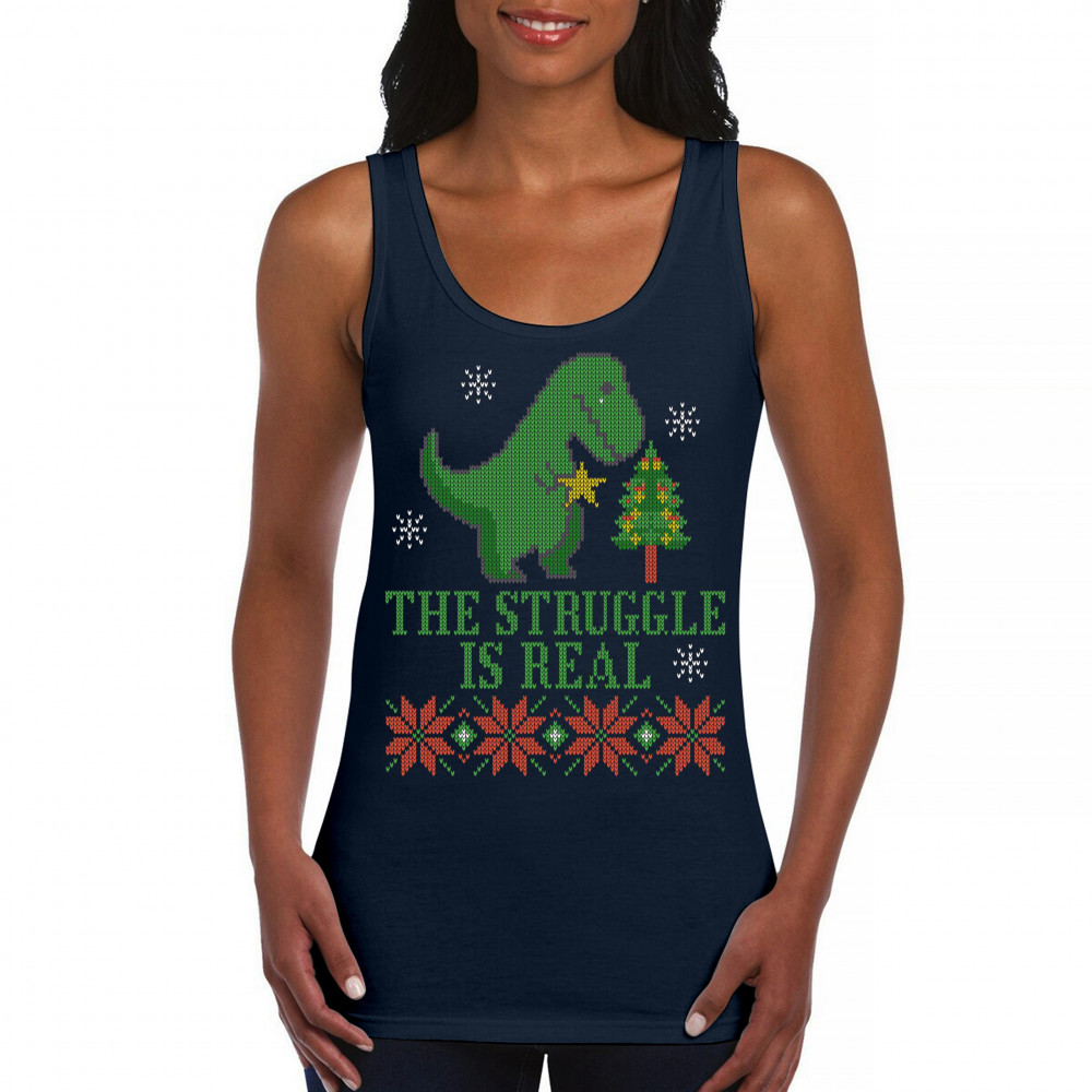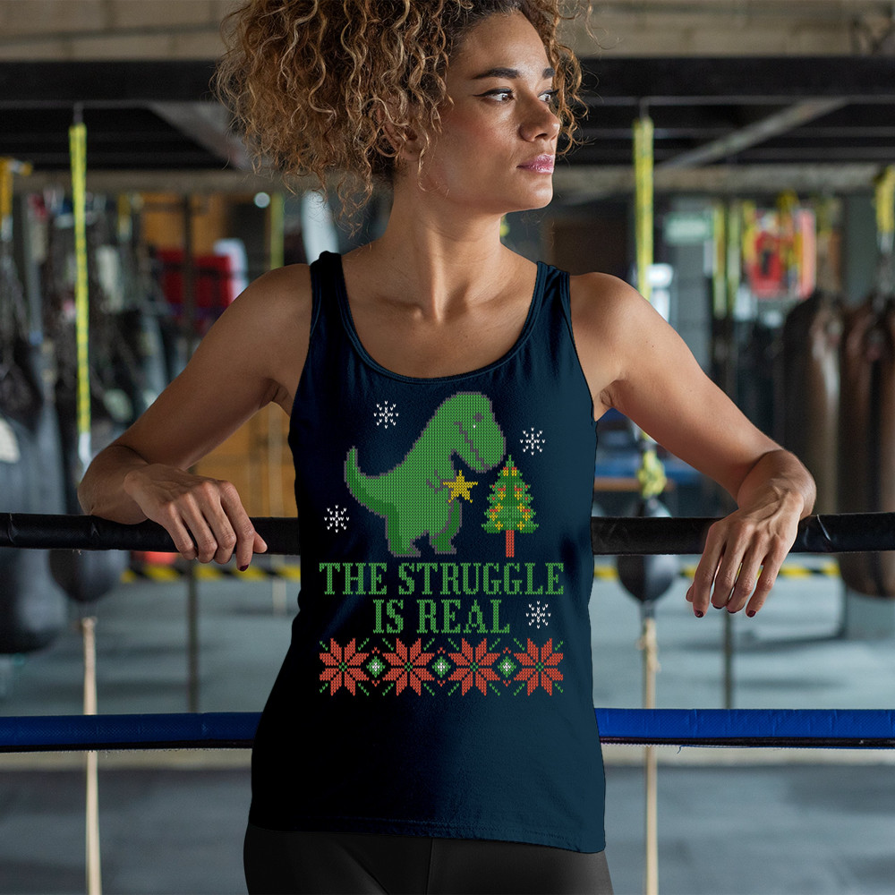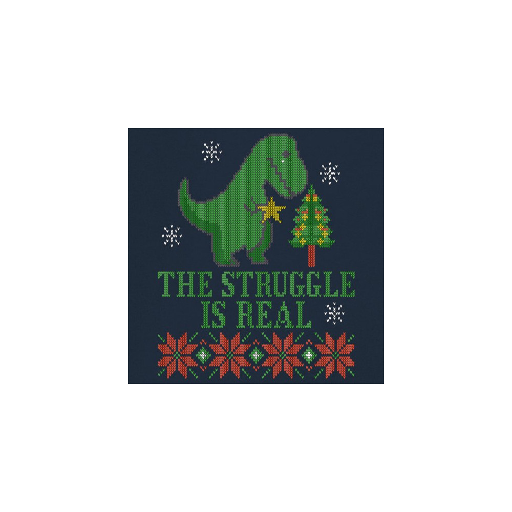 A funny print saying: "The Struggle Is Real" and featuring a sad tyrannosaurus rex holding a toy star in it's short hands standing by a Christmas tree. The print is decorated as an ugly sweater. Amazing choice to make people smile and spread positive vibe