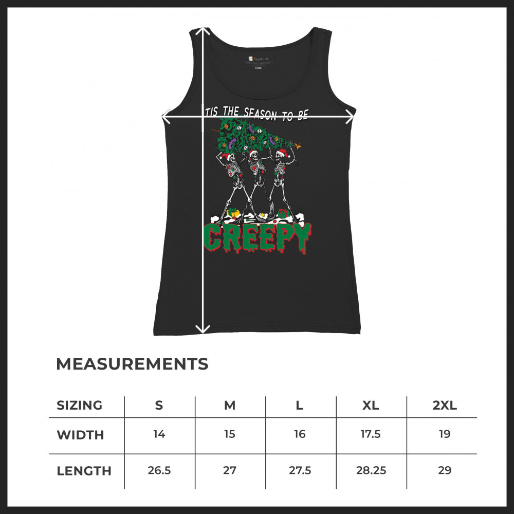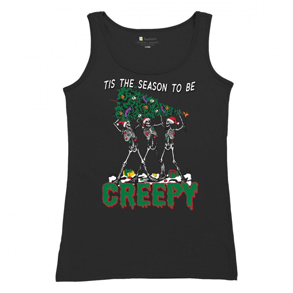 "Tis the Season to Be Creepy" combines holiday cheer with a hauntingly fun twist. This creative design features skeletons donning Santa hats as they carry a spooky Christmas tree decorated with eerie ornaments. Perfect for holiday gatherings, Secret Santa gifts, or themed parties, this design celebrates the festive and the macabre. Embrace the jolliest and creepiest bunch this season with this standout apparel.