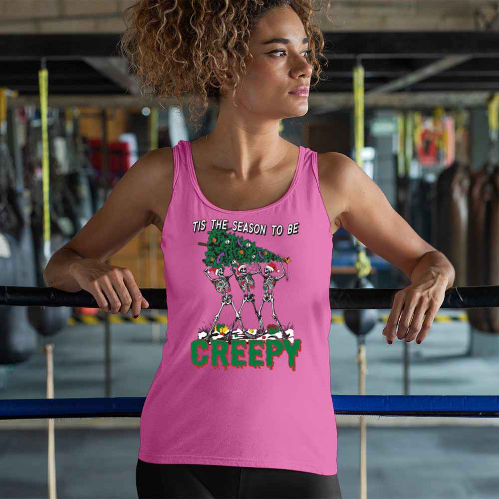 "Tis the Season to Be Creepy" combines holiday cheer with a hauntingly fun twist. This creative design features skeletons donning Santa hats as they carry a spooky Christmas tree decorated with eerie ornaments. Perfect for holiday gatherings, Secret Santa gifts, or themed parties, this design celebrates the festive and the macabre. Embrace the jolliest and creepiest bunch this season with this standout apparel.