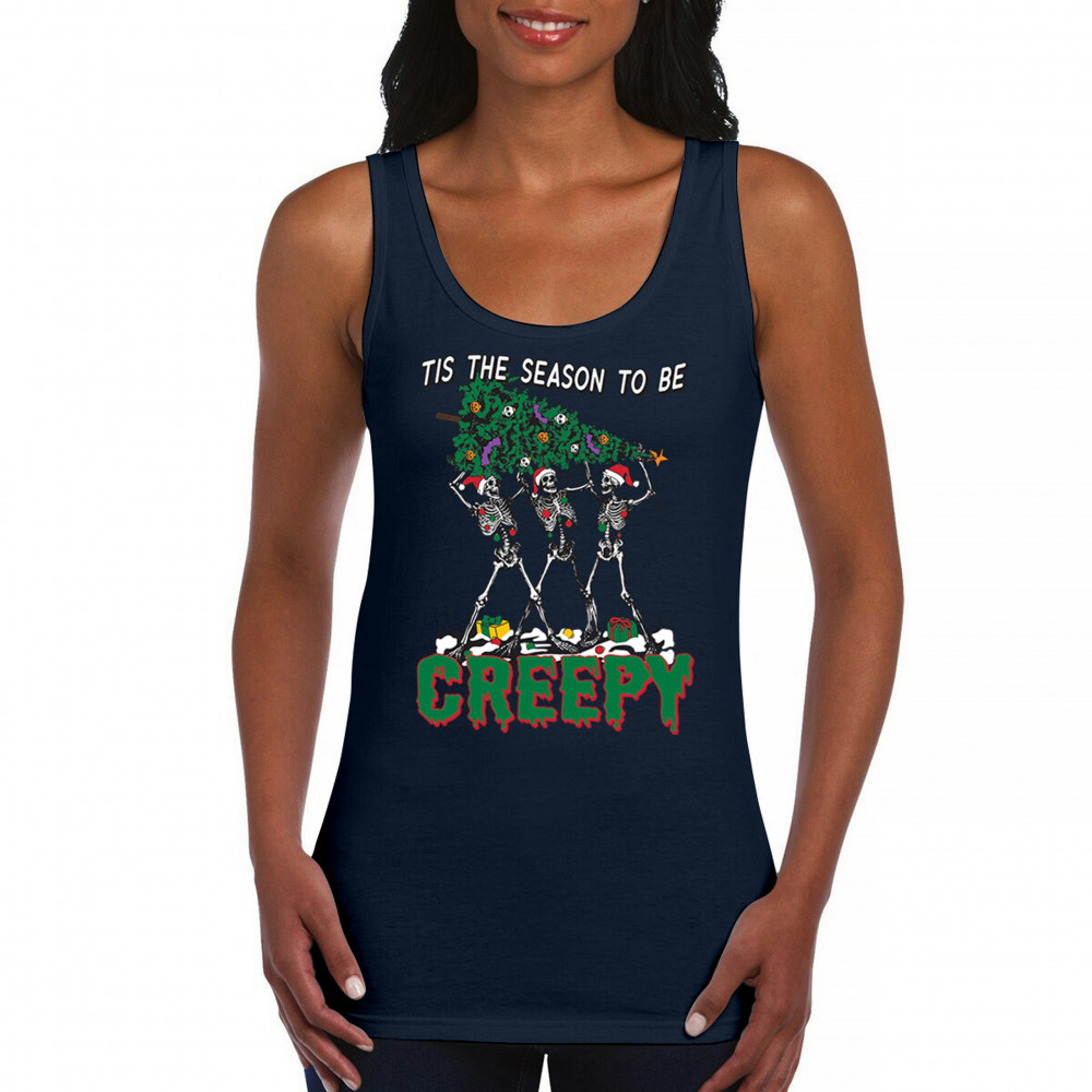 "Tis the Season to Be Creepy" combines holiday cheer with a hauntingly fun twist. This creative design features skeletons donning Santa hats as they carry a spooky Christmas tree decorated with eerie ornaments. Perfect for holiday gatherings, Secret Santa gifts, or themed parties, this design celebrates the festive and the macabre. Embrace the jolliest and creepiest bunch this season with this standout apparel.