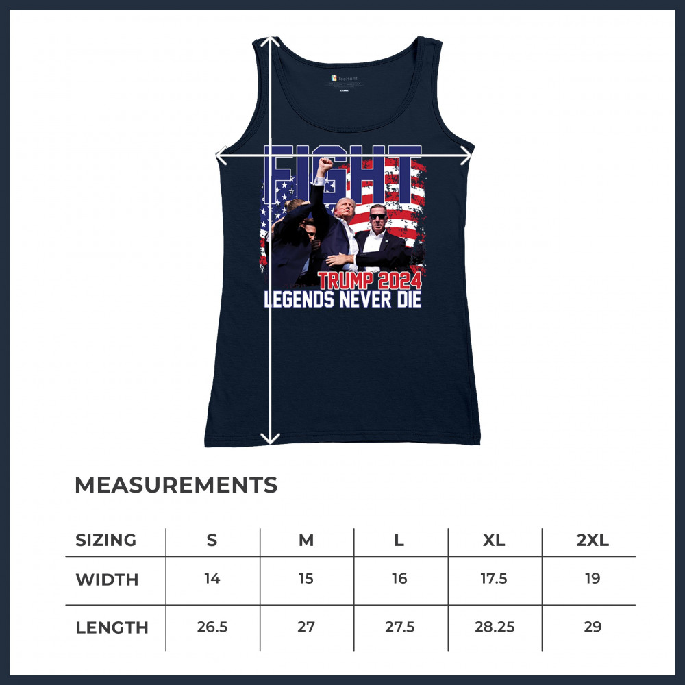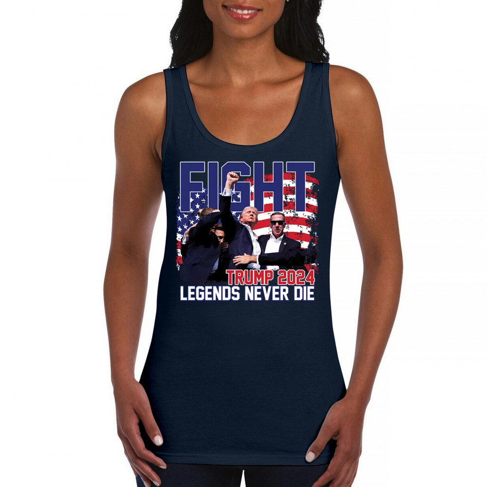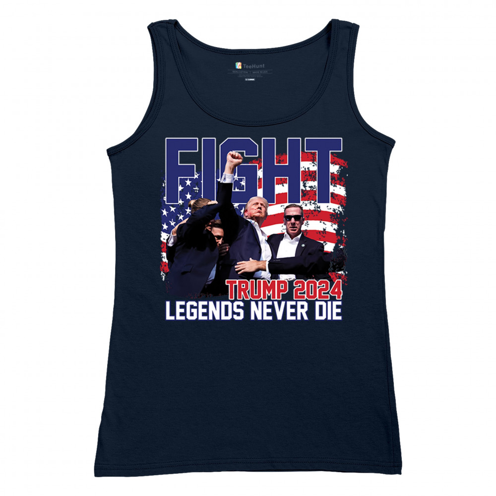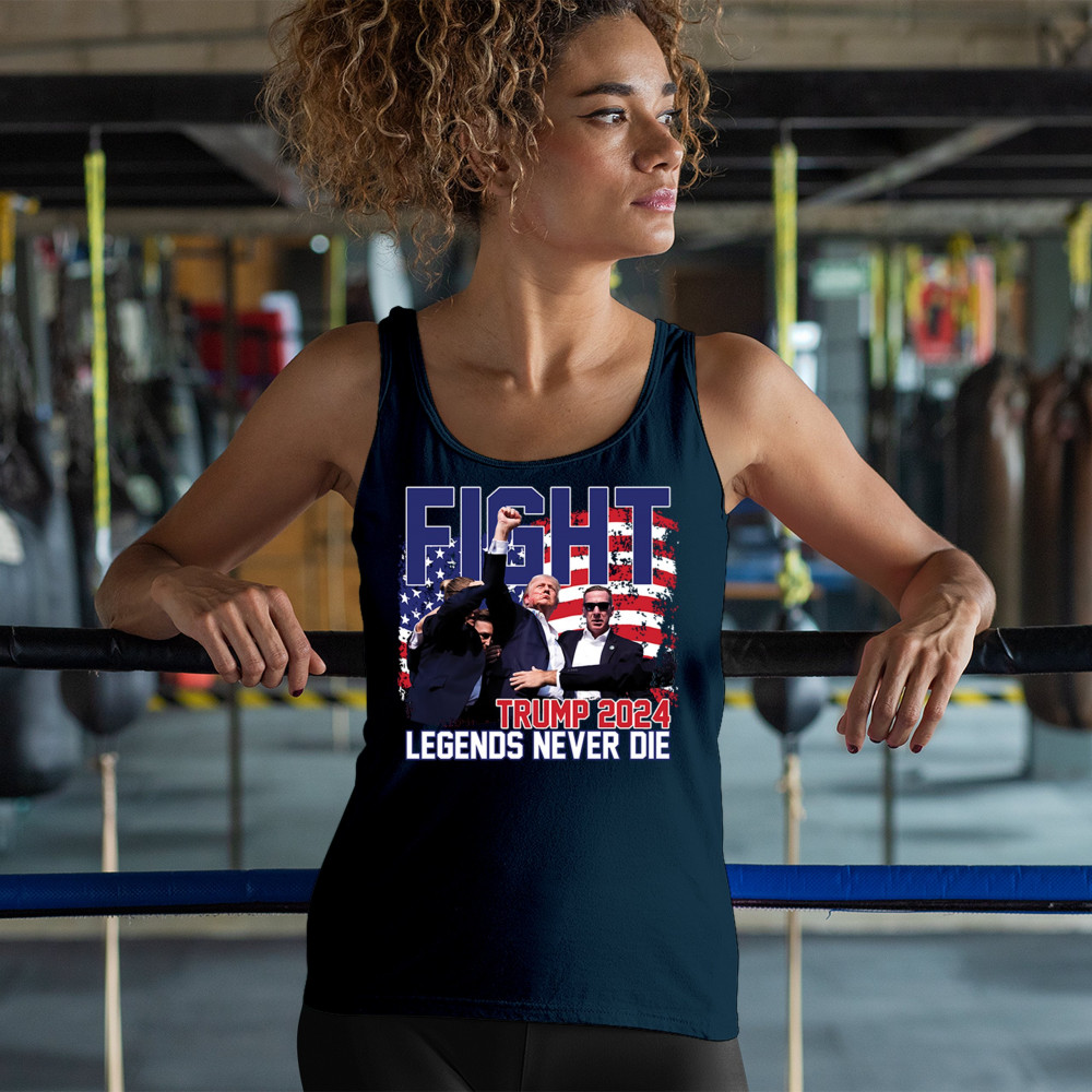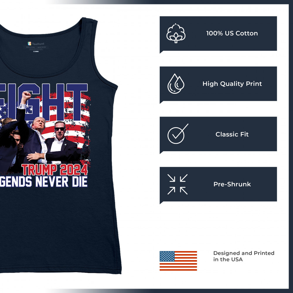 Show your Trump 2024 support with our bold "Fight" design, featuring "Legends Never Die" and a patriotic American flag. Perfect for rallies and everyday wear.