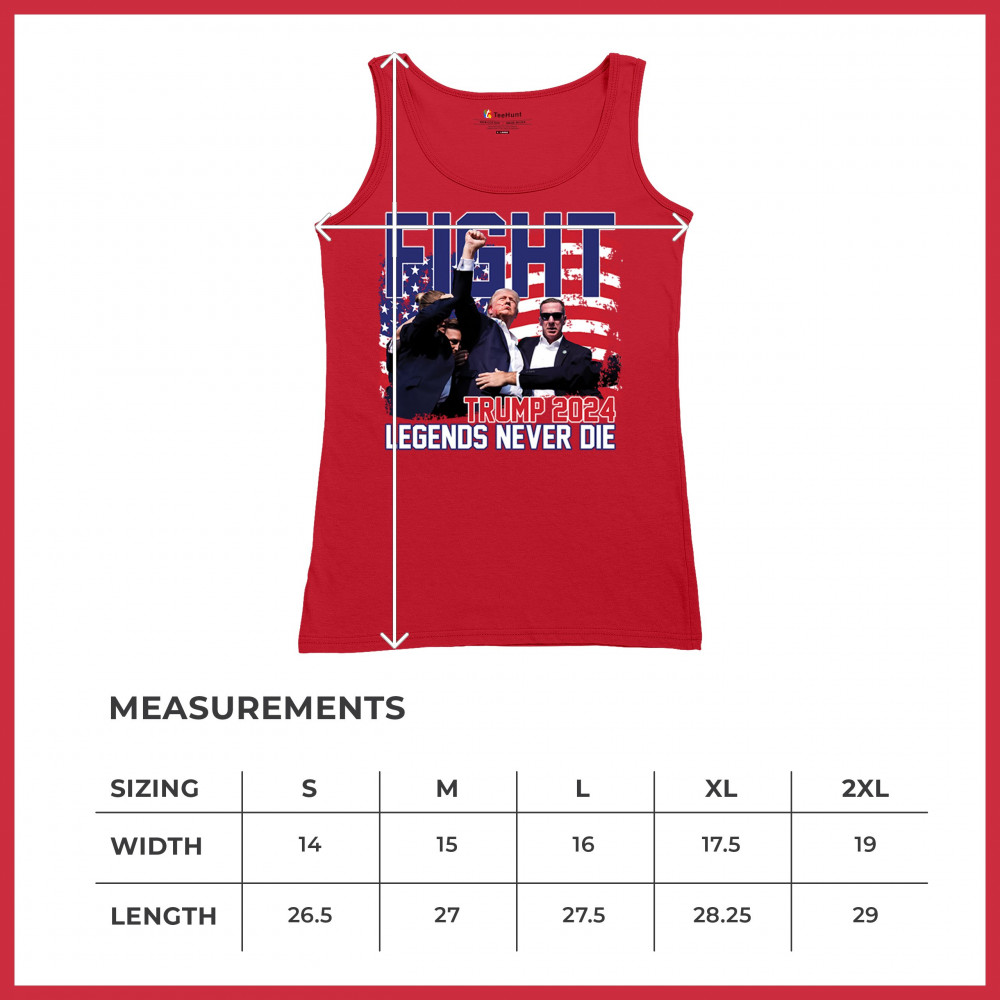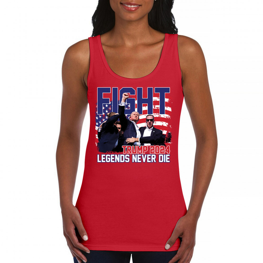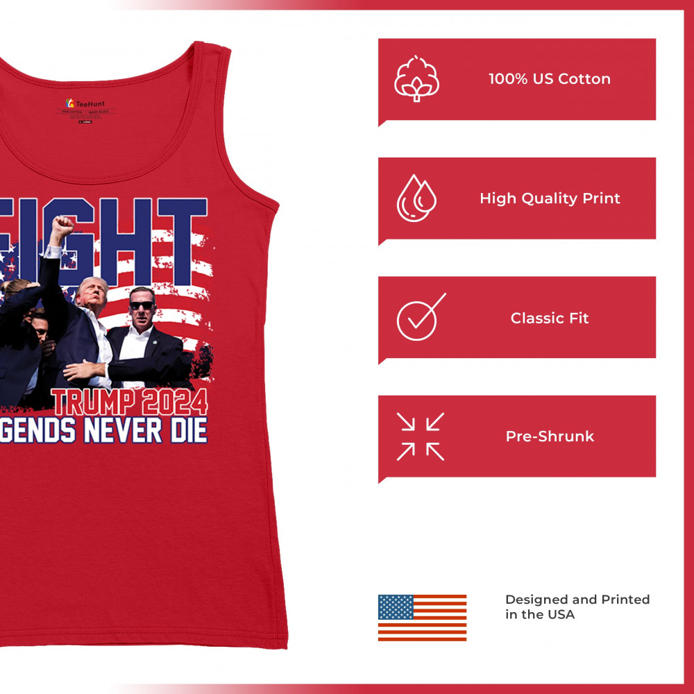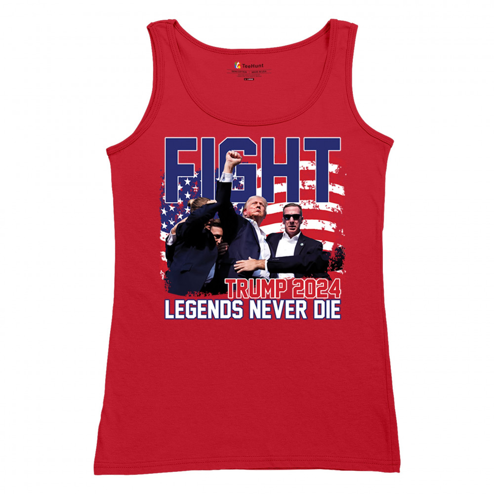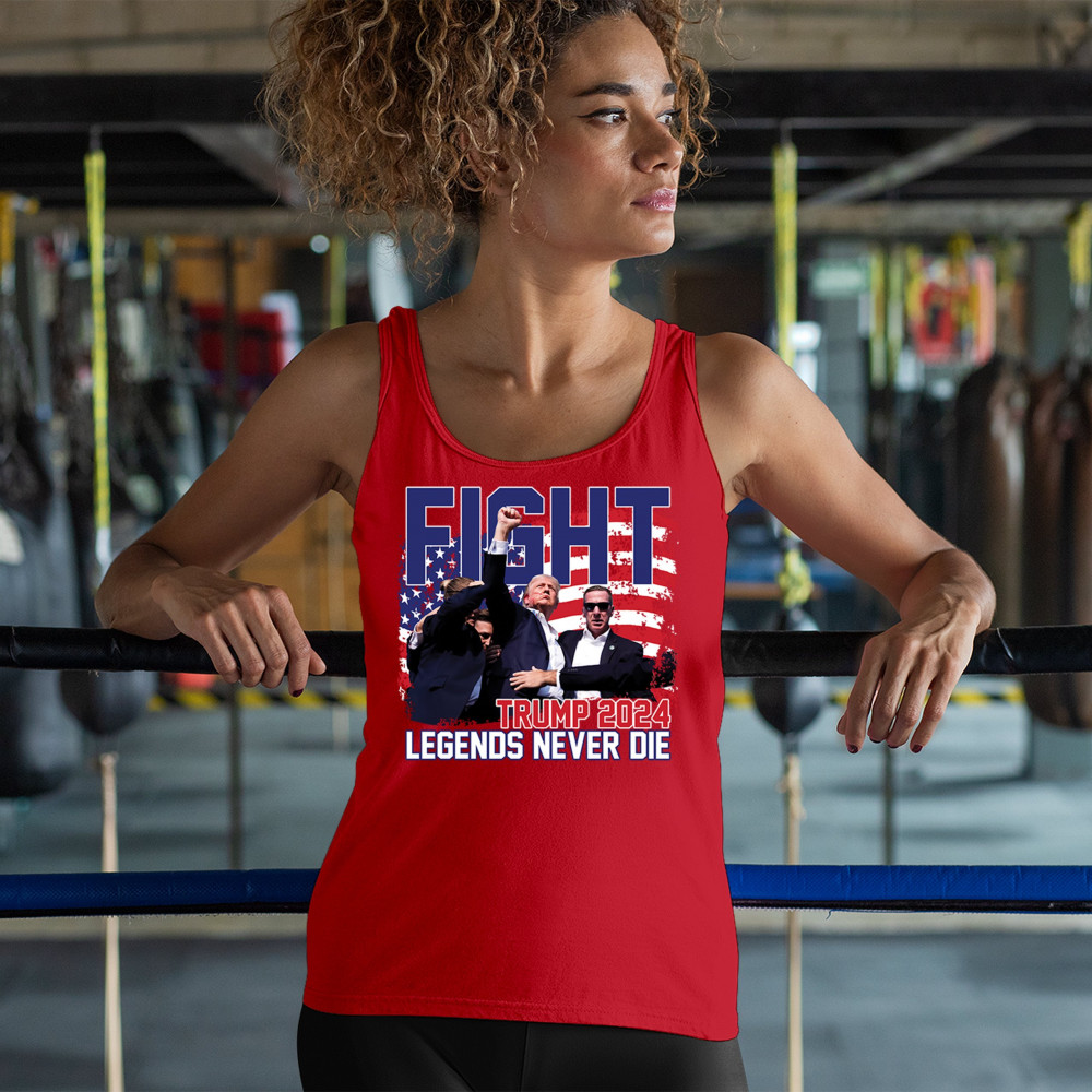 Show your Trump 2024 support with our bold "Fight" design, featuring "Legends Never Die" and a patriotic American flag. Perfect for rallies and everyday wear.