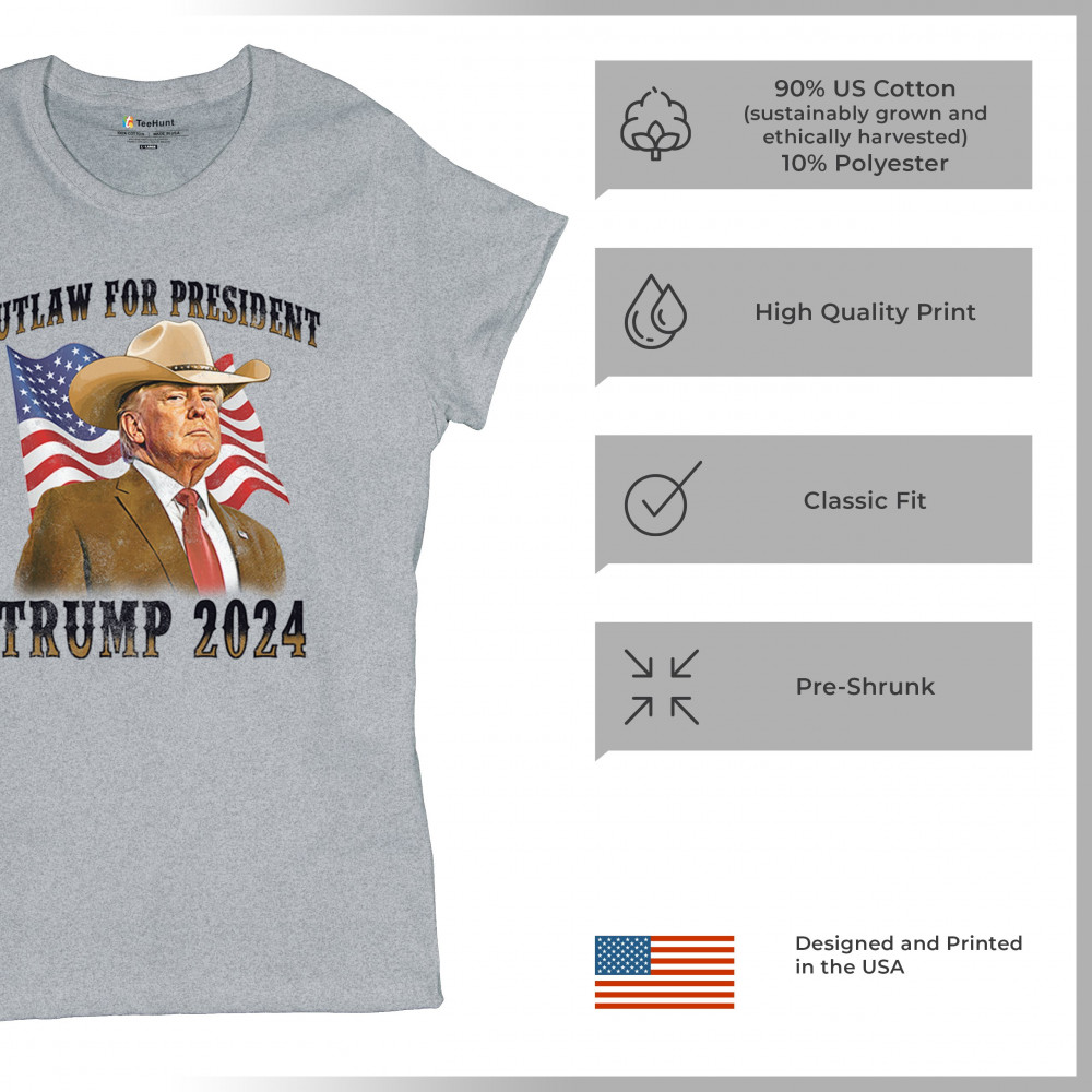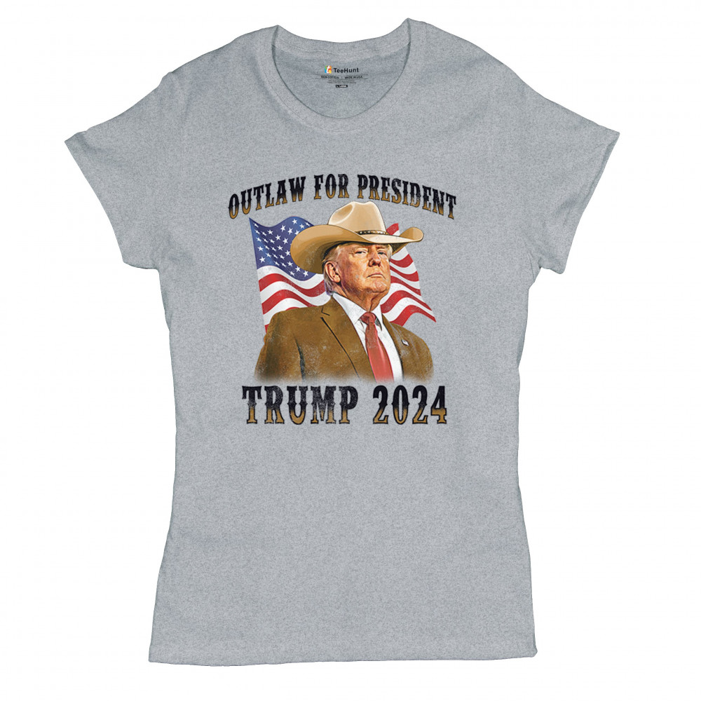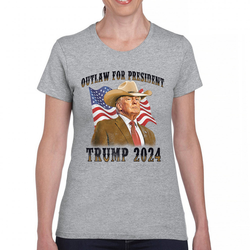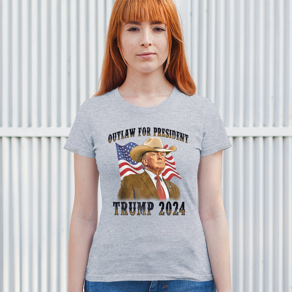 Support Trump with our "Outlaw for President" design. Featuring Trump in a cowboy hat, this piece symbolizes strength amidst political challenges. Join the fight for conservative values!
