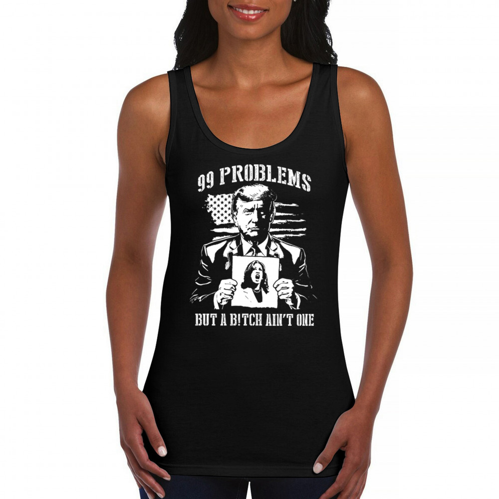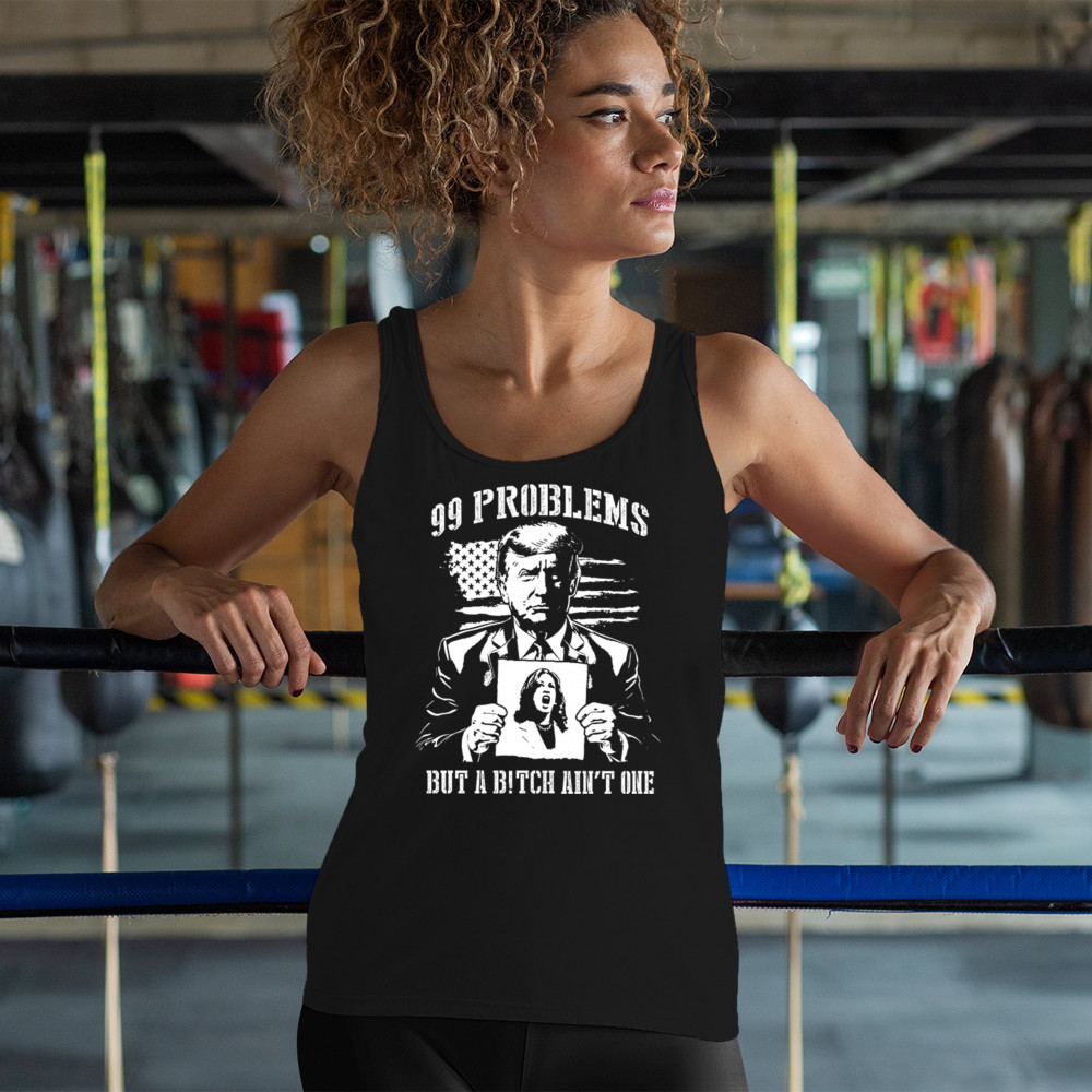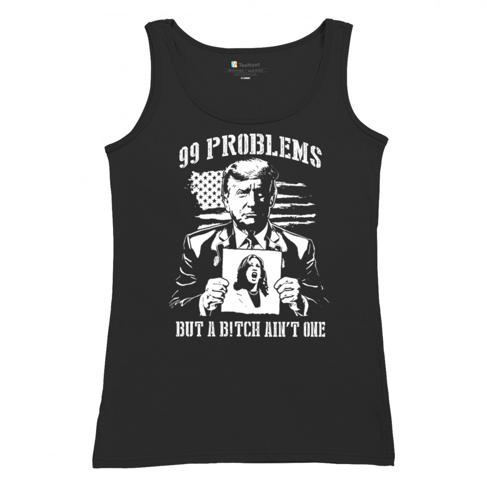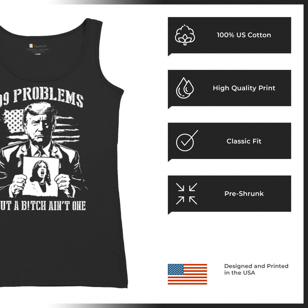 Bold conservative "99 Problems But a B*tch Ain’t One" design featuring Donald J. Trump and an American flag. Perfect for proud Republicans and patriots.
