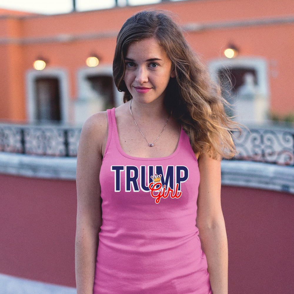 A print saying "Trump Girl" and featuring a small crown over the letter "G". A great choice to wear to a Trump rally or give as a gift to a Donald Trump supporter before 2024 presidential elections.