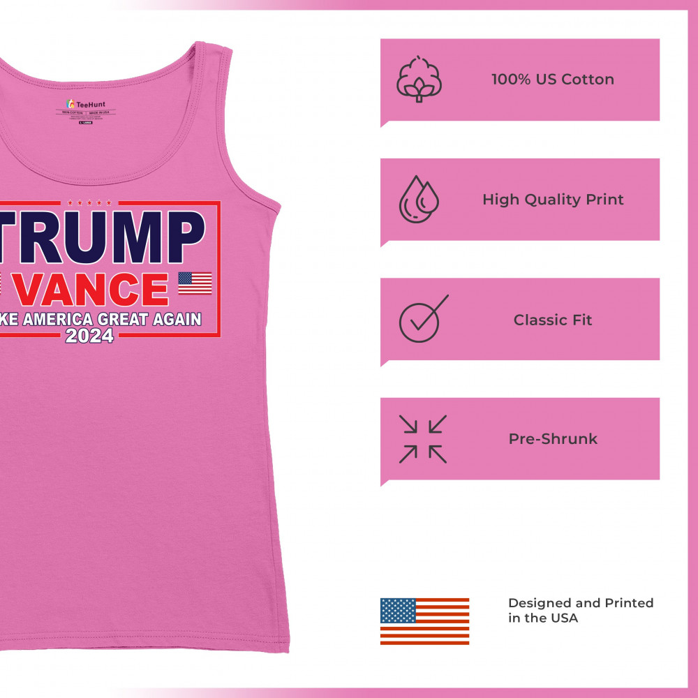 Showcase your support for the Trump-Vance 2024 campaign with this bold patriotic design featuring the American flag and "Make America Great Again" slogan.