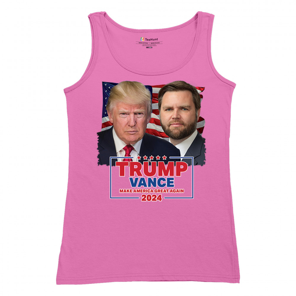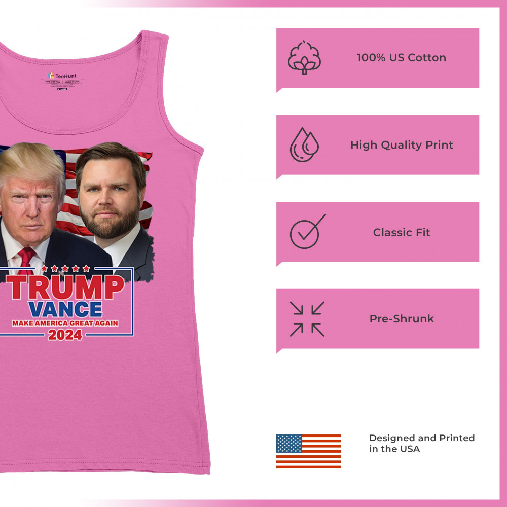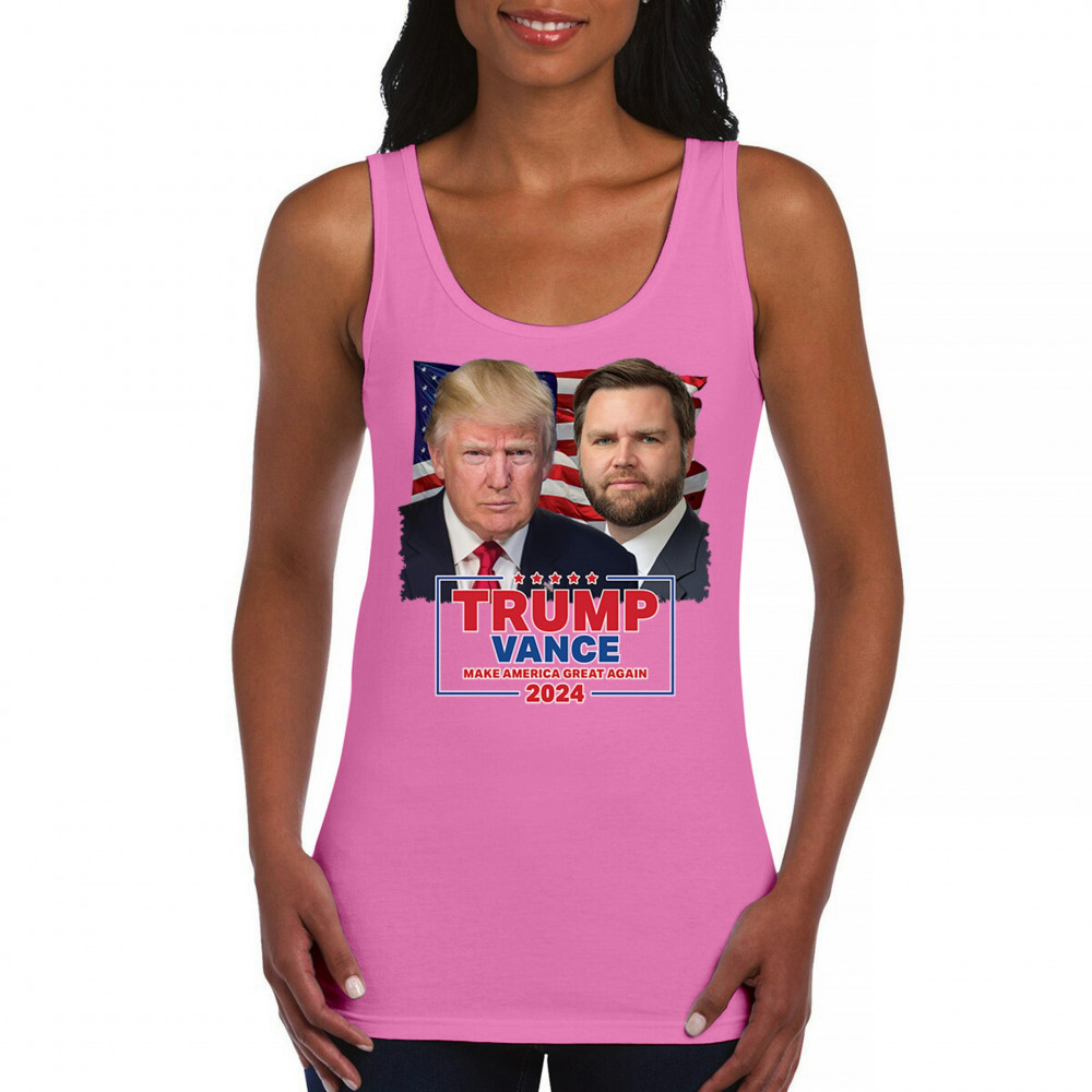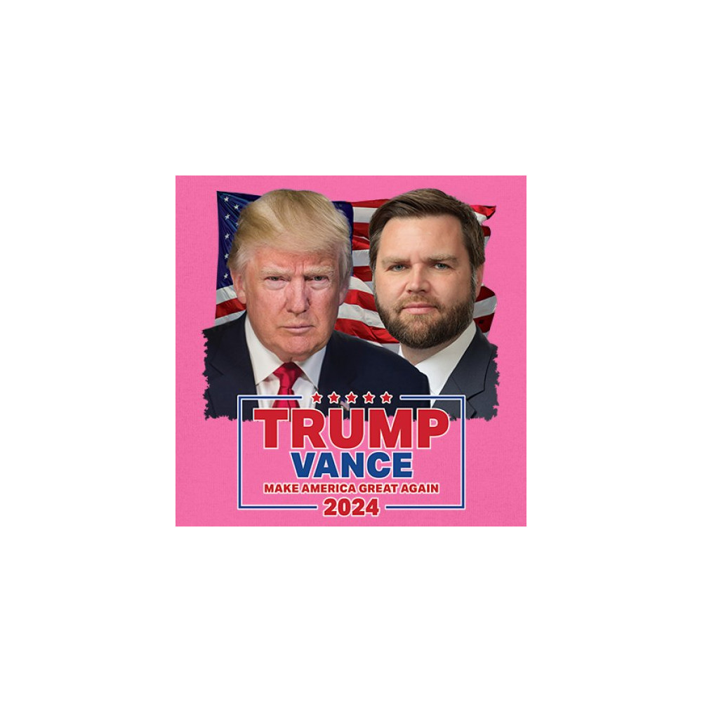 Show your support for Trump-Vance 2024 with this bold design featuring Trump and Vance against the American flag. Perfect for rallies and political events.
