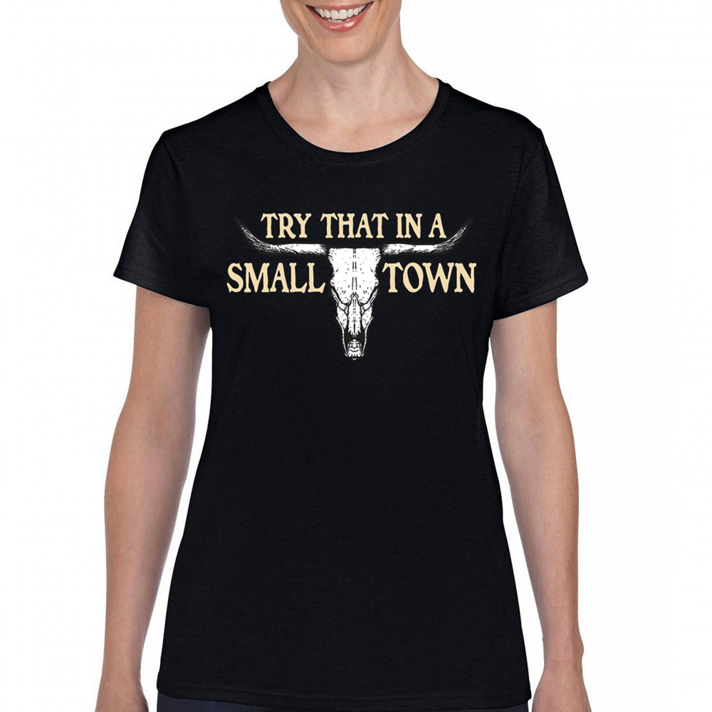 This design boldly proclaims "Try That in a SMALL TOWN," set against the backdrop of a stark cattle skull—a symbol deeply rooted in southern heritage and the undying American spirit. It's a tribute to the small-town sheriffs, the unwritten laws of backbone and duty, and the patriotic fervor that runs through the country's veins. Whether you're a motorcycle enthusiast, a Republican, or simply a connoisseur of all things vintage, this piece is a testament to enduring strength and local pride.