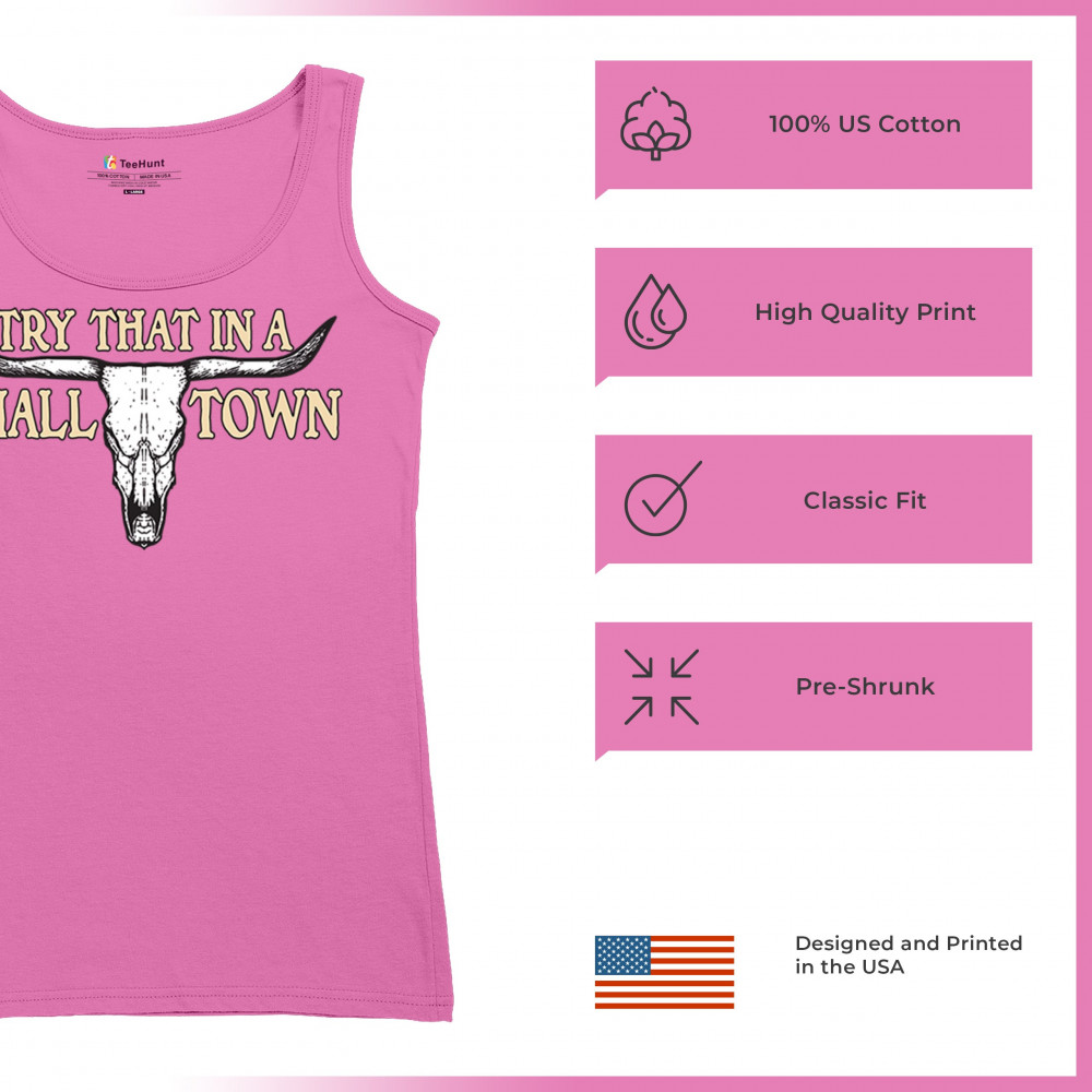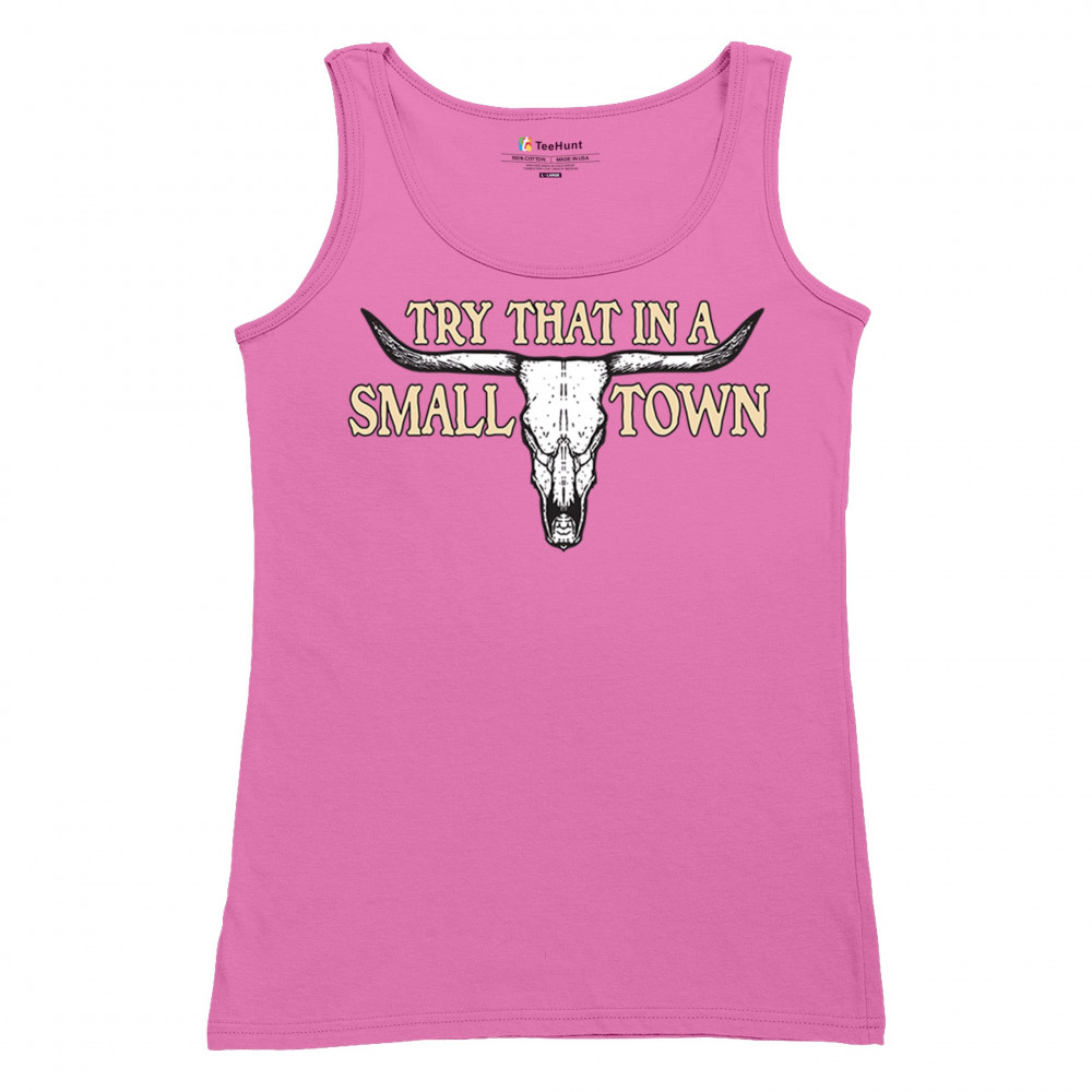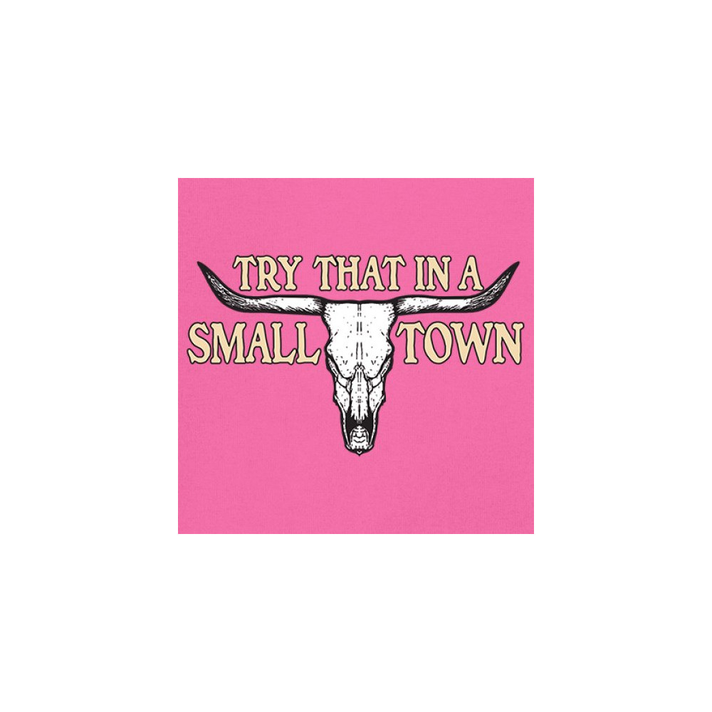This design boldly proclaims "Try That in a SMALL TOWN," set against the backdrop of a stark cattle skull—a symbol deeply rooted in southern heritage and the undying American spirit. It's a tribute to the small-town sheriffs, the unwritten laws of backbone and duty, and the patriotic fervor that runs through the country's veins. Whether you're a motorcycle enthusiast, a Republican, or simply a connoisseur of all things vintage, this piece is a testament to enduring strength and local pride.