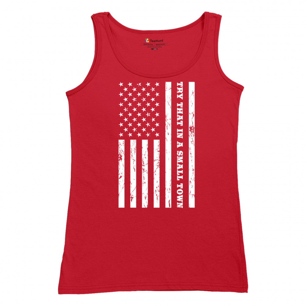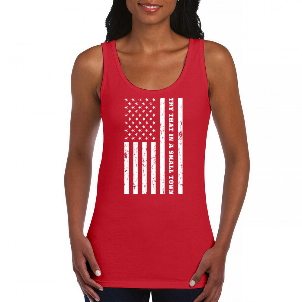TRY THAT IN A SMALL TOWN GRUNGE AMERICAN FLAG women's tank top patriotic red