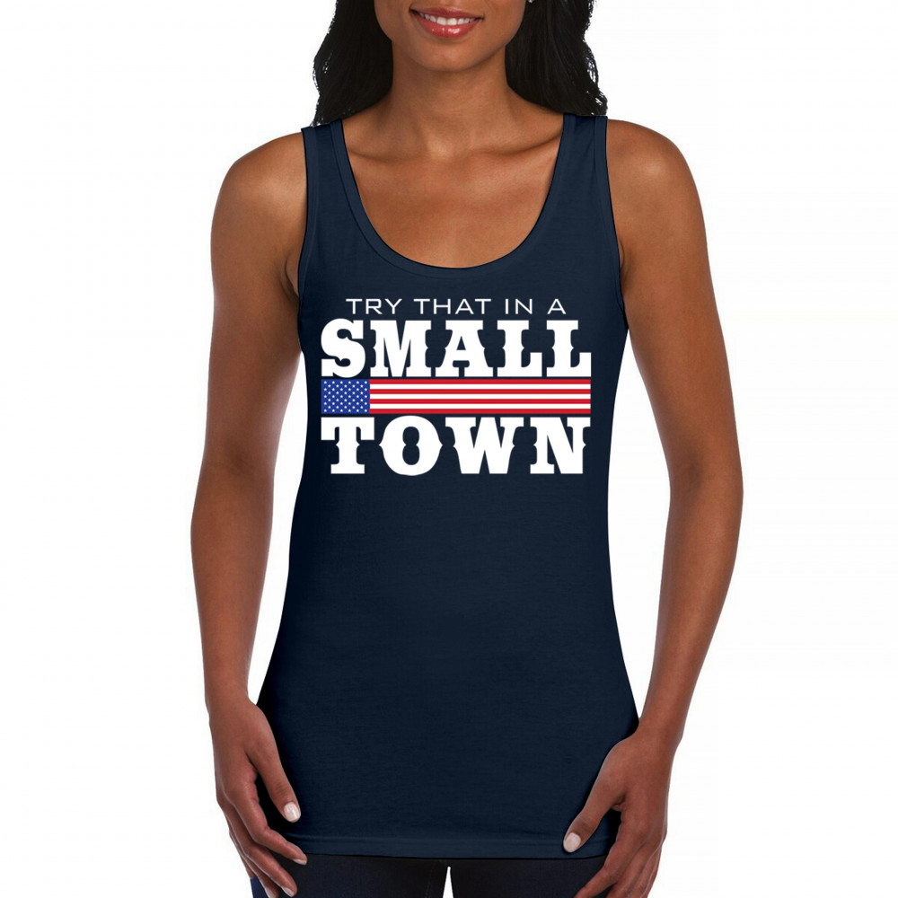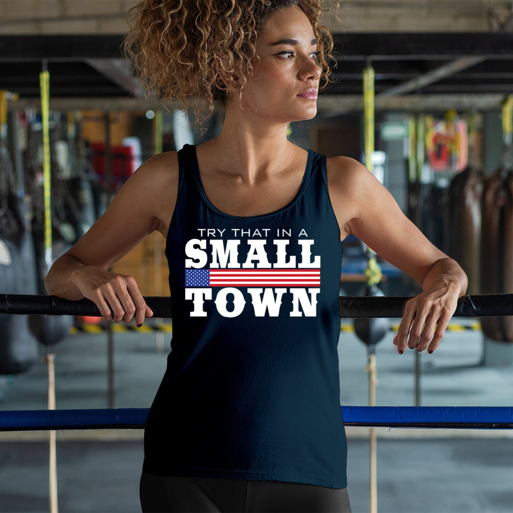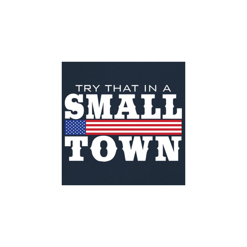 Celebrate small-town pride with our "Try That In A Small Town" design. Perfect for patriotic events, it features a bold American flag graphic.