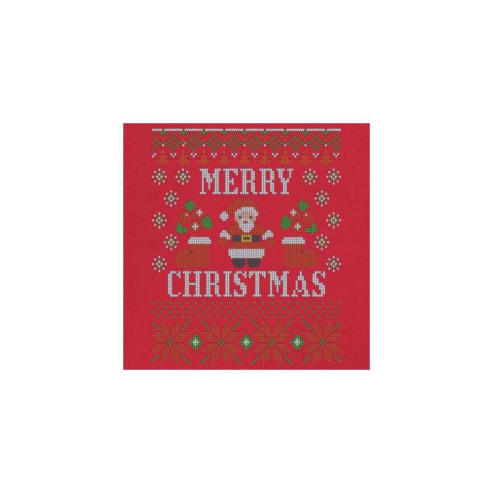 A print saying: "Merry Christmas" and depicting Santa Claus, two Christmas socks, multiple snowflakes and Christmas trees. The print is decorated as an ugly sweater. A great choice for a Christmas eve celebration.