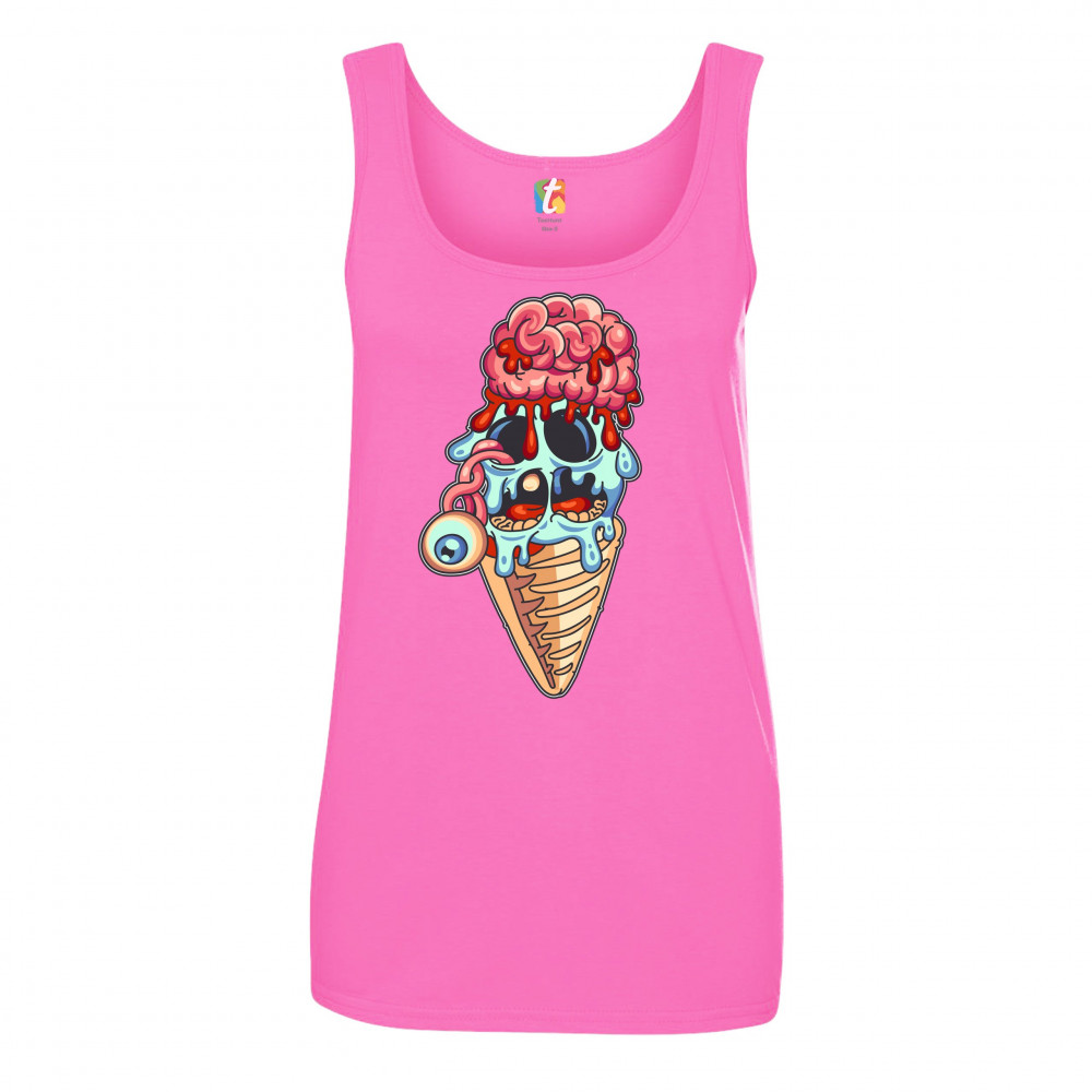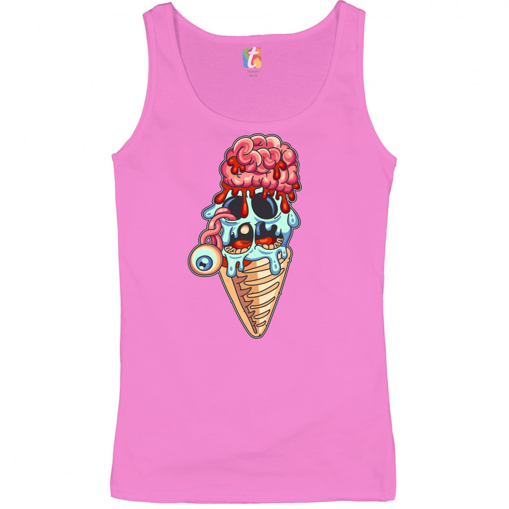 A print featuring an undead ice cream. The ice cream ball looks like a head of a zombie with an eye popping out and hanging and bloodied brains attached on top. A great choice for a person who is into horror movies, haunted houses and freaking people out!